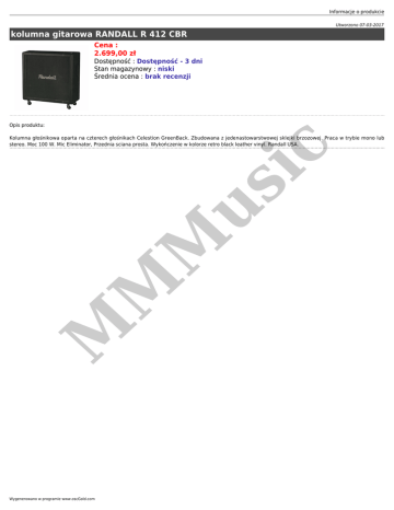 Informacje o produkcie Utworzono 07-03-2017 kolumna gitarowa RANDALL R 412 CBR Cena : 2.699,00 zł Dostępność : Dostępność - 3 dni Stan magazynowy : niski Średnia ocena : brak recenzji Opis produktu: M M M us ic Kolumna głośnikowa oparta na czterech głośnikach Celestion GreenBack. Zbudowana z jedenastowarstwowej sklejki brzozowej. Praca w trybie mono lub stereo. Moc 100 W. Mic Eliminator, Przednia sciana prosta. Wykończenie w kolorze retro black leather vinyl. Randall USA. Wygenerowano w programie www.oscGold.com