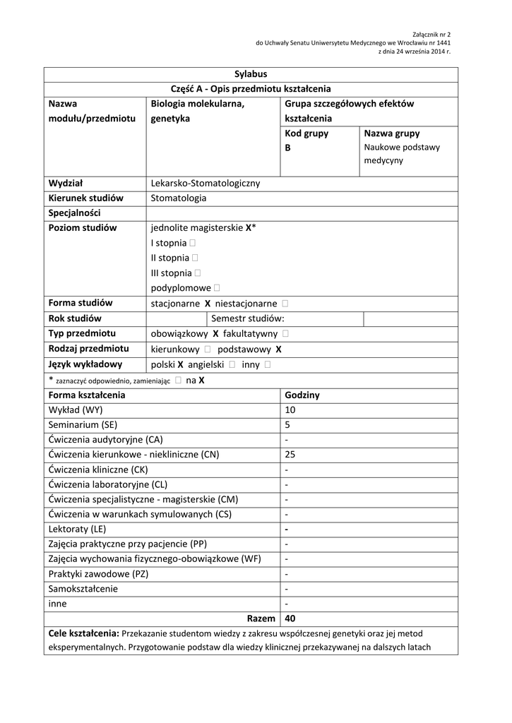 Załącznik nr 2 do Uchwały Senatu Uniwersytetu Medycznego we Wrocławiu nr 1441 z dnia 24 września 2014 r. Nazwa modułu/przedmiotu Sylabus Część A - Opis przedmiotu kształcenia Biologia molekularna, Grupa szczegółowych efektów genetyka kształcenia Kod grupy Nazwa grupy Naukowe podstawy B medycyny Wydział Kierunek studiów Specjalności Poziom studiów Forma studiów Rok studiów Typ przedmiotu Lekarsko-Stomatologiczny Stomatologia jednolite magisterskie X* I stopnia II stopnia III stopnia podyplomowe stacjonarne X niestacjonarne Semestr studiów: obowiązkowy X fakultatywny kierunkowy podstawowy X polski X angielski inny * zaznaczyć odpowiednio, zamieniając na X Forma kształcenia Godziny Wykład (WY) 10 Seminarium (SE) 5 Ćwiczenia audytoryjne (CA) Ćwiczenia kierunkowe - niekliniczne (CN) 25 Ćwiczenia kliniczne (CK) Ćwiczenia laboratoryjne (CL) Ćwiczenia specjalistyczne - magisterskie (CM) Ćwiczenia w warunkach symulowanych (CS) Lektoraty (LE) Zajęcia praktyczne przy pacjencie (PP) Zajęcia wychowania fizycznego-obowiązkowe (WF) Praktyki zawodowe (PZ) Samokształcenie inne Razem 40 Cele kształcenia: Przekazanie studentom wiedzy z zakresu współczesnej genetyki oraz jej metod Rodzaj przedmiotu Język wykładowy eksperymentalnych. Przygotowanie podstaw dla wiedzy klinicznej przekazywanej na dalszych latach studiów dla rozumienia zagadnień z zakresu epidemiologii i patogenezy chorób człowieka, genetyki klinicznej, a także farmakologii i diagnostyki medycznej. Wykształcenie studentów w zakresie podstaw parazytologii lekarskiej. Macierz efektów kształcenia dla modułu/przedmiotu w odniesieniu do metod weryfikacji zamierzonych efektów kształcenia oraz formy realizacji zajęć: Numer efektu kształcenia przedmiotowego Numer efektu kształcenia kierunkowego W 01 B.W14 W 02 B.W15 W 03 B.W17 W 04 B.W18 B.W19 W 05 B.W16 W 06 B.W16 W 07 B.W16 U 01 B.U4 U 02 B.U5 U 03 B.U5 Student, który zaliczy moduł/przedmiot wie/umie/potrafi definiuje podstawowe pojęcia w zakresie genetyki określa czynniki genetyczne i środowiskowe mające znaczenie w warunkowaniu cech człowieka objaśnia podstawowe procesy ekspresji i regulacji genów określa wpływ zanieczyszczenia środowiska czynnikami mutagennymi i kancerogennymi na organizm człowieka i opisuje fenotypowe skutki mutagenezy – (wybrane choroby genetyczne człowieka) i mechanizmy ich dziedziczenia opisuje biologię i morfologię pasożytów człowieka (pierwotniaki, płazińce, obleńce) opisuje epidemiologię i sposoby profilaktyki zarażeń pasożytniczych zna podstawowe zasady diagnostyki pasożytów człowieka znajduje relacje pomiędzy zanieczyszczeniem środowiska, czynnikami mutagennymi oraz kancerogennymi i procesami patologicznymi zachodzącymi w organizmie człowieka stosuje metody diagnostyki i działań leczniczych w powiązaniu z metodami genetyki i biologii molekularnej analizuje krzyżówki genetyczne i rodowody jako podstawę poradnictwa genetycznego Metody weryfikacji osiągnięcia zamierzonych efektów kształcenia (formujące i podsumowujące) Forma zajęć dydaktycznych ** wpisz symbol sprawdzian pisemny, egzamin testowy sprawdzian pisemny, egzamin testowy WY, SE sprawdzian pisemny, egzamin testowy sprawdzian pisemny, egzamin testowy WY, SE sprawdzian pisemny CA sprawdzian pisemny CA sprawdzian pisemny CA sprawdzian pisemny CA sprawdzian pisemny CA sprawdzian pisemny CA WY, SE WY, SE U 04 B.U5 U 05 B.U4 U 06 B.U5 K 01 K 02 K 03 posługuje się mikroskopem optycznym rozpoznaje inwazyjne dla człowieka formy/stadia rozwojowe wybranych pasożytów rozpoznaje podstawowe objawy chorobowe wywoływane przez pasożyty i stosuje w codziennym życiu zasady sanitarno-higieniczne w celu profilaktyki zarażeń pasożytami chętnie poszerza wiedzę i umiejętności współpracuje w grupie w celu rozwiązania zadanych ćwiczeń wyszukuje materiały do zajęć i krytycznie ocenia źródła informacji ćwiczenia praktyczne CA sprawdzian pisemny CA sprawdzian pisemny CA ** WY - wykład; SE - seminarium; CA - ćwiczenia audytoryjne; CN - ćwiczenia kierunkowe (niekliniczne); CK - ćwiczenia kliniczne; CL -ćwiczenia laboratoryjne; CM – ćwiczenia specjalistyczne (mgr); CS - ćwiczenia w warunkach symulowanych; LE - lektoraty; zajęcia praktyczne przy pacjencie - PP; WF - zajęcia wychowania fizycznego (obowiązkowe); PZ- praktyki zawodowe; SK samokształcenie Proszę oznaczyć krzyżykami w skali 1-3 jak powyższe efekty lokują państwa zajęcia w działach: przekaz wiedzy, umiejętności czy kształtowanie postaw np.: Wiedza + + + Umiejętności + + Postawy + Nakład pracy studenta (bilans punktów ECTS): Forma nakładu pracy studenta Obciążenie studenta (h) (udział w zajęciach, aktywność, przygotowanie sprawdzenie, itp.) 40 1. Godziny kontaktowe 2. Czas pracy własnej studenta 15 Sumaryczne obciążenie pracy studenta 55 Punkty ECTS za moduł/przedmiotu 6 Uwagi Treść zajęć: (proszę wpisać hasłowo tematykę poszczególnych zajęć z podziałem na formę zajęć dydaktycznych, pamiętając, aby przekładała się ona na zamierzone efekty kształcenia) Wykłady 1. Struktura materiału genetycznego (DNA, RNA), struktury podwójnej helisy. Replikacja u Procaryota i Eucaryota. Transkrypcja i translacja u Procaryota i Eucaryota. 2. Ekspresja genów i jej regulacja. 3. Organizacja genomu człowieka, genom mitochondrialny. 4. Zmienność DNA, mutacje, mechanizmy naprawy DNA. Czynniki mutagenne, wpływ leków, związków chemicznych, czynników fizycznych, zanieczyszczenia środowiska. 5. Podstawowe metody biologii molekularnej i ich zastosowanie. Seminaria 1. Biosynteza białka. Teoria operonu. 2. Mechanizm tworzenia się mutacji genowych, chromosomowych strukturalnych i liczbowych. 3. Wybrane choroby dziedziczące się autosomalnie i sprzężone z chromosomem X. Ćwiczenia 1. Pierwotniaki układu pokarmowego i moczowo-płciowego. 2. Pierwotniaki tkanek. 3. Przywry i tasiemce pasożytujące w układzie poka