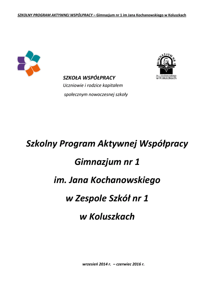 SZKOLNY PROGRAM AKTYWNEJ WSPÓLPRACY – Gimnazjum nr 1 im Jana Kochanowskiego w Koluszkach SZKOŁA WSPÓŁPRACY Uczniowie i rodzice kapitałem społecznym nowoczesnej szkoły Szkolny Program Aktywnej Współpracy Gimnazjum nr 1 im. Jana Kochanowskiego w Zespole Szkół nr 1 w Koluszkach wrzesień 2014 r. – czerwiec 2016 r. SZKOLNY PROGRAM AKTYWNEJ WSPÓLPRACY – Gimnazjum nr 1 im Jana Kochanowskiego w Koluszkach I. Wstęp: Współczesna szkoła, jeśli chce sprostać stawianym jej wyzwaniom, musi nadążać za wciąż zmieniającą się rzeczywistością, wdrażać nowoczesne metody, aktualne treści, reagować na problemy i wydarzenia istotne dla społeczności lokalnej, ale przede wszystkim być otwarta na współpracę, być szkołą współpracy. Przystępując do programu, mamy nadzieję, że jego realizacja przyczyni się do poszerzenia przestrzeni współpracy między nauczycielami, rodzicami i uczniami, wzmocni demokratyczną kulturę szkoły, wpłynie na tworzenie nowej jakości życia szkolnego, opartej na wspólnych wartościach i przestrzeganiu przyjętych norm. Chcielibyśmy, aby doświadczenie współpracy było dla wszystkich ubogacające, atrakcyjne i zrozumiałe. Aby wszyscy mieli poczucie sensu podejmowanych wspólnie działań i by stały się one także inicjatywą służącą rozwojowi środowiska lokalnego. II. Skład zespołu RUN 1. Małgorzata Szyszka – Nowak – rodzic 2. Magdalena Marczyk – rodzic 3. Mateusz Sikorski – uczeń 4. Małgorzata Marczyk – uczeń 5. Danuta Pecyna – z-ca dyrektora Gimnazjum nr 1 w Koluszkach 6. Ilona Dziedziczak – nauczyciel 7. Emilia Felkiewicz – pedagog szkolny SZKOLNY PROGRAM AKTYWNEJ WSPÓLPRACY – Gimnazjum nr 1 im Jana Kochanowskiego w Koluszkach III. Cele Szkolnego Programu Aktywnej Współpracy: Cel strategiczny: W szkole funkcjonuje model współpracy wszystkich grup społeczności Gimnazjum nr 1, umożliwiający aktywny udział uczniów, rodziców i nauczycieli w planowaniu i realizacji działań. Cele operacyjne: 1. Kontynuowanie „dobrych praktyk” z zakresu współpracy rodziców uczniów i nauczycieli (m.in. zajęcia i wycieczki zawodoznawcze, zaangażowanie rodziców w organizację konkursów szkolnych, konsultacje z rodzicami, organizacja warsztatów mających na celu pedagogizację rodziców). 2. Poznawanie oczekiwań i potrzeb RUN w stosunku co do siebie (poprzez debaty, ankiety itp.). 3. Zwiększenie zaangażowania rodziców w życie szkoły poprzez aktywne uczestnictwo w realizacji i organizacji imprez, uroczystości szkolnych itp. 4. Korzystanie z zasobów rodziców np. ich wiedzy z zakresu wykonywanych zawodów, umiejętności itp. 5. Zwiększenie współodpowiedzialności rodziców za proces kształcenia dzieci np. poprzez uczestnictwo w opracowaniu m.in. koncepcji pracy szkoły. 6. Budowanie dobrego klimatu szkoły poprzez min. motywowanie uczniów do nauki, budowanie tolerancji, kształtowanie pozytywnych wzorców zachowań. SZKOLNY PROGRAM AKTYWNEJ WSPÓLPRACY – Gimnazjum nr 1 im Jana Kochanowskiego w Koluszkach IV. Zasady współpracy między poszczególnymi grupami społeczności szkolnej 1. Zasada wielostronnej komunikacji, dbanie o przepływ informacji między rodzicami uczniami i nauczycielami: - informacje ze spotkań zespołu RUN są upubliczniane na stronie www. szkoły oraz w dzienniku elektronicznym - uczniowie i rodzice mają możliwość przekazywania informacji i uwag poprzez swoich przedstawicieli lub wykorzystując adres mailowy i numer telefonu - podczas zebrań z rodzicami - podczas posiedzeń Rady Pedagogicznej 2. Zasada partnerstwa – konsultowanie różnych spraw dotyczących szkoły, współdecydowanie w sprawach związanych z przestrzenią szkoły. 3. Zasada aktywnej i systematycznej współpracy: - członkowie zespołu RUN spotykają się 2 razy w semestrze - co najmniej raz w semestrze przedstawiciele Rady Samorządu Uczniowskiego spotykają się z dyrekcją szkoły - co najmniej raz w semestrze przedstawiciele Rady Samorządu Uczniowskiego spotykają się z nauczycielami podczas zebrania Rady Pedagogicznej - co najmniej raz w semestrze odbywa się spotkanie szkolnego zespołu ds. wychowawczych - co najmniej raz w semestrze przedstawiciele Rady Rodziców spotykają się z członkami Rady Samorządu Uczniowskiego - co najmniej dwa razy w semestrze przedstawiciele Rady Rodziców spotykają się z dyrekcją szkoły. 4. Zasada pozytywnej motywacji - staramy się zaangażować jak największą liczbę uczniów, rodziców i nauczycieli do współpracy i wspólnych działań. 5. Zasada otwartości i szacunku - szanujemy zdanie, opinie i wątpliwości wyrażane przez inne grupy i umożliwiamy ich wyrażanie SZKOLNY PROGRAM AKTYWNEJ WSPÓLPRACY – Gimnazjum nr 1 im Jana Kochanowskiego w Koluszkach 6. Zasada decydowania we wspólnych sprawach - w zależności od istoty zadania, szkoła posiada różne sposoby podejmowania decyzji, od głosowania poprzez konsultacje aż po współdecydowanie. V. Obszary współpracy Obszar 1. Organizacja pracy szkoły Obszar 2. Dydaktyka i wychowanie Obszar 3. Organizacja przestrzeni w szkole sprzyjającej współpracy I. Działania planowane w ramach SPAW-u Obszar 1. Organizacja pracy szkoły Działanie Opracowanie koncepcji pracy szkoły Opis - Ustalenie harmonogramu spotkań dot. opracowania koncepcji pracy szkoły (spotkania SU, nauczycieli i rodziców) - Podczas rady pedagogicznej nauczyciele podzieleni na grupy pracują (metoda „wirujących plakatów”) nad obszarami, które mają znaleźć się w koncepcji pracy szkoły - Podczas spotkania SU, uczniowie w Termin Październik 2014 SZKOLNY PROGRAM AKTYWNEJ WSPÓLPRACY – Gimnazjum nr 1 im Jana Kochanowskiego w Koluszkach takiej samej formie jak nauczyciele podają swoje propozycje dla każdego obszaru/ W każdej grupie uczniów jest przedstawiciel klasy pierwszej, drugiej i trzeciej. - Skonsultowanie oraz zebranie propozycji dot. koncepcji pracy szkoły od rodziców podczas zebra