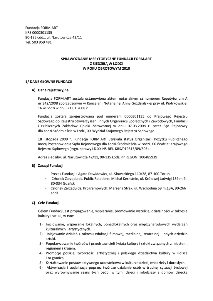 Fundacja FORM.ART KRS 0000301135 90-135 Łódź, ul. Narutowicza 42/11 Tel. 503 959 481 SPRAWOZDANIE MERYTORYCZNE FUNDACJI FORM.ART Z SIEDZIBĄ W ŁODZI W ROKU OBROTOWYM 2010 1/ DANE GŁÓWNE FUNDACJI A) Dane rejestracyjne Fundacja FORM.ART została ustanowiona aktem notarialnym za numerem Repetytorium A nr 342/2008 sporządzonym w Kancelarii Notarialnej Anny Goździalskiej przy ul. Piotrkowskiej 16 w Łodzi w dniu 21.01.2008 r. Fundacja została zarejestrowana pod numerem 0000301135 do Krajowego Rejestru Sądowego do Rejestru Stowarzyszeo, Innych Organizacji Społecznych i Zawodowych, Fundacji i Publicznych Zakładów Opieki Zdrowotnej w dniu 07.03.2008 r. przez Sąd Rejonowy dla Łodzi-Śródmieścia w Łodzi, XX Wydział Krajowego Rejestru Sądowego. 18 listopada 2009 r. Fundacja FORM.ART uzyskała status Organizacji Pożytku Publicznego mocą Postanowienia Sądu Rejonowego dla Łodzi-Śródmieścia w Łodzi, XX Wydział Krajowego Rejestru Sądowego (sygn. sprawy LD.XX NS-REJ. KRS/019615/09/605). Adres siedziby: ul. Narutowicza 42/11, 90-135 Łódź, nr REGON: 100485939 B) Zarząd Fundacji - Prezes Fundacji : Agata Dawidowicz, ul. Słowackiego 110/28, 87-100 Toruo - Członek Zarządu ds. Public Relations: Michał Kernstein, ul. Królowej Jadwigi 139 m.9, 80-034 Gdaosk - Członek Zarządu ds. Programowych: Marzena Strąk, ul. Wschodnia 69 m.13A, 90-266 Łódź. C) Cele Fundacji Celem Fundacji jest propagowanie, wspieranie, promowanie wszelkiej działalności w zakresie kultury i sztuki, w tym: 1) Inicjowanie, wspieranie lokalnych, ponadlokalnych oraz międzynarodowych wydarzeo kulturalnych i artystycznych. 2) Inicjowanie działao z zakresu edukacji filmowej, medialnej, teatralnej i innych dziedzin sztuki. 3) Popularyzowanie twórców i przedstawicieli świata kultury i sztuki związanych z miastem, regionem i krajem. 4) Promocje polskiej twórczości artystycznej i polskiego dziedzictwa kultury w Polsce i za granicą. 5) Kształtowanie postaw aktywnego uczestnictwa w kulturze dzieci, młodzieży i dorosłych. 6) Aktywizacja i socjalizacja poprzez twórcze działanie osób w trudnej sytuacji życiowej oraz wyrównywanie szans tych osób, w tym: dzieci i młodzieży z domów dziecka i świetlic środowiskowych, przedstawicieli małych, lokalnych społeczności wiejskich i miejskich. 7) Działania na rzecz integracji europejskiej, dialogu międzykulturowego oraz rozwijania kontaktów i współpracy między społeczeostwami. 8) Pomoc donatorom w realizacji ich szlachetnych, filantropijnych celów. 2/ ZASADY, FORMY I ZAKRES DZIAŁALNOŚCI STATUTOWEJ Z PODANIEM REALIZACJI CELÓW STATUTOWYCH ORAZ OPIS GŁÓWNYCH ZDARZEO PRAWNYCH W JEJ DZIAŁALNOŚCI O SKUTKACH FINANSOWYCH. A) Fundacja realizuje cele poprzez: 1. Organizowanie i wspieranie imprez kulturalnych i działao artystycznych, w tym: festiwali, koncertów, spektakli teatralnych, projekcji filmowych, wystaw, pokazów, sympozjów, zjazdów, konferencji naukowych, szkoleo, warsztatów oraz wszelkich innych form promocji i realizacji poszczególnych dyscyplin sztuki. 2. Wspieranie działao twórców amatorskich, niezależnych i zawodowych w dziedzinach takich jak: sztuki audiowizualne, taniec, teatr, fotografia, sztuki piękne, literatura, muzyka. 3. Tworzenie programów edukacyjnych dla dzieci, młodzieży i dorosłych. 4. Współpracę z władzami samorządowymi, rządowymi, innymi instytucjami i organizacjami pozarządowymi w Polsce i za granicą w zakresie wymienionym w celach Fundacji. 5. Wspieranie i organizowanie kampanii reklamowych na rzecz kultury. 6. Prowadzenie działalności wydawniczej celem popularyzacji kultury i jej twórców. 7. Organizowanie i wspieranie międzynarodowej współpracy kulturalnej pomiędzy twórcami, uczestnikami życia kulturalnego oraz instytucjami kulturalnymi. 8. Uczestnictwo w krajowych i zagranicznych imprezach promujących kulturę i sztukę, np. w targach sztuki, warsztatach, festiwalach, sympozjach oraz innych imprezach organizowanych dla celów społecznie użytecznych związanych ze sztuką oraz ochroną dóbr kultury. 9. Pozyskiwanie i gromadzenie środków finansowych, środków materialnych i niematerialnych dla realizacji celów statutowych. 10. Inne działania realizujące cele statutowe. B) Opis głównych zdarzeń prawnych o skutkach finansowych 1. W roku 2010 Fundacja FORM.ART uczestniczyła w ok. 70 wydarzeniach kulturalnych i edukacyjnych na terenie Polski, głownie woj. łódzkiego. Odbiorcami tych działao były dzieci, młodzież i osoby dorosłe. Fundacja FORM.ART realizowała zadania z zakresu kultury i edukacji kulturalnej, współpracując z sektorem administracji publicznej: gminami i urzędami miast, z jednostkami samorządowymi: domami kultury i przedszkolami oraz z organizacjami pozarządowymi i sektorem przedsiębiorstw. 2. Jako organizator, Fundacja zrealizowała następujące cykle i wydarzenia: • II Artystyczny piknik rodzinny „Piraci na Zdrowiu - Piracki koniec lata” w Parku im. J. Piłsudskiego („Park na Zdrowiu”) w Łodzi dnia 19.09.2010 r. • II Parada św. Mikołajów „Białobrodzi w Mieście Łodzi” dnia 23.12.2010 r. • cykliczne warsztaty dla dzieci i młodzieży - zajęcia plastyczne, taneczne, teatralne w zajmowanej wówczas siedzibie Fundacji FORM.ART przy ul. Karolewskiej 1 w Łodzi, w okresie wrzesieo-grudzieo 2010 r. • kontynuacja projektu „Przebudzenie” - cyklu warsztatów teatralnych dla podopiecznych Świetlicy Środowiskowej Miejsko-Gminnego Ośrodka Pomocy Społecznej w Łasku – Kolumnie. Projekt współfinansowany przez Komisję Europejską w ramach Programu „Młodzież w działaniu”, realizowany w okresie 7.12.2009 - 14.04.2010 r. 3. Jako podwykonawca, Fundacja FORM.ART wzięła udział w następujących wydarzeniach: Gwiazdka dla pacjentów oddziału onkologii klinicznej/chemioterapii dla dzieci Uniwersyteckiego Szpitala Klinicznego nr 4 im. Marii Konopnickiej w Łodzi II Piknik Funduszy Europejskich w Łodzi Ogólnopolsk