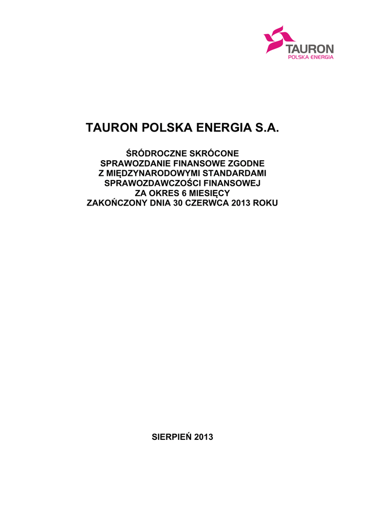 TAURON POLSKA ENERGIA S.A. ŚRÓDROCZNE SKRÓCONE SPRAWOZDANIE FINANSOWE ZGODNE Z MIĘDZYNARODOWYMI STANDARDAMI SPRAWOZDAWCZOŚCI FINANSOWEJ ZA OKRES 6 MIESIĘCY ZAKOŃCZONY DNIA 30 CZERWCA 2013 ROKU SIERPIEŃ 2013 TAURON Polska Energia S.A. Śródroczne skrócone sprawozdanie finansowe za okres 6 miesięcy zakończony dnia 30 czerwca 2013 roku (w tysiącach złotych) SPIS TREŚCI ŚRÓDROCZNE SKRÓCONE SPRAWOZDANIE Z CAŁKOWITYCH DOCHODÓW ............................................................. 4 ŚRÓDROCZNE SKRÓCONE SPRAWOZDANIE Z SYTUACJI FINANSOWEJ .................................................................... 5 ŚRÓDROCZNE SKRÓCONE SPRAWOZDANIE ZE ZMIAN W KAPITALE WŁASNYM ...................................................... 7 ŚRÓDROCZNE SKRÓCONE SPRAWOZDANIE Z PRZEPŁYWÓW PIENIĘŻNYCH ............................................................ 8 DODATKOWE NOTY OBJAŚNIAJĄCE............................................................................................................................... 10 1. Informacje ogólne............................................................................................................................................... 10 2. Podstawa sporządzenia śródrocznego skróconego sprawozdania finansowego ........................................ 10 3. Istotne zasady (polityka) rachunkowości ......................................................................................................... 11 4. Nowe standardy i interpretacje, które zostały opublikowane, a nie weszły jeszcze w życie ....................... 11 5. Zmiana szacunków ............................................................................................................................................. 12 6. Udziały i akcje w jednostkach powiązanych .................................................................................................... 14 7. Sezonowość działalności................................................................................................................................... 16 8. Informacje dotyczące segmentów działalności ............................................................................................... 16 9. Przychody i koszty ............................................................................................................................................. 19 10. 9.1. Przychody ze sprzedaży .......................................................................................................................19 9.2. Koszty według rodzaju ..........................................................................................................................19 Podatek dochodowy........................................................................................................................................... 20 10.1. Obciążenia podatkowe w sprawozdaniu z całkowitych dochodów .......................................................20 10.2. Odroczony podatek dochodowy ...........................................................................................................20 10.3. Podatkowa Grupa Kapitałowa ..............................................................................................................21 11. Dywidendy wypłacone i zaproponowane do wypłaty ...................................................................................... 21 12. Rzeczowe aktywa trwałe .................................................................................................................................... 21 13. Długoterminowe aktywa niematerialne ............................................................................................................ 23 14. Udziały i akcje ..................................................................................................................................................... 23 15. Obligacje oraz inne dłużne papiery wartościowe ............................................................................................ 26 16. Pożyczki długoterminowe .................................................................................................................................. 26 17. Krótkoterminowe aktywa niematerialne ........................................................................................................... 26 18. Zapasy ................................................................................................................................................................. 27 19. Należności z tytułu dostaw i usług oraz pozostałe należności ...................................................................... 28 20. Środki pieniężne i ich ekwiwalenty ................................................................................................................... 29 21. Kapitał własny..................................................................................................................................................... 30 22. 21.1. Kapitał podstawowy ..............................................................................................................................30 21.2. Akcjonariusze o znaczącym udziale .....................................................................................................30 21.3. Kapitał zapasowy, niepodzielony wynik finansowy z lat ubiegłych oraz ograniczenia w wypłacie dywidendy.............................................................................................................................................30 21.4. Kapitał z aktualizacji wyceny instrumentów zabezpieczających ...........................................................30 Kredyty, pożyczki i dłużne papiery wartościowe ............................................................................................. 31 22.1. Wyemitowane obligacje .............................................................................