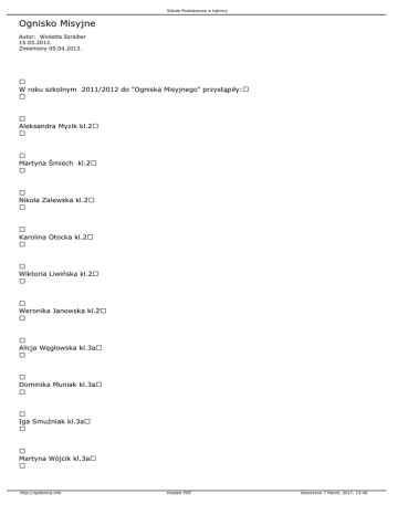 Szkoła Podstawowa w Łęknicy Ognisko Misyjne Autor: Wioletta Szreiber 15.03.2012. Zmieniony 05.04.2012. W roku szkolnym 2011/2012 do "Ogniska Misyjnego" przystąpiły: Aleksandra Myzik kl.2 Martyna Śmiech kl.2 Nikola Zalewska kl.2 Karolina Otocka kl.2 Wiktoria Liwińska kl.2 Weronika Janowska kl.2 Alicja Węglowska kl.3a Dominika Muniak kl.3a Iga Smuźniak kl.3a Martyna Wójcik kl.3a http://spleknica.info Kreator PDF Utworzono 7 March, 2017, 13:46 Szkoła Podstawowa w Łęknicy Sylwia Prodlik kl.3a Aleksandra Wiwacz kl. 3b Alan Malinowski kl.3b Barbara Gałuszka kl.3b Ewa Żukowska kl. 3b Kamila Plichta kl.3b Patrycja Grabowska kl.3b Patryk Grabowski kl.3b Bartek Samojeden kl.4 Dominika Pietrzak kl.4 Maksymilian Ciereszko kl.4 Wiktoria Iwuć kl.4 Weronika Baran kl.4 http://spleknica.info Kreator PDF Utworzono 7 March, 2017, 13:46 Szkoła Podstawowa w Łęknicy Weronika Bogacz kl.4 Kacper Lubnau kl. 4 Karolina Wajberg kl.4 Julia Śmietańska kl.5a Agata Wąsowicz kl.5b Klaudia Łagnowska kl.5b Eliza Góraleczko kl.6b Kamila Szałęga kl.6b Natalia Szymańska kl.6b 4 listopada 2011r. na szkolnym apelu Pani Dyrektor Sławomira Marszałek wręczyła dzieciom indeksy i życzyła owocnej pracy, Zadaniem ogniska jest rozpalanie w sercach katolickich dzieci miłości do misji oraz poczucia solidarności tak duchowej jak i materialnej, wobec rówieśników na całym świecie. Dzieci niosą pomoc poprzez modlitwę, wyrzeczenia, świadectwo życia, dobre uczynki, składanie swojego "grosika", jako owoc własnych wyrzeczeń. http://spleknica.info Kreator PDF Utworzono 7 March, 2017, 13:46 Szkoła Podstawowa w Łęknicy Beata Śmietańska http://spleknica.info Kreator PDF Utworzono 7 March, 2017, 13:46