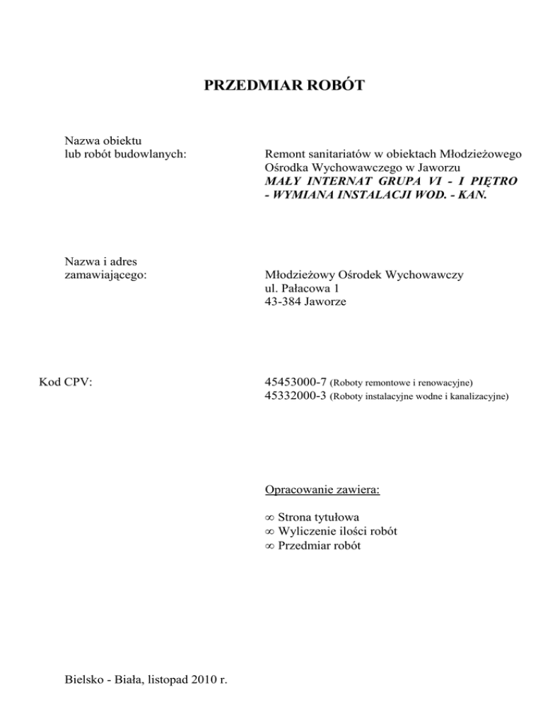 PRZEDMIAR ROBÓT Nazwa obiektu lub robót budowlanych: Nazwa i adres zamawiającego: Kod CPV: Remont sanitariatów w obiektach MłodzieŜowego Ośrodka Wychowawczego w Jaworzu MAŁY INTERNAT GRUPA VI - I PIĘTRO - WYMIANA INSTALACJI WOD. - KAN. MłodzieŜowy Ośrodek Wychowawczy ul. Pałacowa 1 43-384 Jaworze 45453000-7 (Roboty remontowe i renowacyjne) 45332000-3 (Roboty instalacyjne wodne i kanalizacyjne) Opracowanie zawiera: • Strona tytułowa • Wyliczenie ilości robót • Przedmiar robót Bielsko - Biała, listopad 2010 r. MOW internatmały instp M.O.W. w Jaworzu - wymiana instalacji wod-kan.łazienka grupa VI Zuzia (C) DataComp 1994-2009(lic. 11755) strona nr: 2 Wyliczenie ilości robót Opis pozycji, wyliczenie ilości robót Ilość Krot. Jedn. 1 ROBOTY DEMONTAśOWE /CPV grupa 453/ 1 2 3 4 5 6 7 8 DemontaŜ urządzeń sanitarnych, umywalka porcelanowa /SST 001/ Demonta z postumentu porcelanowego do umywalek /mn.0,5 do R/ /SST 001/ DemontaŜ syfonu umywalkowego /SST 001/ DemontaŜ urządzeń sanitarnych, ustęp z miską porcelanową /SST 001/ DemontaŜ płuczki ustępowej, z zaworem pływakowym, płuczka z tworzywa sztucznego /SST 001/ DemontaŜ brodzika natryskowego blaszanego /SST 001/ DemontaŜ uzbrojenia rurociągu kanalizacyjnego, wpust Ŝeliwny podłogowy, Fi·50·mm /SST 001/ DemontaŜ rurociągu kanalizacyjnego, Ŝeliwnego kanalizacyjnego, na ścianie, Fi·50-100·mm /SST 001/ fi 100 mm 4,0*2 = fi 50 mm 4,0+2,5 = 9 p.a.DemontaŜ czyszczaka Ŝeliwnego fi 100 mm /SST 001/ 10 DemontaŜ uzbrojenia rurociągu kanalizacyjnego, rura wywiewna Ŝeliwna /SST 001/ 11 DemontaŜ zaworu kątowego do płuczki, Fi·15·mm /SST 001/ 12 DemontaŜ baterii umywalkowej ściennej /SST 001/ 13 DemontaŜ baterii natryskowej /SST 001/ 14 DemontaŜ rurociągu na ścianie, z PP, łączony metodą klejenia, Fi·15-25·mm /SST 001/ (4,0+2,5+0,5*6)*2 = 4 4 4 1 1 1 1 kpl kpl szt kpl szt kpl szt 8,000000 6,500000 14,50 14,50 1 1 1 4 1 m szt szt szt szt szt 19,000000 19,00 19,00 m 2 ROBOTY MONTAśOWE /CPV grupa 453/ 15 Włączenie się do istniejącej instalacji fi 25 mm /SST 002/ 2 16 Rurociągi z tworzyw sztucznych (PP, PE, PB) o połączeniach zgrzewanych na ścianach w budynkach mieszkalnych, Fi_zew. 20·mm /SST 002/ 4,0*2+0,5*6*2 = 14,000000 14,00 14,00 17 Rurociągi z tworzyw sztucznych (PP, PE, PB) o połączeniach zgrzewanych na ścianach w budynkach mieszkalnych, Fi_zew. 25·mm /SST 002/ 2,5*2 = 5,000000 5,00 5,00 18 Dodatki za podejścia dopływowe, w rurociągach z tworzyw sztucznych, do zaworów czerpalnych, baterii, mieszaczy, hydrantów itp. o połączeniu sztywnym, Fi_zew. 20·mm /SST 002/ natrysk 2 = 2,000000 2 2 19 Dodatki za podejścia dopływowe, w rurociągach z tworzyw sztucznych, do zaworów czerpalnych, baterii, płuczek, Fi_zew. 20·mm, o połączeniu metalowym /SST 002/ umywalki 4*2 = 8,000000 WC 1 = 1,000000 9 9 20 Zawory przelotowe kulowe, instalacji wodociągowych z rur z tworzyw sztucznych, Dn·20·mm /SST 002/ 2 21 Bateria umywalkowa jednouchwytowa z 2 zaworami, Dn·15·mm /SST 002/ 4 22 Bateria natryskowa z natryskiem przesuwnym, Dn·15·mm /SST 002/ 1 23 Zawór kątowy do płuczki Dn·15·mm /SST 002/ 1 24 Zawór czerpalny ze złączka do węŜą Dn·15·mm /SST 002/ 1 25 Rurociągi z PVC kanalizacyjne, na ścianach w budynkach mieszkalnych, na wcisk, Fi·110·mm /SST 002/ 8,0+1,0 = 9,000000 9,00 9,00 26 Czyszczaki z PVC kanalizacyjne, o połączeniu wciskowym, Fi·110·mm /SST 002/ 1 27 Rura wywiewna z PVC o połączeniu wciskowym, Fi·110·mm /SST 002/ 1 28 Rurociągi z PVC kanalizacyjne, na ścianach w budynkach mieszkalnych, na wcisk, Fi·50·mm /SST 002/ 4,0+2,5+1,5 = 8,000000 8,00 8,00 29 Dodatki za wykonanie podejść odpływowych z PVC, na wcisk, Fi·50·mm /SST 002/ 5 30 Dodatki za wykonanie podejść odpływowych z PVC, na wcisk, Fi·110·mm /SST 002/ 1 31 Umywalka pojedyncza porcelanowa z syfonem gruszkowym /SST 002/ 4 32 Ustęp z płuczką, typu "kompakt" /SST 002/ 1 33 Wpust ściekowy z tworzywa sztucznego,z kratką ze stali nierdzewnej Fi·50·mm /SST 002/ 2 34 DrąŜek prysznicowy z rury stalowej /SST 002/ 1 35 Zawieszenie parawanu prysznicowego /SST 002/ 1 36 Wykucie bruzd poziomych w ścianach z cegieł na zaprawie cementowo-wapiennej, o głębokości i szerokości 1/2x1/2 cegły /SST 001/ (4,0+2,5)*2 = 13,000000 13,00 13,00 37 Wykucie bruzd pionowych w ścianach z cegieł na zaprawie cementowo-wapiennej, o głębokości i szerokości 1/2x1/2 cegły /SST 001/ 0,5*6+2,0 = 5,000000 5,00 5,00 38 Zamurowanie bruzd z przewodami instalacyjnymi w ścianach z cegieł, pionowych, szerokości 1/2 cegły /SST 004/ 5,00 39 Zamurowanie bruzd z przewodami instalacyjnymi w ścianach z cegieł, pionowych, i pochyłychszerokości 1/2 cegły 13,00 /SST 002/ 40 Obróbka z blachy ocynkowanej wywiewek kanalizacyjnych w dachach /SST 002/ 1 szt m m szt szt szt szt szt szt szt m szt szt m szt szt kpl kpl szt szt szt m m m m szt M.O.W. w Jaworzu - wymiana instalacji wod-kan.łazienka grupa VI MOW internatmały instp M.O.W. w Jaworzu - wymiana instalacji wod-kan.łazienka grupa VI Zuzia (C) DataComp 1994-2009(lic. 11755) strona nr: 3 Przedmiar robót Element, asortyment, rodzaj robót, pozycja przedmiarowa podstawy nakładów Jedn. Krot. Ilość Wartość Wartość jednostkowa netto 1 ROBOTY DEMONTAśOWE /CPV grupa 453/ 1 KNNR 8/225/3 DemontaŜ urządzeń sanitarnych, umywalka porcelanowa /SST 001/ 2 KNNR 4/230/5 Demonta z postumentu porcelanowego do umywalek /mn.0,5 do R/ /SST 001/ 3 KNRW 402/232/1 DemontaŜ syfonu umywalkowego /SST 001/ 4 KNNR 8/225/5 DemontaŜ urządzeń sanitarnych, ustęp z miską porcelanową /SST 001/ 5 KNRW 402/226/1 (2) DemontaŜ płuczki ustępowej, z zaworem pływakowym, płuczka z tworzywa sztucznego /SST 001/ 6 KNRW 402/222/3 (1) DemontaŜ brodzika natryskowego blaszanego /SST 001/ 7 KNNR 8/224/1 DemontaŜ uzbrojenia rurociągu kanalizacyjnego, wpust Ŝeliwny podłogowy, Fi·50·mm /SST 001/ 8 KNNR 8/222/4 DemontaŜ rurociągu kanalizacyjnego, Ŝeli