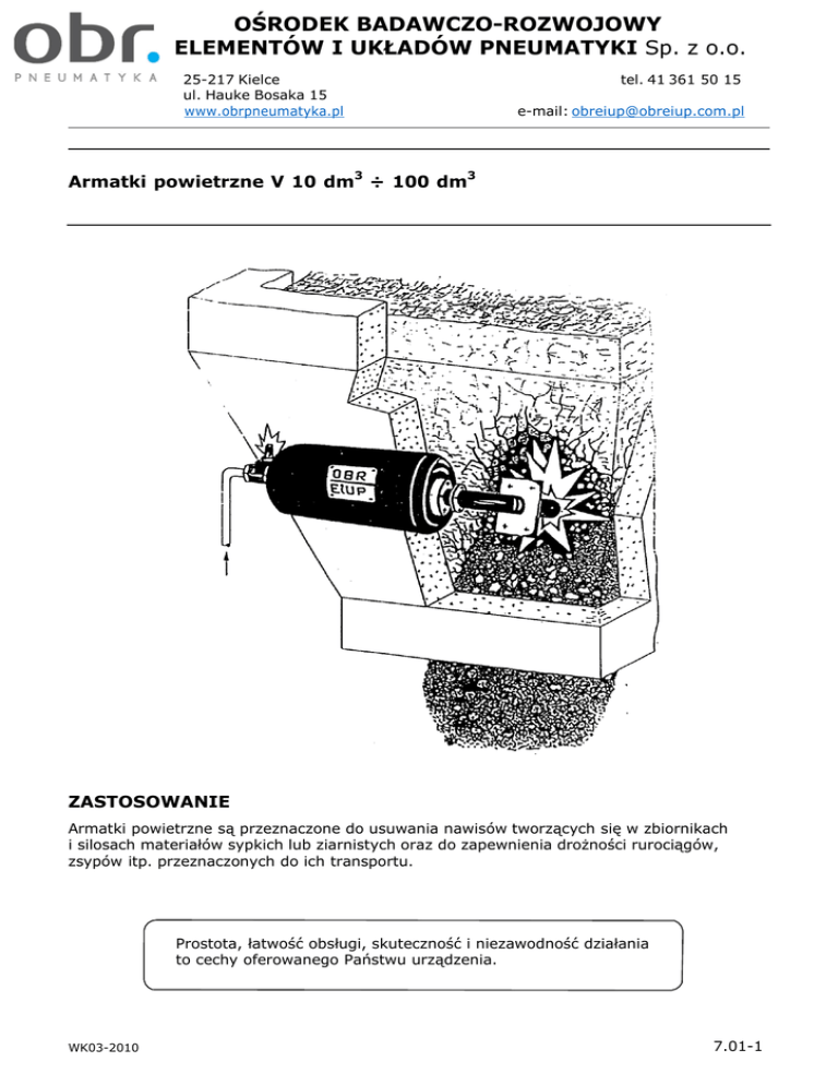 OŚRODEK BADAWCZO-ROZWOJOWY ELEMENTÓW I UKŁADÓW PNEUMATYKI Sp. z o.o. 25-217 Kielce ul. Hauke Bosaka 15 www.obrpneumatyka.pl tel. 41 361 50 15 e-mail: [email protected] Armatki powietrzne V 10 dm3 ÷ 100 dm3 ZASTOSOWANIE Armatki powietrzne są przeznaczone do usuwania nawisów tworzących się w zbiornikach i silosach materiałów sypkich lub ziarnistych oraz do zapewnienia drożności rurociągów, zsypów itp. przeznaczonych do ich transportu. Prostota, łatwość obsługi, skuteczność i niezawodność działania to cechy oferowanego Państwu urządzenia. WK03-2010 7.01-1 Armatki powietrzne V 10 ÷ 100 dm3 OBREiUP Sp. z o.o. Kielce BUDOWA I DZIAŁANIE Armatka powietrzna składa się ze zbiornika akumulacyjnego (1), wewnątrz którego znajduje się tłok (3), przesuwający się w tulei (2), wspomagany sprężyną (4). Powietrze ze zbiornika wydostaje się przez otwory w tulei do króćca wylotowego (5), a następnie do dyszy (7). Integralną częścią armatki jest specjalny zawór rozdzielający z zaworem zwrotnym sterowanym elektromagnetycznie (6). Istotą działania armatki powietrznej jest natychmiastowe uwolnienie nagromadzonej w zbiorniku energii sprężonego powietrza i skierowanie strumienia powietrza w kierunku króćca wylotowego. Następuje to w chwili podania impulsu elektrycznego do zaworu sterującego i jego przesterowania, co powoduje odpowietrzenie tulei za tłokiem, gwałtowne wycofanie tłoka, otwarcie otworów wylotowych w tulei i dynamiczny wypływ powietrza ukierunkowany przez odpowiednio wyprofilowaną końcówkę dyszy. Zanik impulsu elektrycznego na zaworze wywołuje jego powrót do położenia normalnego i otwarcie kanałów doprowadzających powietrze z sieci do zbiornika armatki przez otwory w dnie tulei. Tłok powraca do położenia wyjściowego i zamyka szczelnie zbiornik. Armatka powietrzna uruchamiana może być: - ręcznie, przyciskiem z pulpitu szafki sterującej - automatycznie wg programu sterownika 7.01-2 Armatki powietrzne V 10 ÷ 100 dm3 OBREiUP Sp. z o.o. Kielce GŁÓWNE WYMIARY (mm) Objętość zbiornika armatki V [dm3] Wymiar [mm] 10 20 30* 40 50 60* DN D D0 D1 n h Dz L L1 50 165 125 102 4 20 206 471 100 50 165 125 102 4 20 276 515 100 50 165 125 102 4 20 276 695 100 100 220 180 158 8 24 360 722 160 100 220 180 158 8 24 360 834 160 L2 G Masa [kg] Nr zamów. 90 G3/8 90 G3/8 90 G3/8 110 G1/2 13 16 18 50 AP.010 AP.020 AP.030 AP.040 80* 100 100 220 180 158 8 24 360 936 160 100 220 180 158 8 24 360 1140 160 100 220 180 158 8 24 360 1344 160 110 G1/2 110 G1/2 110 G1/2 110 G1/2 53 55 61 67 AP.050 AP.060 AP.080 AP.100 *Armatki powietrzne o tych pojemnościach wykonywane są na specjalne zamówienie. Przyłącze kołnierzowe armatki powietrznej PN10(bar). Zawory sterujące armatkami: -V10dm3÷30dm3 - zawór rozdzielający 3/2 G1/2 - nr zamówieniowy APZ32G12 -V40dm3÷100dm3 - zawór rozdzielający 3/2 G3/4- nr zamówieniowy APZ32G34 7.01-3 Armatki powietrzne V 10 ÷ 100 dm3 OBREiUP Sp. z o.o. Kielce DANE TECHNICZNE Czynnik roboczy Zakres ciśnień pracy Zakres temperatur pracy Klasa czystości sprężonego powietrza - sprężone powietrze lub gaz o podobnych właściwościach - 0,4 ÷ 0,6 MPa - 0 60 ºC - 5_ _wg PN-ISO 8573-1 Zapotrzebowanie powietrza do jednorazowego napełnienia armatki do ciśnienia 0,5 MPa: 10 dm3 20 dm3 30 dm3 40 dm3 50 dm3 60 dm3 80 dm3 100 dm3 - 0,05 0,10 0,15 0,20 0,25 0,30 0,40 0,50 m3 m3 m3 m3 m3 m3 m3 m3 Sterowanie - pneumatyczne elektrycznie Parametry prądowe elektrozaworu: - rodzaj prądu zasilającego - napięcie prądu zasilającego - pobór mocy - ręcznie, przyciskiem z pulpitu - ręcznie, przyciskiem z pulpitu - w cyklu automatycznym - stały DC, przemienny AC - DC (=) 24V AC (~) 24V, 115V, 230V 50/60Hz - DC – 10W, AC – 13,5 VA SPOSÓB ZAMÓWIENIA W zamówieniu należy podać nazwę i numer zamówieniowy armatki powietrznej np: Armatka powietrzna V50dm3,AP.050. W przypadku zamawiania armatki powietrznej z zaworem sterującym podać jego nazwę i nr zamówienia. REALIZACJA ZAMÓWIENIA OBREiUP zapewnia dostawę armatek, elementów pneumatyki, armatury i osprzętu zgodnie z życzeniem zamawiającego. Oferujemy swoje usługi w zakresie wykonania dokumentacji techniczno-montażowej zapewniając najbardziej efektywną i funkcjonalną pracę armatek. Zapewniamy również wyposażenie dodatkowe do pracy armatek w cyklu automatycznym. 7.01-4