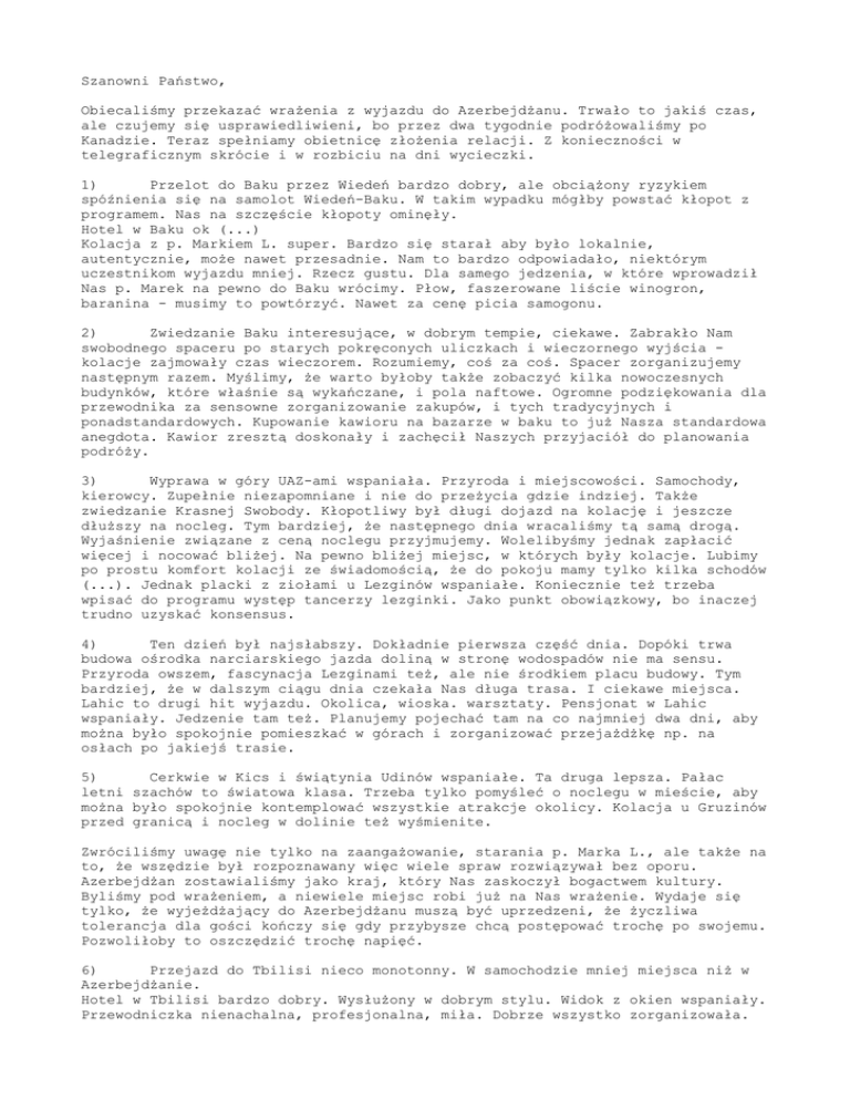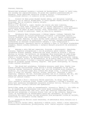 Szanowni Państwo, Obiecaliśmy przekazać wrażenia z wyjazdu do Azerbejdżanu. Trwało to jakiś czas, ale czujemy się usprawiedliwieni, bo przez dwa tygodnie podróżowaliśmy po Kanadzie. Teraz spełniamy obietnicę złożenia relacji. Z konieczności w telegraficznym skrócie i w rozbiciu na dni wycieczki. 1) Przelot do Baku przez Wiedeń bardzo dobry, ale obciążony ryzykiem spóźnienia się na samolot Wiedeń-Baku. W takim wypadku mógłby powstać kłopot z programem. Nas na szczęście kłopoty ominęły. Hotel w Baku ok (...) Kolacja z p. Markiem L. super. Bardzo się starał aby było lokalnie, autentycznie, może nawet przesadnie. Nam to bardzo odpowiadało, niektórym uczestnikom wyjazdu mniej. Rzecz gustu. Dla samego jedzenia, w które wprowadził Nas p. Marek na pewno do Baku wrócimy. Płow, faszerowane liście winogron, baranina - musimy to powtórzyć. Nawet za cenę picia samogonu. 2) Zwiedzanie Baku interesujące, w dobrym tempie, ciekawe. Zabrakło Nam swobodnego spaceru po starych pokręconych uliczkach i wieczornego wyjścia kolacje zajmowały czas wieczorem. Rozumiemy, coś za coś. Spacer zorganizujemy następnym razem. Myślimy, że warto byłoby także zobaczyć kilka nowoczesnych budynków, które właśnie są wykańczane, i pola naftowe. Ogromne podziękowania dla przewodnika za sensowne zorganizowanie zakupów, i tych tradycyjnych i ponadstandardowych. Kupowanie kawioru na bazarze w baku to już Nasza standardowa anegdota. Kawior zresztą doskonały i zachęcił Naszych przyjaciół do planowania podróży. 3) Wyprawa w góry UAZ-ami wspaniała. Przyroda i miejscowości. Samochody, kierowcy. Zupełnie niezapomniane i nie do przeżycia gdzie indziej. Także zwiedzanie Krasnej Swobody. Kłopotliwy był długi dojazd na kolację i jeszcze dłuższy na nocleg. Tym bardziej, że następnego dnia wracaliśmy tą samą drogą. Wyjaśnienie związane z ceną noclegu przyjmujemy. Wolelibyśmy jednak zapłacić więcej i nocować bliżej. Na pewno bliżej miejsc, w których były kolacje. Lubimy po prostu komfort kolacji ze świadomością, że do pokoju mamy tylko kilka schodów (...). Jednak placki z ziołami u Lezginów wspaniałe. Koniecznie też trzeba wpisać do programu występ tancerzy lezginki. Jako punkt obowiązkowy, bo inaczej trudno uzyskać konsensus. 4) Ten dzień był najsłabszy. Dokładnie pierwsza część dnia. Dopóki trwa budowa ośrodka narciarskiego jazda doliną w stronę wodospadów nie ma sensu. Przyroda owszem, fascynacja Lezginami też, ale nie środkiem placu budowy. Tym bardziej, że w dalszym ciągu dnia czekała Nas długa trasa. I ciekawe miejsca. Lahic to drugi hit wyjazdu. Okolica, wioska. warsztaty. Pensjonat w Lahic wspaniały. Jedzenie tam też. Planujemy pojechać tam na co najmniej dwa dni, aby można było spokojnie pomieszkać w górach i zorganizować przejażdżkę np. na osłach po jakiejś trasie. 5) Cerkwie w Kics i świątynia Udinów wspaniałe. Ta druga lepsza. Pałac letni szachów to światowa klasa. Trzeba tylko pomyśleć o noclegu w mieście, aby można było spokojnie kontemplować wszystkie atrakcje okolicy. Kolacja u Gruzinów przed granicą i nocleg w dolinie też wyśmienite. Zwróciliśmy uwagę nie tylko na zaangażowanie, starania p. Marka L., ale także na to, że wszędzie był rozpoznawany więc wiele spraw rozwiązywał bez oporu. Azerbejdżan zostawialiśmy jako kraj, który Nas zaskoczył bogactwem kultury. Byliśmy pod wrażeniem, a niewiele miejsc robi już na Nas wrażenie. Wydaje się tylko, że wyjeżdżający do Azerbejdżanu muszą być uprzedzeni, że życzliwa tolerancja dla gości kończy się gdy przybysze chcą postępować trochę po swojemu. Pozwoliłoby to oszczędzić trochę napięć. 6) Przejazd do Tbilisi nieco monotonny. W samochodzie mniej miejsca niż w Azerbejdżanie. Hotel w Tbilisi bardzo dobry. Wysłużony w dobrym stylu. Widok z okien wspaniały. Przewodniczka nienachalna, profesjonalna, miła. Dobrze wszystko zorganizowała. Pokazała miejsca, w których możemy zjeść i zrobić zakupy. Szczególne podziękowania za wybranie menu na kolację i zorganizowanie samochodu na lotnisko. Tego się nie spodziewaliśmy. Cały drugi dzień w Tbilisi spacerowaliśmy, zobaczyliśmy Muzeum z malarstwem Pirosmaniego - może warto pokazywać ? Chcemy wrócić na Kaukaz. Na pewno do Baku. Myślimy o wyjeździe do Gruzji (Tbilisi i jakaś górska część Gruzji, ale nie Swanetia) na ok. tydzień. Pewnie w dalszej kolejności chcemy pojechać do Armenii. W trakcie wyprawy do Azerbejdżanu zaczęliśmy rozmawiać o Dagestanie, ale ... nie w tym roku raczej i trzeba przemyśleć program aby nie sprowadzać wyjazdu do pogoni górskimi drogami z miejsca na miejsce, Oby tylko zdrowie i okoliczności pozwoliły to będziemy się kontaktować. Jeszcze raz dziękujemy za zorganizowanie miłego wyjazdu. (...) Pozdrawiamy, AA M----------