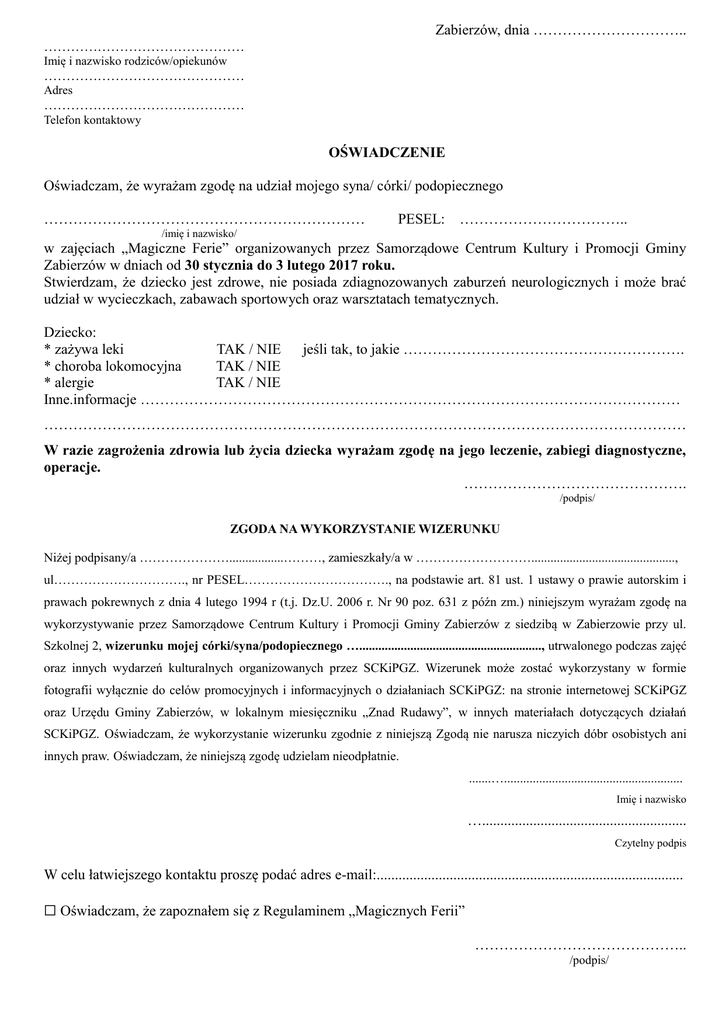 Zabierzów, dnia ………………………….. ……………………………………… Imię i nazwisko rodziców/opiekunów ……………………………………… Adres ……………………………………… Telefon kontaktowy OŚWIADCZENIE Oświadczam, że wyrażam zgodę na udział mojego syna/ córki/ podopiecznego ………………………………………………………… PESEL: …………………………….. /imię i nazwisko/ w zajęciach „Magiczne Ferie” organizowanych przez Samorządowe Centrum Kultury i Promocji Gminy Zabierzów w dniach od 30 stycznia do 3 lutego 2017 roku. Stwierdzam, że dziecko jest zdrowe, nie posiada zdiagnozowanych zaburzeń neurologicznych i może brać udział w wycieczkach, zabawach sportowych oraz warsztatach tematycznych. Dziecko: * zażywa leki TAK / NIE jeśli tak, to jakie …………………………………………………. * choroba lokomocyjna TAK / NIE * alergie TAK / NIE Inne.informacje ………………………………………………………………………………………………… …………………………………………………………………………………………………………………… W razie zagrożenia zdrowia lub życia dziecka wyrażam zgodę na jego leczenie, zabiegi diagnostyczne, operacje. ………………………………………. /podpis/ ZGODA NA WYKORZYSTANIE WIZERUNKU Niżej podpisany/a ………………….................………, zamieszkały/a w ………………………............................................., ul…………………………., nr PESEL……………………………., na podstawie art. 81 ust. 1 ustawy o prawie autorskim i prawach pokrewnych z dnia 4 lutego 1994 r (t.j. Dz.U. 2006 r. Nr 90 poz. 631 z późn zm.) niniejszym wyrażam zgodę na wykorzystywanie przez Samorządowe Centrum Kultury i Promocji Gminy Zabierzów z siedzibą w Zabierzowie przy ul. Szkolnej 2, wizerunku mojej córki/syna/podopiecznego …........................................................., utrwalonego podczas zajęć oraz innych wydarzeń kulturalnych organizowanych przez SCKiPGZ. Wizerunek może zostać wykorzystany w formie fotografii wyłącznie do celów promocyjnych i informacyjnych o działaniach SCKiPGZ: na stronie internetowej SCKiPGZ oraz Urzędu Gminy Zabierzów, w lokalnym miesięczniku „Znad Rudawy”, w innych materiałach dotyczących działań SCKiPGZ. Oświadczam, że wykorzystanie wizerunku zgodnie z niniejszą Zgodą nie narusza niczyich dóbr osobistych ani innych praw. Oświadczam, że niniejszą zgodę udzielam nieodpłatnie. .......…........................................................ Imię i nazwisko …........................................................ Czytelny podpis W celu łatwiejszego kontaktu proszę podać adres e-mail:.................................................................................... ☐ Oświadczam, że zapoznałem się z Regulaminem „Magicznych Ferii” …………………………………….. /podpis/