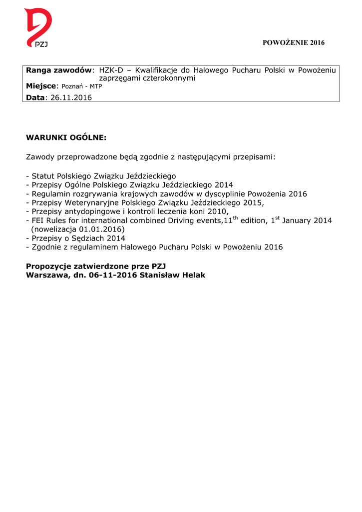 POWOŻENIE 2016 Ranga zawodów: HZK-D – Kwalifikacje do Halowego Pucharu Polski w Powożeniu zaprzęgami czterokonnymi Miejsce: Poznań - MTP Data: 26.11.2016 WARUNKI OGÓLNE: Zawody przeprowadzone będą zgodnie z następującymi przepisami: - Statut Polskiego Związku Jeździeckiego Przepisy Ogólne Polskiego Związku Jeździeckiego 2014 Regulamin rozgrywania krajowych zawodów w dyscyplinie Powożenia 2016 Przepisy Weterynaryjne Polskiego Związku Jeździeckiego 2015, Przepisy antydopingowe i kontroli leczenia koni 2010, FEI Rules for international combined Driving events,11th edition, 1st January 2014 (nowelizacja 01.01.2016) - Przepisy o Sędziach 2014 - Zgodnie z regulaminem Halowego Pucharu Polski w Powożeniu 2016 Propozycje zatwierdzone prze PZJ Warszawa, dn. 06-11-2016 Stanisław Helak POWOŻENIE 2016 I. INFORMACJE OGÓLNE 1. Typ zawodów HZK-D – Kwalifikacje do Halowego Pucharu Polski w Ranga zawodów: Kategoria wiekowa: Data : Miejsce: Powożeniu zaprzęgami czterokonnymi Seniorzy 26- 11- 2016 (sobota) Międzynarodowe Targi Poznańskie sp. z o.o. Poznań, Głogowska 14 2. Organizator Nazwa: Międzynarodowe Targi Poznańskie sp. z o.o. i Stowarzyszenie Jeździeckie Baborówko Głogowska 14, 60-724 Poznań +48/61/8692000 Fax: +48/61/8692999 [email protected] strona www: www.cavaliada.pl Adres: Tel: Email: 3. Komitet Organizacyjny: Dyrektor Zawodów: Biuro Zawodów: Kontakt: Dominik Nowacki Henryk Święcicki jr [email protected] +48603410205, +48600086283 II. OSOBY OFICJALNE (zgodnie z Regulaminem HPP) 1. Komisja Sędziowska: Lp. Imię Nazwisko Funkcja 1. Piotr Helon Przewodniczący 2. Tomasz Mossakowski Członek 3. Sebastian Bogacz Gospodarz toru 4. Witold Bogacz Szef komisarzy 5. Michał Borowiński Lekarz wet POWOŻENIE 2016 III WARUNKI TECHNICZNE Program zawodów: HZK-D – Kwalifikacje do HPPP Data/godz. Konkurs nr 1 zręczności powożenia z elemanetami maratonowymi 26.11.2016 / po 17.00 Konkurs rozgrywany jest na zasadzie konkursu dwunawrotowego szybkości z punktami karnymi przeliczanymi na karne sekundy. Tempo dla zaprzęgów wynosi 250m/min. W drugim nawrocie startują wszyscy zawodnicy w takiej samej kolejności jak w pierwszym. O zajętych miejsca decyduje suma czasów i karnych sekund z obu nawrotów. Pozostałe zasady zgodnie z warunkami technicznymi określonymi Regulaminem Halowego Pucharu Polski w Powożeniu. IV. WARUNKI UCZESTNICTWA 1. Zawodnicy: W kwalifikacjach do Halowego Pucharu Polski w powożeniu zaprzęgami czterokonnymi prawo startu mają tylko zawodnicy z aktualną licencją regionalną lub ogólnopolską i konie min. 5 letnie z aktualną licencją regionalną lub ogólnopolską. 2. Zgłoszenia: Zgłoszenia wstępne Data: - Zgłoszenia imienne Data: 15.11.2016 Zgłoszenia ostateczne Data : 15.11.2015 Zgłoszenia prosimy wysyłać na adres: [email protected] lub fax: +48/61/8692999 3. Warunki finansowe: Opłata organizacyjna – (wpisowe + 4 boksy): 500 zł za zaprzęg Opłata organizacyjna bez boksów: 200 zł za zaprzęg Program antydopingowy – 15 zł/ koń Pasza i siano własne x na koszt KO - Podłączenie samochodu do prądu organizator: Koszt podłączenia – 100 zł za całe zawody zapewnia x nie zapewnia - POWOŻENIE 2016 Możliwość zakupu : Siano: Słoma: Trociny: 20 zł za balik 16 zł za balik 50 zł za balik 4. Zakwaterowanie i wyżywienie. Lista hoteli: www.cavaliada.pl Wyżywienie: Na koszt zawodników x na koszt KO Stajnie zostaną udostępnione od dnia 25.11.2016 od godz. 16.00 Siano, słoma, noclegi itp. na koszt zawodnika. V. NAGRODY (zgodnie z Przepisami Ogólnymi art. 29 oraz Regulaminem powożenia Art. 10 p.2.4) Miejsce 1 2 3 4 Do 25% SUMA Klasyfikacja końcowa 500 zł 250 zł 200 zł 100 zł 50 zł 1100 zł Zgodnie z Regulaminem Halowego Pucharu Polski w powożeniu - dwóch najwyżej sklasyfikowanych po 2 konkursach zawodników otrzymuje prawo startu w Halowym Pucharze Polski w powożeniu zaprzęgami parokonnymi. Organizator zapewnia nagrody honorowe – statuetki dla 3 pierwszych miejsc. Organizator zapewnia wstęgi honorowe (flots) dla wszystkich koni. Minimalna liczba nagród w każdej klasie musi opierać się na zasadzie - jedna nagroda na czterech zawodników, przy zachowaniu minimum 5 nagród. W przypadku, gdy liczba startujących jest niewielka, to – pomimo innych zapisów w propozycjach, z wyjątkiem Mistrzostw Polski i Pucharu Polski – organizator może posłużyć się następującym kluczem: Liczba startujących 1–4 5–8 9 – 12 13 – 16 17 – 20 Liczba nagród 1 2 3 4 5 POWOŻENIE 2016 VI. INNE 1. OGRANICZENIE ODPOWIEDZIALNOŚCI Organizator nie odpowiada za wypadki, szkody i kradzieże powstałe w trakcie zawodów. Komitet Organizacyjny nie ponosi żadnej odpowiedzialności w razie wypadków i zachorowań trenera, zawodników, luzaków i koni, jak również w przypadku kradzieży, zniszczeń, pożarów i innych wydarzeń. Zawodnicy i właściciele odpowiadają osobiście za zniszczenia w stosunku do osób trzecich, spowodowane przez nich samych, ich pracowników lub ich konie. Dlatego zalecane jest zawarcie stosownego pełnego ubezpieczenia na czas udziału w zawodach. 2. Sprawy weterynaryjne Szczepienia ochronne przeciwko grypie koni. Obowiązuje następujący schemat szczepień: a. szczepienie podstawowe: pierwsze szczepienie – w dniu rozpoczęcia szczepień drugie szczepienie – nie wcześniej niż 21-go dnia i nie później niż 92 dnia od pierwszego szczepienia. b. szczepienie przypominające: co 6 miesięcy od ostatniego szczepienia (jest dopuszczalny 21 dniowy okres karencji); żadne szczepienie przypominające nie może się odbyć później niż na 7 dni przed przybyciem na zawody. Lp 1. 2. 3. Funkcja Powiatowy lekarz wet. Delegat wet. PZJ Lekarz wet. zawodów Imię i nazwisko Ireneusz Sobiak telefon 618680199 Michał Borowiński 602106198 I. KODEKS POSTĘPOWANIA Z KONIEM I. Polski Związek Jeździecki w ślad za Międzynarodową Federacją Jeździecką FEI oczekuje, że wszystkie osoby 