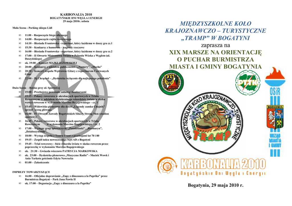 KARBONALIA 2010 BOGATYŃSKIE DNI WĘGLA I ENERGII 29 maja 2010r. sobota Mała Scena - Parking sklepu Lidl • • • • • • • • • • 11.00 – Rozpoczęcie biegu ulicznego 14:00 – Rozpoczęcie rajdu rowerowego 14:10 – Biesiada Frantowska - repertuar, który kaŜdemu w duszy gra cz.1 15:30 – Konkursy z humorem – nagrody rzeczowe 16:00 – Biesiada Frantowska - repertuar, który kaŜdemu w duszy gra cz.2 17:00 – II Otwarte Mistrzostwa Świata w Pchaniu Wózka z Węglem (ul. Daszyńskiego) ok. 19:00 – Koncert MAJKI JEśOWSKIEJ 20:00 – Konkursy z udziałem publiczności - „Numery”, „Macho” 20:30 – Koncert zespołu Wędrowne Gitary z repertuarem Czerwonych Gitar 22:00 – Dj Chrąchol – „Dyskoteka wyłącznie dla najlepszego pokolenia” MIĘDZYSZKOLNE KOŁO KRAJOZNAWCZO – TURYSTYCZNE „TRAMP” W BOGATYNI zaprasza na XIX MARSZE NA ORIENTACJĘ O PUCHAR BURMISTRZA MIASTA I GMINY BOGATYNIA DuŜa Scena - Boisko przy ul. Sportowej • 15:00 – Przebojowe powitanie zabawą i konkursami • 15:15 – Pokazy rowerowe w akrobacjach sportowych w Trialu Rowerowym z udziałem wielokrotnego rekordzisty świata w skoku wzwyŜ rowerem w wykonaniu Marcina Bugajewskiego – cz. 1 • 15:45 – Widowisko plenerowe dla dzieci „Legendy zamku Chojnik” (przed sceną główną). • 16:00 – IV Otwarte Zawody Bogatyńskich Siłaczy Strong Men (stadion sportowy) • 16:45 – Pokazy rowerowe w akrobacjach sportowych w Trialu Rowerowym w wykonaniu Marcina Bugajewskiego – cz. 2 • 17:00 – Występy grup śpiewaczych: „Posadzianki”, „Rozmaryn”, „Działoszynianki”, • 18:00 – Występ zespołu z Teatru Frant z przebojami lat 70 i 80 • 19:15 – Zespół tańca nowoczesnego SQUAD z Bogatyni • 19:45 – Trial rowerowy - bicie rekordu świata w skoku rowerem przez poprzeczkę w wykonaniu Marcina Bugajewskiego • ok. 21:30 – Gwiazda wieczoru PATRYCJA MARKOWSKA • ok. 23:00 – Dyskoteka plenerowa „Muzyczne Radio” - Maciek Wowk i Ania Tarkota gościnnie Edyta Nawrocka • 01:00 – Zakończenie IMPREZY TOWARZYSZĄCE • 16:00 – Oficjalne doprawianie „Zupy z dinozaura a la Paprika” przez Burmistrza Bogatyni – Park Jana Pawła II • ok. 17:00 – Degustacja „Zupy z dinozaura a la Paprika” Bogatynia, 29 maja 2010 r. TERMIN I MIEJSCE 29 maja 2010 (sobota) r. – Bogatynia i okolice ORGANIZATOR Międzyszkolne Koło Krajoznawczo – Turystyczne „Tramp” Bogatynia WSPÓŁORGANIZATORZY Urząd Miasta i Gminy w Bogatyni Ośrodek Sportu i Rekreacji w Bogatyni Publiczna Szkoła Podstawowa Nr 1 W Bogatyni ZESPÓŁ ORGANIZACYJNY Główni organizatorzy: Marek Łabędź, Janusz BłaŜków, Katarzyna Krawczenko, Dawid Szymaniak Kierownik Imprezy: Marek Łabędź Sędzia Główny: Adam Rodziewicz Budowa Tras: Adam Rodziewicz • • • CEL IMPREZY upowszechnianie turystycznych marszy na orientację prezentacja walorów turystycznych Ziemi Bogatyńskiej rozegranie XIX Zawodów na Orientację o Puchar Burmistrza Miasta i Gminy Bogatynia FORMA, ETAPY, KATEGORIE TM - urodzeni w 1994 - 1996r. ( 2 etapy dzienne, zespoły 2 osobowe) TD - urodzeni w 1997 r i później (etapy i zespoły jak w kat. TM) TP - dla początkujących (1 etap dzienny, wiek i ilość osób w zespole dowolne) Kategoria TP prowadzona będzie bez klasyfikacji i nagród. W trakcie trwania imprezy składy zespołów nie mogą ulec zmianie. MAPA I TEREN Mapy nietypowe czarno-białe lub kolorowe, w okolicy PK unacześnione BAZA IMPREZ Publiczna Szkoła Podstawowa nr 1 w Bogatyni, Bogatynia, Plac Bohaterów Warszawy 1, kierunek Sieniawka, PROGRAM IMPREZY 29 maja 2010 r. (sobota) do godziny 8.30 – wydawanie materiałów startowych 8.30 – otwarcie zawodów i odprawa techniczna 9.00 – wyjazd na start do etapu I i II 9.30 – start – godzina”0” we wszystkich kategoriach 14.00 – uroczyste zakończenie zawodów Od 14.30 – udział w Karbonaliach 2010 WPISOWE Kategoria TM i TD - 10 zł Kategoria TP - 5 zł Wpisowe pobierane będzie przy przyjmowaniu uczestników w bazie imprezy. ŚWIADCZENIA Posiłek międzyetapowy po I etapie Dyplomy i nagrody dla najlepszych. Komplet materiałów startowych. Punkty do InO. Protokół z imprezy dla kaŜdej jednostki zgłaszającej. Pamiątkowy znaczek. ZGŁOSZENIA Zgłoszenia prosimy kierować do dnia 26 maja 2010 r. na adres: Szkoła Podstawowa w Opolnie Zdroju, ul. Świerczewskiego 7a, 59-922 Opolno Zdrój lub telefonicznie SP Opolno Zdrój (075) 77 38 329, Marek Łabędź tel. kom. 0 600 41 3757 lub e-mail:[email protected] • • • • • • WYśYWIENIE W ramach wpisowego organizatorzy zabezpieczają posiłek międzyetapowy na mecie etapu Pozostałe posiłki uczestnicy zakupują we własnym zakresie w oparciu o miejscową bazę gastronomiczną. POSTANOWIENIA KOŃCOWE • Osobom zgłoszonym a nieobecnym na imprezie nie przysługuje prawo do zwrotu wpisowego. • Wszystkich uczestników imprezy obowiązuje przestrzeganie Karty Turysty, Regulaminu Imprezy, regulaminu Pucharu Dolnego Śląska oraz poleceń organizatorów. • Osoby niepełnoletnie bez pełnoletniego opiekuna nie będą przyjęte na imprezę. • Za rzeczy zagubione w trakcie imprezy organizatorzy nie ponoszą odpowiedzialności. • Uczestnicy ubezpieczają się we własnym zakresie. • Interpretacja regulaminu naleŜy wyłącznie do organizatorów. Dodatkowe informacje Marek Łabędź Tel 600413757