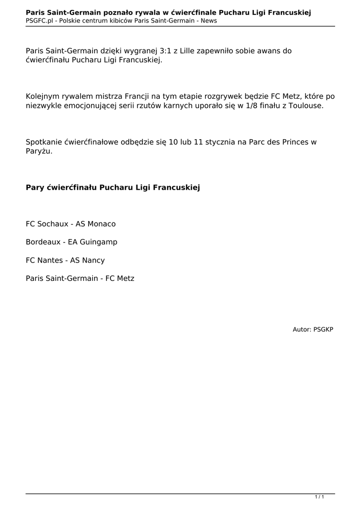 Paris Saint-Germain poznało rywala w ćwierćfinale Pucharu Ligi Francuskiej PSGFC.pl - Polskie centrum kibiców Paris Saint-Germain - News Paris Saint-Germain dzięki wygranej 3:1 z Lille zapewniło sobie awans do ćwierćfinału Pucharu Ligi Francuskiej. Kolejnym rywalem mistrza Francji na tym etapie rozgrywek będzie FC Metz, które po niezwykle emocjonującej serii rzutów karnych uporało się w 1/8 finału z Toulouse. Spotkanie ćwierćfinałowe odbędzie się 10 lub 11 stycznia na Parc des Princes w Paryżu. Pary ćwierćfinału Pucharu Ligi Francuskiej FC Sochaux - AS Monaco Bordeaux - EA Guingamp FC Nantes - AS Nancy Paris Saint-Germain - FC Metz Autor: PSGKP 1/1 Powered by TCPDF (www.tcpdf.org)