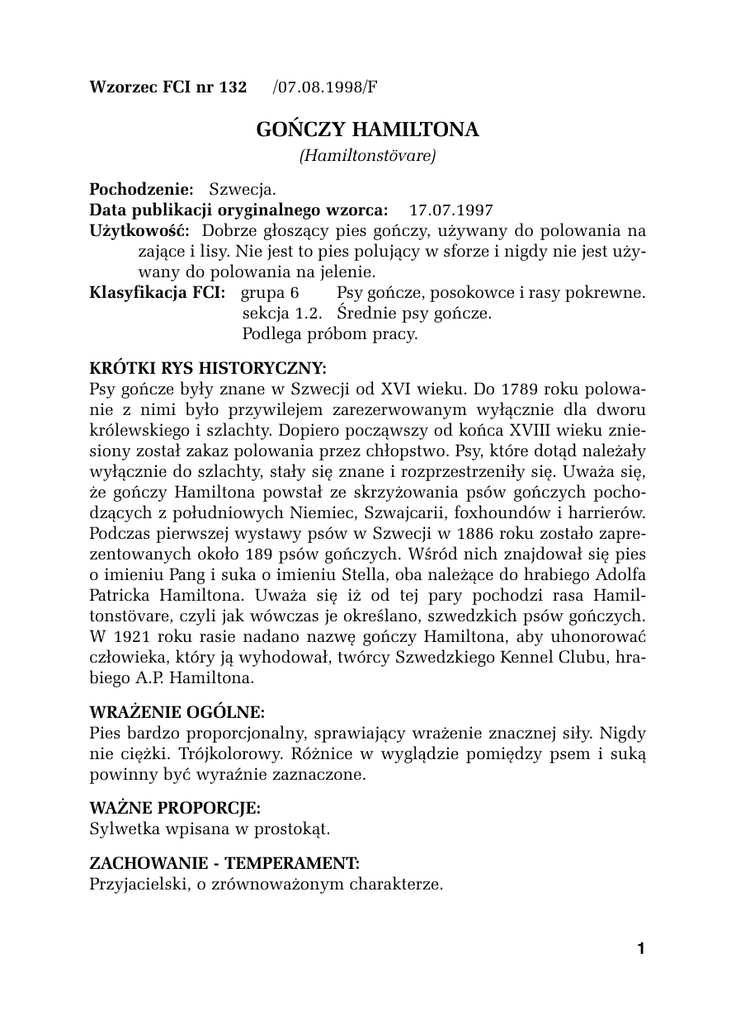 Wzorzec FCI nr 132 /07.08.1998/F GOŃCZY HAMILTONA (Hamiltonstövare) Pochodzenie: Szwecja. Data publikacji oryginalnego wzorca: 17.07.1997 Użytkowość: Dobrze głoszący pies gończy, używany do polowania na zające i lisy. Nie jest to pies polujący w sforze i nigdy nie jest używany do polowania na jelenie. Klasyfikacja FCI: grupa 6 Psy gończe, posokowce i rasy pokrewne. sekcja 1.2. Średnie psy gończe. Podlega próbom pracy. KRÓTKI RYS HISTORYCZNY: Psy gończe były znane w Szwecji od XVI wieku. Do 1789 roku polowanie z nimi było przywilejem zarezerwowanym wyłącznie dla dworu królewskiego i szlachty. Dopiero począwszy od końca XVIII wieku zniesiony został zakaz polowania przez chłopstwo. Psy, które dotąd należały wyłącznie do szlachty, stały się znane i rozprzestrzeniły się. Uważa się, że gończy Hamiltona powstał ze skrzyżowania psów gończych pochodzących z południowych Niemiec, Szwajcarii, foxhoundów i harrierów. Podczas pierwszej wystawy psów w Szwecji w 1886 roku zostało zaprezentowanych około 189 psów gończych. Wśród nich znajdował się pies o imieniu Pang i suka o imieniu Stella, oba należące do hrabiego Adolfa Patricka Hamiltona. Uważa się iż od tej pary pochodzi rasa Hamiltonstövare, czyli jak wówczas je określano, szwedzkich psów gończych. W 1921 roku rasie nadano nazwę gończy Hamiltona, aby uhonorować człowieka, który ją wyhodował, twórcy Szwedzkiego Kennel Clubu, hrabiego A.P. Hamiltona. WRAŻENIE OGÓLNE: Pies bardzo proporcjonalny, sprawiający wrażenie znacznej siły. Nigdy nie ciężki. Trójkolorowy. Różnice w wyglądzie pomiędzy psem i suką powinny być wyraźnie zaznaczone. WAŻNE PROPORCJE: Sylwetka wpisana w prostokąt. ZACHOWANIE - TEMPERAMENT: Przyjacielski, o zrównoważonym charakterze. 1 GŁOWA: Raczej długa. Mózgoczaszka: Czaszka lekko wysklepiona, umiarkowanie szeroka. Stop wyraźny, ale nie przesadnie zaznaczony. Trzewioczaszka: Nos zawsze czarny, dobrze rozwinięty, z dużymi nozdrzami. Kufa długa, mocna i praktycznie prostokątna. Grzbiet nosa prosty, równoległy do osi czaszki. Odległość od stopu do guza potylicznego powinna być równa odległości od stopu do końca wierzchołka nosa. Wargi górne dość delikatne, napięte, zaokrąglone i niezbyt wydatne. Samce powinny mieć większe fafle niż suki. Szczęki/uzębienie: Zgryz nożycowy. Zęby mocne, dobrze rozwinięte. Policzki suche. Oczy ciemnobrązowe o spokojnym spojrzeniu. Uszy dość wysoko osadzone; wyciągnięte ku przodowi nie sięgają do połowy kufy. Kiedy uwaga psa jest napięta, powinny być tylko lekko unoszone. Miękkie, przylegające do policzków, ich przednia krawędź nie jest odwrócona na zewnątrz. SZYJA: Długa, mocna, dobrze związana z łopatkami. Skóra na szyi sprężysta i dobrze przylegająca. Samce powinny mieć górną linię szyi wyraźnie zarysowaną. TUŁÓW: Kłąb wyraźny. Grzbiet poziomy i silny. Lędźwie muskularne i lekko wysklepione. Zad lekko spadzisty, długi i szeroki. Klatka piersiowa głęboka, długa, dobrze rozwinięta, sięgająca do łokci. Żebra umiarkowanie zaokrąglone. Linia dolna i brzuch: brzuch tylko lekko podkasany. OGON: Osadzony na linii grzbietu. Prosty lub lekko szablasto wygięty ku górze. Dość szeroki u nasady, cieńszy na końcu. Sięga do stawu skokowego. W akcji preferowane jest, aby pies nie unosił go powyżej linii grzbietu. 2 KOŃCZYNY: Kończyny przednie o mocnym kośćcu, harmonizującym z wyglądem ogólnym psa. Widziane od przodu są proste i równoległe. Łopatki długie, muskularne, dobrze osadzone i mocno związane z tułowiem. Ramię długie, tworzy kąt prosty z łopatką. Łokcie przylegające do tułowia. Śródręcze elastyczne, z przedramieniem tworzy nieznaczny kąt (ustawione jest nieco skośnie). Łapy przednie owalne, związane, o dobrze wysklepionych palcach. Kończyny tylne mocne, widziane z tyłu, równoległe. Udo umięśnione, widziane z boku, szerokie. Staw kolanowy dobrze kątowany. Staw skokowy dobrze kątowany. Śródstopie krótkie i proste. Łapy tylne jak przednie. „Wilcze” pazury niepożądane. RUCH: Energiczne i wydłużone. Kończyny prowadzone równolegle. SZATA: Włos sztywny, niezbyt krótki, dobrze przylegający do tułowia. Na głowie, uszach i przedniej powierzchni kończyn włos musi być gładki i bardzo krótki. Na spodniej stronie ogona i tylnej powierzchni ud włos jest raczej długi, ale nie tworzy frędzli. Umaszczenie: trójkolorowe. Grzbiet, szyja, boki tułowia i górna część ogona czarne. Głowa, uszy i kończyny, a także boczne części szyi, tułowia i ogona płowe. Maść płowa może zmieniać odcień od złocistego do głębokiego, intensywnego czerwono-brązowego. Na górnej części kufy znajduje się biała listwa. Białe są także górna i spodnia powierzchnia szyi, klatka piersiowa, koniec ogona i dolna część kończyn oraz łapy. WYMIARY: Idealna wysokość w kłębie u samców wynosi 57 cm, z tolerancją od 53 d 61 cm. Idealna wysokość w kłębie dla suk wynosi 53 cm, z tolerancją od 49 do 57 cm. WADY: Wszelkie odstępstwa od powyższego wzorca powinny być traktowane jako wady obniżające ocenę w zależności od stopnia ich nasilenia. Zbyt słabo wyrażone cechy samcze lub sucze. 3 Czaszka szeroka; guz potyliczny silnie zaznaczony. Kufa krótka lub spiczasta; grzbiet nosa wklęsły. Przodozgryz lub tyłozgryz, zgryz cęgowy. Ciężkie policzki. Oczy jasne. Grzbiet miękki. Zad krótki, spadzisty. Ogon noszony powyżej linii grzbietu. Łopatki zbyt spionowane. Wąska akcja tylnych kończyn. Mieszanina maści brązowej i czarnej. Intensywny czarny nalot na bokach tułowia, łopatkach i udach. Białe znaczenia inne niż opisane we wzorcu. Maść dwukolorowa (żółta z białym, czarna z białym, czarna podpalana) lub znaczna przewaga jednego z trzech dopuszczalnych kolorów. WADY DYSKWALIFIKUJĄCE: Znaczny przodozgryz lub tyłozgryz. Wysokość w kłębie wykraczająca poza lim
