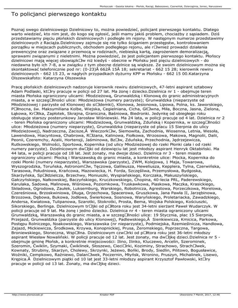 Płońszczak - Gazeta lokalna - Płońsk, Raciąż, Baboszewo, Czerwińsk, Dzierzążnia, Joniec, Naruszewo To policjanci pierwszego kontaktu Poznaj swego dzielnicowego Dzielnicowy to, można powiedzieć, policjant pierwszego kontaktu. Dlatego warto wiedzieć, kto nim jest, do kogo się zgłosić, jeśli mamy jakiś problem, chociażby z sąsiadem. Dziś przedstawiamy pięciu płońskich dzielnicowych i podległe im rejony. W następnym numerze przedstawimy dzielnicowych z Raciąża.Dzielnicowy zajmuje się nie tylko ściganiem przestępstw, kontrolowaniem porządku w miejscach publicznych, obchodem podległego rejonu, ale rÃłwnież prowadzi działania prewencyjne oraz związane z przemocą w rodzinach, niebieską kartą, zagrożeniem demoralizacją, sprawami związanymi z nieletnimi. Można powiedzieć, że jest policjantem pierwszego kontaktu. Płońscy dzielnicowi mają więcej obowiązkÃłw niż kiedyś - obecnie w Płońsku jest pięciu dzielnicowych - do niedawna było ich 7-8, a w związku z tym obecne dzielnice są większe. Ze swoim dzielnicowym można się skontaktować telefonicznie pod nr: (0-23) 662 15 18; sekretariat - 662 15 28; kierownik rewiru dzielnicowych - 662 15 23, w nagłych przypadkach dyżurny KPP w Płońsku - 662 15 00.Katarzyna Olszewskafoto: Katarzyna Olszewska Pracę płońskich dzielnicowych nadzoruje kierownik rewiru dzielnicowych, 47-letni aspirant sztabowy Adam Podlaski, ktÃłry pracuje w policji od 27 lat. Ma żonę i dziecko.Dzielnica nr 1 - obejmuje teren miasta Płońska ograniczony ulicami: Młodzieżową, Grunwaldzką i Klonową do granic administracyjnych miasta, a w szczegÃłlności ulice: Młodzieżowa (numery parzyste); Grunwaldzka (nieparzyste od Młodzieżowej i parzyste od Klonowej do siÃłdemki), Klonowa, Jesionowa, Lipowa, Polna, ks. Jaworskiego, PÃłłnocna, św. Maksymiliana Kolbe, Wiejska, Cegielniana, Cicha, GłÃłwna, Miła, Boczna, Jasna, Zielona, Łąkowa, KrÃłtka, Zapłotek, Skrajna, Graniczna, Baśniowa, Biedronki. Jedynkę od ubiegłego roku obsługuje starszy posterunkowy Jarosław Wiśniewski. Ma 24 lata, w policji pracuje od 4 lat. Dzielnica nr 2 - teren Płońska ograniczony ulicami: Młodzieżową, Grunwaldzką, Zduńską i Kopernika, w szczegÃłlności ulice: Młodzieżowa (numery nieparzyste), Grunwaldzka (nieparzyste od placu 15 Sierpnia do ulicy Młodzieżowej), Nadrzeczna, Zacisze, WieczorkÃłw, Siemowita, Zachodnia, Wiosenna, Letnia, Wesoła, Lawendowa, Hiacyntowa, Chabrowa, RÃłżana, Kalinowa, Fiołkowa, Wrzosowa, Makowa, Magnolii, Dalii, Peonii, Czeremchy, Azalii, Hortensji, Jaśminowa, BzÃłw, Zduńska, Przechodnia, Jędrzejewicza, Rutkowskiego, Wolności, Sportowa, Kopernika (od ulicy Młodzieżowej do rzeki Płonki cała i od rzeki numery parzyste). Dzielnicowym dwÃłjki od dziewięciu lat jest młodszy aspirant Henryk Oktabiński. Ma 44 lata, w policji pracuje od 18 lat. Jest żonaty, ma dwoje dzieci. Dzielnica nr 3 - teren miasta ograniczony ulicami: Płocką i Warszawską do granic miasta, a konkretnie ulice: Płocka, Kopernika do rzeki Płonki (numery nieparzyste), Warszawska (parzyste), ZWM, Kolejowa, 1 Maja, Towarowa, Wyszogrodzka, Toruńska, AstronomÃłw, Tęczowa, Galileusza, Heweliusza, Kepplera, Tylna, Czerwińska, Tarasowa, Południowa, Krańcowa, Mazowiecka, H. Forda, Szczęśliwa, Przemysłowa, Bydgoska, Skarżyńska, SpÃłłdzielcza, Brzechwy, Moniuszki, Wyspiańskiego, Korczaka, Makuszyńskiego, Gałczyńskiego, Nałkowskiej, Baczyńskiego, Kruczkowskiego, Chopina, 40-lecia PRL, Paderewskiego, Karulaka, Sadowa, Malinowa, Wiśniowa, Poziomkowa, Truskawkowa, Piaskowa, Maczka, Krasickiego, Składowa, Ogrodowa, Zaułek, Luksemburg, Warskiego, Robotnicza, Agrestowa, Porzeczkowa, Morelowa, Czereśniowa, Brzoskwiniowa, Długa, Orzechowa, Spacerowa, Gruszkowa, Jana Pawła II, Jarzębinowa, Brzozowa, Dębowa, Bukowa, Jodłowa, Świerkowa, Sosnowa, Waryńskiego, Proletariacka, Zawadzkiego, Andersa, Kwiatowa, Tulipanowa, Szarotki, Stokrotki, Prosta, Bema, Wojska Polskiego, Kościuszki, Sikorskiego, Berlinga. Dzielnicowym trÃłjki od pÃłłtora roku jest 34-letni sierżant Paweł Wudarczyk. W policji pracuje od 9 lat. Ma żonę i jedno dziecko. Dzielnica nr 4 - teren miasta ograniczony ulicami Grunwaldzką, Warszawską do granic miasta, a w szczegÃłlności ulice: 19 Stycznia, plac 15 Sierpnia, Przejazd, Grunwaldzka (parzyste do ulicy Klonowej), Padlewskiego, Sienkiewicza, Kmicica, Parkowa, Postępu Rolniczego, Noakowskiego, Warszawska (nr nieparzyste), Podmiejska, Rzemieślnicza, Handlowa, Zajazd, Mickiewicza, Środkowa, Krzywa, Konopnickiej, Prusa, Żeromskiego, Poprzeczna, Targowa, Broniewskiego, Słoneczna, WspÃłlna. Dzielnicowym czwÃłrki od pÃłłtora roku jest 36-letni młodszy aspirant Wiesław Nowaliński. W policji pracuje od 12 lat. Jest żonaty, ma dwÃłjkę dzieci.Dzielnica nr 5 obejmuje gminę Płońsk, a konkretnie miejscowości: Ilino, Ilinko, Kluczewo, Arcelin, Szerominek, Szeromin, Ćwiklin, Szymaki, Ćwiklinek, Słoszewo, CieciÃłrki, Koziminy, Strachowo, StrachÃłwek, Kownaty, Strubiny, Skarżyn, Cholewy, Skrzynki, Jeżewo, Bońki, Brody, Siedlin, Pilitowo, Bogusławice, Woźniki, Cempkowo, Raźniewo, DalanÃłwek, Poczernin, Młyńsk, Wronino, Pruszyn, Michalinek, Lisewo, Krępica. Dzielnicowym piątki od 10 lat jest 33-letni młodszy aspirant Krzysztof Pawłowski, ktÃłry pracuje w policji od 13 lat. Żonaty, ma dwÃłjkę dzieci. http://www.plonszczak.pl Kreator PDF Utworzono 7 March, 2017, 12:46