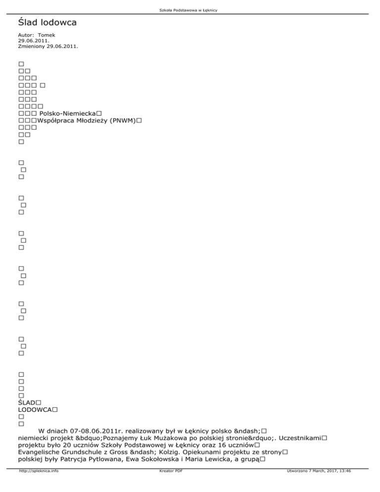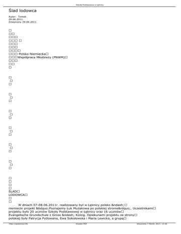Szkoła Podstawowa w Łęknicy Ślad lodowca Autor: Tomek 29.06.2011. Zmieniony 29.06.2011. Polsko-Niemiecka Współpraca Młodzieży (PNWM) ŚLAD LODOWCA W dniach 07-08.06.2011r. realizowany był w Łęknicy polsko – niemiecki projekt „Poznajemy Łuk Mużakowa po polskiej stronie”. Uczestnikami projektu było 20 uczniów Szkoły Podstawowej w Łęknicy oraz 16 uczniów Evangelische Grundschule z Gross – Kolzig. Opiekunami projektu ze strony polskiej były Patrycja Pytlowana, Ewa Sokołowska i Maria Lewicka, a grupą http://spleknica.info Kreator PDF Utworzono 7 March, 2017, 13:46 Szkoła Podstawowa w Łęknicy niemiecką opiekowali się Tassilo Voelz, Angela Schaal i Mike Voigt. Projekt dofinansowany był ze środków Polsko – Niemieckiej Współpracy Młodzieży. Było to czwarte z kolei spotkanie (drugie po stronie polskiej), podczas którego młodzi ludzie poznawali Łuk Mużakowa i jego przyrodniczo – kulturowe zasoby. Podstawą tego poznania był Rezerwat Kulturowy „Park Mużakowski” oraz Park Krajobrazowy „Łuk Mużakowa” – pierwszy Geopark Krajowy w Polsce. Miejscem zakwaterowania obu grup był Hotel „Europa” w Łęknicy. W pierwszym dniu projektu uczestnicy zwiedzali Park Mużakowski. Przewodnikami byli Mirosław Lewicki i Andrzej Marszałek. Park ten znajduje się w centralnej części Łuku Mużakowa, w miejscu gdzie Nysa Łużycka przedziera się wartkim nurtem przez spiętrzoną morenę czołową lodowca. Wysłuchując opowieści o dziele Księcia Pücklera uczniowie kształcili umiejętności obserwacji przyrody i działalności człowieka przekształcającego naturalny krajobraz. Po obiedzie grupy projektowe uczestniczyły w pieszej wycieczce po Pojezierzu Antropogenicznym, która wiodła po planowanej w Parku Krajobrazowym ścieżce geoturystycznej. Wieczorem uczestnicy wzięli udział w pracach sekcji witrażowej, wykonując własne witraże. Po kolacji odbyły się zajęcia plastyczne, podczas których powstawały obrazy z wcześniej odbytych wycieczek. Odbyły się też prezentacje teatralne wcześniej przygotowanych legend o Łuku Mużakowa. W drugim dniu projektu uczestnicy obserwowali wybrane zajęcia edukacyjne w Łęknickiej Szkole (muzyka, język angielski, język niemiecki, religia). Duże wrażenie wywarła wśród uczniów zwiedzana Szkolna Izba Muzealna z gromadzonymi przez uczniów, rodziców i nauczycieli eksponatami. W sali informatycznej obie grupy zaprezentowały wcześniej przygotowane w formie multimedialnej informacje o własnych szkołach i miejscowościach. Przed kolacją odbyły się też rozrywki sportowe oraz zabawy integracyjne. Po kolacji podsumowano dwudniowy projekt, wymieniając się wrażeniami i spostrzeżeniami. Nagrodzono uczestników konkursu plastycznego, wręczono pamiątkowe tabliczki i maskotki. Stojąc w kręgu, po puszczeniu „iskry przyjaźni” żegnano się bardzo serdecznie. Wrażenia i niezapomniane momenty z projektu zostały utrwalone na zdjęciach oraz pracach plastycznych dzieci z Polski i Niemiec. Patrycja Pytlowana http://spleknica.info Kreator PDF Utworzono 7 March, 2017, 13:46 Szkoła Podstawowa w Łęknicy http://spleknica.info Kreator PDF Utworzono 7 March, 2017, 13:46