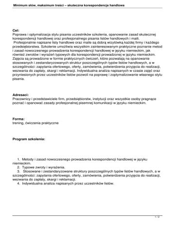 Minimum słów, maksimum treści – skuteczna korespondencja handlowa Cel: Poprawa i optymalizacja stylu pisania uczestników szkolenia, opanowanie zasad skutecznej korespondencji handlowej oraz profesjonalnego pisania listów handlowych i maili. Profesjonalnie napisane listy handlowe oraz maile są dobrą wizytówką każdej firmy i każdego przedsiębiorstwa. Szkolenie umożliwia wszystkim zainteresowanym praktyczne poznanie metod i zasad nowoczesnego prowadzenia korespondencji handlowej w języku niemieckim, jak również zwrotów i wyrażeń typowych dla korespondencji prowadzonej w języku niemieckim. Zajęcia są prowadzone w formie praktycznych ćwiczeń, które pozwalają na opanowanie stosowanych i zestandaryzowanych struktur poszczególnych typów listów handlowych, a w szczególności: zapytania ofertowego, oferty, zamówienia, potwierdzenia przyjęcia do realizacji, wezwania do zapłaty, skargi i reklamacji. Indywidualna analiza napisanych w czasie zajęć oraz przyniesionych przez uczestników listów pozwoli na poprawę i zoptymalizowanie własnego stylu pisania. Adresaci: Pracownicy i przedstawiciele firm, przedsiębiorstw, instytucji oraz wszystkie osoby pragnące poznać i opanować zasady profesjonalnej pisemnej komunikacji w języku niemieckim. Forma: trening, ćwiczenia praktyczne Program szkolenia: 1. Metody i zasad nowoczesnego prowadzenia korespondencji handlowej w języku niemieckim. 2. Typowe zwroty i wyrażenia. 3. Stosowane i zestandaryzowane struktury poszczególnych typów listów handlowych, a w szczególności: zapytania ofertowego, oferty, zamówienia, potwierdzenia przyjęcia do realizacji, wezwania do zapłaty, skargi i reklamacji. 4. Indywidualna analiza napisanych przez uczestników listów. 1/2 Minimum słów, maksimum treści – skuteczna korespondencja handlowa Program szkolenia obejmuje 15h Powrót 2/2