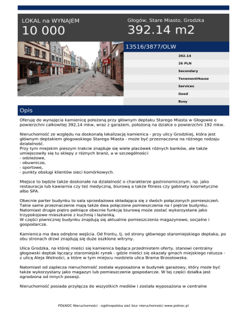 LOKAL na WYNAJEM 10 000 Głogów, Stare Miasto, Grodzka 392.14 m2 13516/3877/OLW 392.14 26 PLN Secondary TenementHouse Services Good Busy Opis Oferuję do wynajęcia kamienicę położoną przy głównym deptaku Starego Miasta w Głogowie o powierzchni całkowitej 392,14 mkw, wraz z garażem, położoną na działce o powierzchni 192 mkw. Nieruchomość ze względu na doskonałą lokalizację kamienica - przy ulicy Grodzkiej, która jest głównym deptakiem głogowskiego Starego Miasta - może być przeznaczona na różnego rodzaju działalność. Przy tym miejskim pieszym trakcie znajduje się wiele placówek różnych banków, ale także umiejscowiły się tu sklepy z różnych branż, a w szczególności: - odzieżowe, - obuwnicze, - sportowe, - punkty obsługi klientów sieci komórkowych. Miejsce to będzie także doskonałe na działalność o charakterze gastronomicznym, np. jako restauracja lub kawiarnia czy też medyczną, biurową a także fitness czy gabinety kosmetyczne albo SPA. Obecnie parter budynku to sala sprzedażowa składająca się z dwóch połączonych pomieszczeń. Takie same przeznaczenie mają także dwa połączone pomieszczenia na I piętrze budynku. Natomiast drugie piętro pełniące obecnie funkcję biurową może zostać wykorzystane jako trzypokojowe mieszkanie z kuchnią i łazienką. W części piwnicznej budynku znajdują się aktualnie pomieszczenia magazynowe, socjalne i gospodarcze. Kamienica ma dwa odrębne wejścia. Od frontu, tj. od strony głównego staromiejskiego deptaka, po obu stronach drzwi znajdują się duże oszklone witryny. Ulica Grodzka, na której mieści się kamienica będąca przedmiotem oferty, stanowi centralny głogowski deptak łączący staromiejski rynek - gdzie mieści się okazały gmach miejskiego ratusza z ulicą Aleja Wolności, a które w tym miejscu rozdziela ulica Brama Brzostowska. Natomiast od zaplecza nieruchomość została wyposażona w budynek garażowy, który może być także wykorzystany jako magazyn lub pomieszczenie gospodarcze. W tej części działka jest ogrodzona od innych posesji. Nieruchomość posiada przyłącza do wszystkich mediów i została wyposażona w centralne PÓŁNOC Nieruchomości - ogólnopolska sieć biur nieruchomości www.polnoc.pl ogrzewanie gazowe. Nieruchomość może być także obiektem sprzedaży w cenie 1.056.098 zł netto. Zainteresowanych ofertą zapraszam do kontaktu. Maciej Junke tel. 797333591 licencja 14052 e-mail: [email protected] Zapraszam do naszego biura w Głogowie przy ul. Grodzkiej 35 (wejście od ul. Garncarskiej), www.polnoc.pl/glogow Więcej ofert znajdziesz na naszej stronie www.polnoc.pl * UWAGA! Zamieszczone na naszych stronach oferty nie stanowią oferty w rozumieniu Kodeksu Cywilnego, a dane w nich zawarte mają jedynie charakter informacyjny. Maciej Junke tel. 797-333-591 email: [email protected] PÓŁNOC Nieruchomości - ogólnopolska sieć biur nieruchomości www.polnoc.pl Powered by TCPDF (www.tcpdf.org)