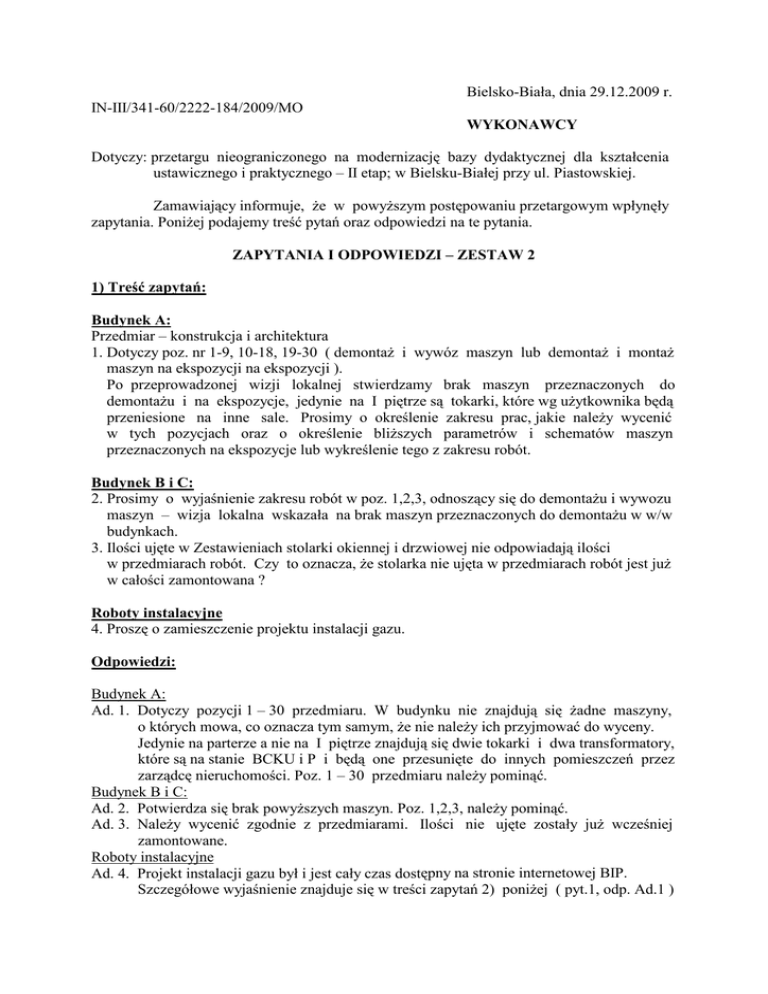 Bielsko-Biała, dnia 29.12.2009 r. IN-III/341-60/2222-184/2009/MO WYKONAWCY Dotyczy: przetargu nieograniczonego na modernizację bazy dydaktycznej dla kształcenia ustawicznego i praktycznego – II etap; w Bielsku-Białej przy ul. Piastowskiej. Zamawiający informuje, Ŝe w powyŜszym postępowaniu przetargowym wpłynęły zapytania. PoniŜej podajemy treść pytań oraz odpowiedzi na te pytania. ZAPYTANIA I ODPOWIEDZI – ZESTAW 2 1) Treść zapytań: Budynek A: Przedmiar – konstrukcja i architektura 1. Dotyczy poz. nr 1-9, 10-18, 19-30 ( demontaŜ i wywóz maszyn lub demontaŜ i montaŜ maszyn na ekspozycji na ekspozycji ). Po przeprowadzonej wizji lokalnej stwierdzamy brak maszyn przeznaczonych do demontaŜu i na ekspozycje, jedynie na I piętrze są tokarki, które wg uŜytkownika będą przeniesione na inne sale. Prosimy o określenie zakresu prac, jakie naleŜy wycenić w tych pozycjach oraz o określenie bliŜszych parametrów i schematów maszyn przeznaczonych na ekspozycje lub wykreślenie tego z zakresu robót. Budynek B i C: 2. Prosimy o wyjaśnienie zakresu robót w poz. 1,2,3, odnoszący się do demontaŜu i wywozu maszyn – wizja lokalna wskazała na brak maszyn przeznaczonych do demontaŜu w w/w budynkach. 3. Ilości ujęte w Zestawieniach stolarki okiennej i drzwiowej nie odpowiadają ilości w przedmiarach robót. Czy to oznacza, Ŝe stolarka nie ujęta w przedmiarach robót jest juŜ w całości zamontowana ? Roboty instalacyjne 4. Proszę o zamieszczenie projektu instalacji gazu. Odpowiedzi: Budynek A: Ad. 1. Dotyczy pozycji 1 – 30 przedmiaru. W budynku nie znajdują się Ŝadne maszyny, o których mowa, co oznacza tym samym, Ŝe nie naleŜy ich przyjmować do wyceny. Jedynie na parterze a nie na I piętrze znajdują się dwie tokarki i dwa transformatory, które są na stanie BCKU i P i będą one przesunięte do innych pomieszczeń przez zarządcę nieruchomości. Poz. 1 – 30 przedmiaru naleŜy pominąć. Budynek B i C: Ad. 2. Potwierdza się brak powyŜszych maszyn. Poz. 1,2,3, naleŜy pominąć. Ad. 3. NaleŜy wycenić zgodnie z przedmiarami. Ilości nie ujęte zostały juŜ wcześniej zamontowane. Roboty instalacyjne Ad. 4. Projekt instalacji gazu był i jest cały czas dostępny na stronie internetowej BIP. Szczegółowe wyjaśnienie znajduje się w treści zapytań 2) poniŜej ( pyt.1, odp. Ad.1 ) 2) Treść zapytań: dot. sporządzenia wycen ofertowych 1. Prosimy o sprawdzenie i uporządkowanie plików zamieszczonych na stronie internetowej i przesunięcie terminu otwarcia ofert w celu umoŜliwienia wykonawcom zapoznanie się z zakresem dokumentacji projektowej i specyfikacji, aktualnie na stronie panuje zamęt, który uniemoŜliwia pobranie właściwego pliku i jego analizę. 2. Czy odpowiedzi Zamawiającego na pytania zadane przez wykonawców zostaną zamieszczone na stronie internetowej w miejscu gdzie znajduje się dokumentacja ? 3. Prosimy o podanie szacunkowej wartości brutto przedmiotowego zamówienia; 4. Czy naleŜność za uzyskany złom ze zdemontowanych maszyn podlega rozliczeniu z Zamawiającym, czy wykonawca ma obowiązek odliczyć w ofercie konkretną kwotę – prosimy o wskazanie pozycji kosztorysu ofertowego oraz kwoty w zł; 5. Czy gruz z rozbiórek pozostaje do dyspozycji wykonawcy ? 6. W poz. 322 – Bud.A. – zapisano w opisie poz. iŜ odległość wywozu gruzu „skorygować po uzgodnieniu z Inwestorem” – prosimy o uściślenie, o jakie uzgodnienia chodzi, czy w ofercie naleŜy ująć krotność podaną w przedmiarze. 7. Czy Zamawiający dysponuje szczegółowym opisem, inwentaryzacją maszyn do demontaŜu - prosimy o zamieszczenie na stronie niezbędnych informacji, szczegółowej specyfikacji, pozwalających wykonawcom na właściwą wycenę robót demontaŜowych w zakresie istniejącego wyposaŜenia obiektów; Odpowiedzi: Ad. 1. W skutek problemów technicznych związanych ze zmianą wersji Biuletynu Informacji Publicznej, w dniu 24-11-2009 zostały wymieszane opisy, od punktu 7 do 13 i 15, plików załączonych do ogłoszenia. Spowodowało to wraŜenie opisanego w zapytaniu bałaganu. Przez cały czas pliki były moŜliwe do pobrania i po pobraniu do analizy. Poprawienie opisów nastąpiło parę godzin po zgłoszeniu problemu, tak więc, według oceny Zamawiającego, nie wpłynęło to w sposób znaczący na czas zapoznania się z zakresem dokumentacji. Ad. 2. Tak – odpowiedzi na pytania zadane przez wykonawców zostaną zamieszczone na stronie internetowej – Biuletyn Informacji Publicznej Urzędu Miejskiego w miejscu gdzie znajduje się dokumentacja. Ad. 3. Szacunkowa wartość netto przedmiotowego zadania została określona w zapytaniach i odpowiedziach – zestaw 1, treść zapytań 1) pyt. 2, odp. Ad. 2 ). Ad. 4. Brak maszyn. Pytanie nieaktualne. Ad. 5. Tak – gruz z rozbiórek pozostaje do dyspozycji wykonawcy. Ad. 6. Tak – w ofercie naleŜy ująć krotność podaną w przedmiarze. Ad. 7. Maszyny zostały sprzedane przez Bielską Szkołę Przemysłową przed terminem przekazania obiektu na rzecz Bielskiego Centrum Kształcenia Ustawicznego i Praktycznego. Pytanie nieaktualne. Z up. PREZYDENTA MIASTA mgr inŜ. Jan Pacia NACZELNIK WYDZIAŁU