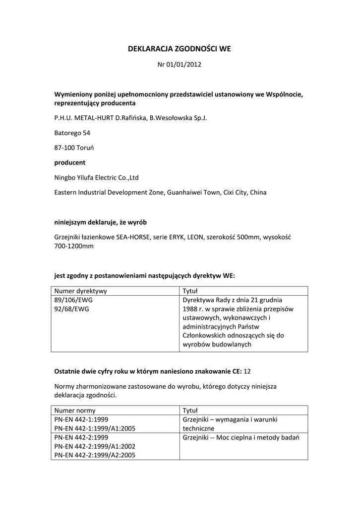 DEKLARACJA ZGODNOŚCI WE Nr 01/01/2012 Wymieniony poniżej upełnomocniony przedstawiciel ustanowiony we Wspólnocie, reprezentujący producenta P.H.U. METAL-HURT D.Rafińska, B.Wesołowska Sp.J. Batorego 54 87-100 Toruń producent Ningbo Yilufa Electric Co.,Ltd Eastern Industrial Development Zone, Guanhaiwei Town, Cixi City, China niniejszym deklaruje, że wyrób Grzejniki łazienkowe SEA-HORSE, serie ERYK, LEON, szerokość 500mm, wysokość 700-1200mm jest zgodny z postanowieniami następujących dyrektyw WE: Numer dyrektywy 89/106/EWG 92/68/EWG Tytuł Dyrektywa Rady z dnia 21 grudnia 1988 r. w sprawie zbliżenia przepisów ustawowych, wykonawczych i administracyjnych Państw Członkowskich odnoszących się do wyrobów budowlanych Ostatnie dwie cyfry roku w którym naniesiono znakowanie CE: 12 Normy zharmonizowane zastosowane do wyrobu, którego dotyczy niniejsza deklaracja zgodności. Numer normy PN-EN 442-1:1999 PN-EN 442-1:1999/A1:2005 PN-EN 442-2:1999 PN-EN 442-2:1999/A1:2002 PN-EN 442-2:1999/A2:2005 Tytuł Grzejniki – wymagania i warunki techniczne Grzejniki -- Moc cieplna i metody badań Nazwa i numer akredytowanej jednostki certyfikującej lub laboratorium oraz numer certyfikatu lub raportu z badań: Istituto Giordano S.p.A., Via Rossini, 2 – 47814 Bellaria-Igea Marina (RN) – Italy Certyfikat nr: 54814/16/52/C Nr raportu: CHIG11111781 Przeznaczenie i zakres stosowania: Grzejniki rurkowe stalowe SEA-HORSE przeznaczone są do ogrzewania pomieszczeń mieszkalnych i pomieszczeń użyteczności publicznej, w tym wychowawczooświatowych, służby zdrowia, usługowych i przemysłowych, w tym branży spożywczej (o normalnej wilgotności powietrza, tzn. takich, w których nie występuje oddziaływanie środków korozyjnych). Grzejniki należy stosować w instalacjach wodnych systemu zamkniętego, w których woda oraz stykające się z wodą materiały są zgodne z wymogami normy PN-93/C-04607. Instalacja centralnego ogrzewania powinna być odpowietrzona zgodnie z wymogami normy PN-91/B-02420. Deklarowane cechy techniczne typu wyrobu budowlanego: - graniczne parametry stosowania: max. ciśnienie robocze: do 1 Mpa max. temperatura wody zasilającej: do 95°C - moc cieplna grzejnika (75°/65°/20°C) ERYK Moc (W) ϕ XGL011/B 363 2,34ΔT1,29 XGL012/B 487 3,14ΔT1,29 XGL013/B 600 3,86ΔT1,29 XGL011/C 254 1,64ΔT1,29 XGL012/C 341 2,20ΔT1,29 XGL013/C 420 2,71ΔT1,29 LEON Moc (W) ϕ XGL021/B 410 2,64ΔT1,29 XGL022/B 580 3,73ΔT1,29 XGL023/B 750 4,83ΔT1,29 XGL021/C 287 1,85ΔT1,29 XGL022/C 406 2,62ΔT1,29 XGL023/C 525 3,38ΔT1,29 Toruń, 04.01.2012