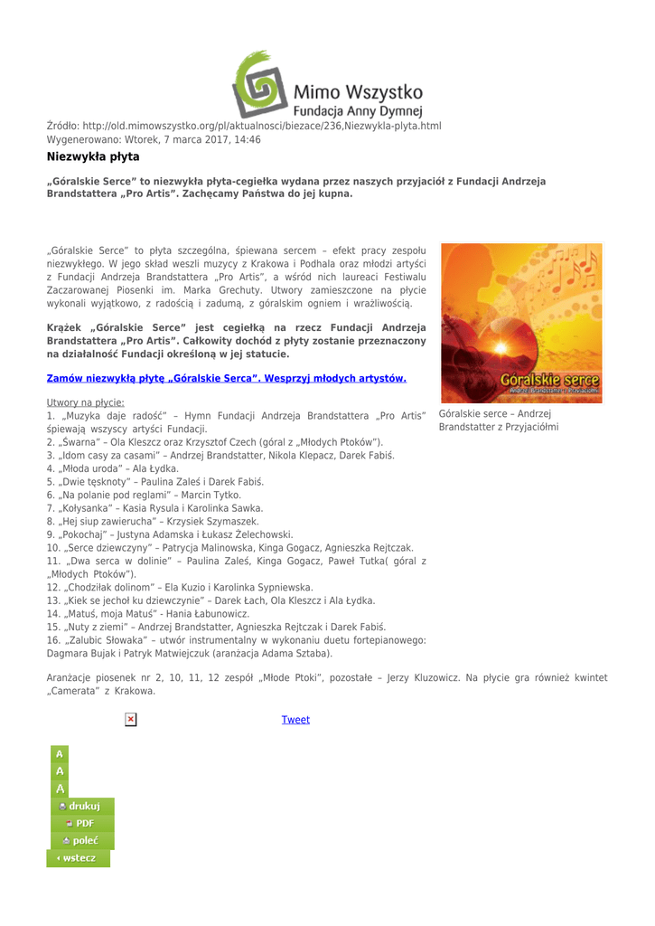 Źródło: http://old.mimowszystko.org/pl/aktualnosci/biezace/236,Niezwykla-plyta.html Wygenerowano: Wtorek, 7 marca 2017, 14:46 Niezwykła płyta „Góralskie Serce” to niezwykła płyta-cegiełka wydana przez naszych przyjaciół z Fundacji Andrzeja Brandstattera „Pro Artis”. Zachęcamy Państwa do jej kupna. „Góralskie Serce” to płyta szczególna, śpiewana sercem – efekt pracy zespołu niezwykłego. W jego skład weszli muzycy z Krakowa i Podhala oraz młodzi artyści z Fundacji Andrzeja Brandstattera „Pro Artis”, a wśród nich laureaci Festiwalu Zaczarowanej Piosenki im. Marka Grechuty. Utwory zamieszczone na płycie wykonali wyjątkowo, z radością i zadumą, z góralskim ogniem i wrażliwością. Krążek „Góralskie Serce” jest cegiełką na rzecz Fundacji Andrzeja Brandstattera „Pro Artis”. Całkowity dochód z płyty zostanie przeznaczony na działalność Fundacji określoną w jej statucie. Zamów niezwykłą płytę „Góralskie Serca”. Wesprzyj młodych artystów. Utwory na płycie: 1. „Muzyka daje radość” – Hymn Fundacji Andrzeja Brandstattera „Pro Artis” śpiewają wszyscy artyści Fundacji. 2. „Śwarna” – Ola Kleszcz oraz Krzysztof Czech (góral z „Młodych Ptoków”). 3. „Idom casy za casami” – Andrzej Brandstatter, Nikola Klepacz, Darek Fabiś. 4. „Młoda uroda” – Ala Łydka. 5. „Dwie tęsknoty” – Paulina Zaleś i Darek Fabiś. 6. „Na polanie pod reglami” – Marcin Tytko. 7. „Kołysanka” – Kasia Rysula i Karolinka Sawka. 8. „Hej siup zawierucha” – Krzysiek Szymaszek. 9. „Pokochaj” – Justyna Adamska i Łukasz Żelechowski. 10. „Serce dziewczyny” – Patrycja Malinowska, Kinga Gogacz, Agnieszka Rejtczak. 11. „Dwa serca w dolinie” – Paulina Zaleś, Kinga Gogacz, Paweł Tutka( góral z „Młodych Ptoków”). 12. „Chodziłak dolinom” – Ela Kuzio i Karolinka Sypniewska. 13. „Kiek se jechoł ku dziewczynie” – Darek Łach, Ola Kleszcz i Ala Łydka. 14. „Matuś, moja Matuś” - Hania Łabunowicz. 15. „Nuty z ziemi” – Andrzej Brandstatter, Agnieszka Rejtczak i Darek Fabiś. 16. „Zalubic Słowaka” – utwór instrumentalny w wykonaniu duetu fortepianowego: Dagmara Bujak i Patryk Matwiejczuk (aranżacja Adama Sztaba). Góralskie serce – Andrzej Brandstatter z Przyjaciółmi Aranżacje piosenek nr 2, 10, 11, 12 zespół „Młode Ptoki”, pozostałe – Jerzy Kluzowicz. Na płycie gra również kwintet „Camerata” z Krakowa. Tweet