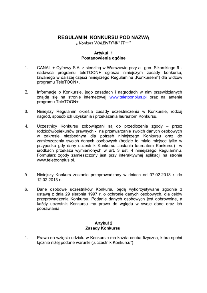 REGULAMIN KONKURSU POD NAZWĄ „ Konkurs WALENTYNKI TT+” Artykuł 1 Postanowienia ogólne 1. CANAL + Cyfrowy S.A. z siedzibą w Warszawie przy al. gen. Sikorskiego 9 nadawca programu teleTOON+ ogłasza niniejszym zasady konkursu, (zwanego w dalszej części niniejszego Regulaminu „Konkursem”) dla widzów programu TeleTOON+. 2. Informacje o Konkursie, jego zasadach i nagrodach w nim przewidzianych znajdą się na stronie internetowej www.teletoonplus.pl oraz na antenie programu TeleTOON+. 3. Niniejszy Regulamin określa zasady uczestniczenia w Konkursie, rodzaj nagród, sposób ich uzyskania i przekazania laureatom Konkursu. 4. Uczestnicy Konkursu zobowiązani są do przedłożenia zgody – przez rodziców/opiekunów prawnych - na przetwarzanie swoich danych osobowych w zakresie niezbędnym dla potrzeb niniejszego Konkursu oraz do zamieszczenia swoich danych osobowych (będzie to miało miejsce tylko w przypadku gdy dany uczestnik Konkursu zostania laureatem Konkursu) w środkach przekazu wymienionych w art. 3 ust. 4 niniejszego Regulaminu. Formularz zgody zamieszczony jest przy interaktywnej aplikacji na stronie www.teletoonplus.pl. 5. Niniejszy Konkurs zostanie przeprowadzony w dniach od 07.02.2013 r. do 12.02.2013 r. 6. Dane osobowe uczestników Konkursu będą wykorzystywane zgodnie z ustawą z dnia 29 sierpnia 1997 r. o ochronie danych osobowych, dla celów przeprowadzenia Konkursu. Podanie danych osobowych jest dobrowolne, a każdy uczestnik Konkursu ma prawo do wglądu w swoje dane oraz ich poprawiania Artykuł 2 Zasady Konkursu 1. Prawo do wzięcia udziału w Konkursie ma każda osoba fizyczna, która spełni łącznie niżej podane warunki („uczestnik Konkursu”) : a) jest widzem programu www.teletoonplus.pl teleTOON+ – i użytkownikiem strony b) ma więcej niż 5 lat i mniej niż 13 lat w chwili rozpoczęcia Konkursu c) za pośrednictwem interaktywnej aplikacji zamieszczonej na stronie www.teletoonplus.pl przygotuje kartę walentynkową wraz z życzeniami oraz poda w terminie od 7.02.2013 do 12.02.2013 imię, nazwisko, adres korespondencyjny oraz wiek uczestnika Konkursu d) Uczestnicy Konkursu zobowiązani są do przedłożenia zgody – przez rodziców/ opiekunów prawnych na publikację zgłoszonego rysunku o którym mowa w art. 2 ust. 1(c) na stronie www.teletoonplus.pl. Formularz zgody zamieszczony jest na stronie www.teletoonplus.pl 2. Uczestnikami Konkursu nie mogą być członkowie rodzin pracowników Organizatora Konkursu 3. Zgłoszone Kartki zostaną opublikowane na stronie www.teletoonplus.pl 4. 45 autorów najciekawszych życzeń walentynkowych zdaniem komisji konkursowej teleTOON+ zostanie Laureatami Konkursu i zostanie nagrodzonych nagrodami głównymi. 5. Wszystkie zgłoszone kartki walentynkowe wraz z życzeniami zostaną poddane głosowaniu internautów. 55 autorów kartek które zbiorą najwięcej głosów internautów zostanie Laureatami konkursu i otrzyma nagrody dodatkowe. 6. Życzenia walentynkowe nagrodzone przez komisję konkursową zostaną wyemitowane na antenie teleTOON+ w dniu 14.02.2013. Artykuł 3 Nagrody 1. Nagrodami głównymi w Konkursie są: zestawy 3 książek z serii „Przygody Mikołajka” + koszulka TeleTOON+ Nagrodami dodatkowymi w Konkursie są: koszulka TeleTOON+ 2. Nagrody zostaną przyznane od 15.02.2012 do 28.02.2013 r. Wybór laureatów nastąpi w siedzibie Organizatora Konkursu. 3. Informacja o Laureatach Konkursu zostanie zamieszczona od dnia 28 lutego 2013 r. na stronie internetowej www.teletoonplus.pl 4. Nagrody zostaną dostarczone Laureatom Konkursu za pośrednictwem poczty w terminie 60 dni od dnia ich przyznania. 5. Ewentualny podatek dochodowy od Nagrody uiszcza Laureat Konkursu. W przypadku, gdy zgodnie z obowiązującymi przepisami prawa powstałą konieczność zapłaty podatku od nagrody, warunkiem jej wydania jest wpłata podatku na rzecz Organizatora Konkursu. 6. Każdy Laureat Konkursu spełniający przesłanki określone w niniejszym Regulaminie ma prawo tylko do jednej Nagrody 7. Laureaci Konkursu nie mają prawa do żądania wypłaty pieniężnego ekwiwalentu Nagrody. Artykuł 4 Reklamacje 1. Reklamacje dotyczące spraw związanych z Konkursem należy składać do Organizatora Konkursu w terminie 30 dni od daty wyłonienia zwycięzców bezpośrednio do biura Organizatora Konkursu lub listem poleconym ( w tym przypadku decyduje data stempla pocztowego). 2. Reklamacje przesłane po upływie terminu określonego w ust. 1 niniejszego artykułu nie będą rozpatrywane. 3. Opisane wyżej reklamacje rozpatrywane będą przez Organizatora Konkursu w terminie 30 dni od daty ich otrzymania. Decyzja Organizatora Konkursu w sprawie reklamacji będzie ostateczna. Artykuł 5 Przechowywanie dokumentacji Dokumentacja związana z przeprowadzeniem Konkursu przechowywana będzie przez organizatora Konkursu przez okres 1 roku od daty wyłonienia zwycięzców, poza dokumentacją, która zgodnie z obowiązującymi przepisami prawa musi być przechowywana przez dłuższy, określony tymi przepisami, okres czasu. Warszawa, dnia 1.02.2013 r. W imieniu CANAL + Cyfrowy S.A ___________________________