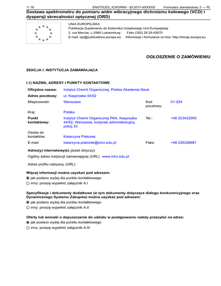 1/ 18 ENOTICES_ICHOPAN - ID:2011-XXXXXX Formularz standardowy 2 — PL Dostawa spektrometru do pomiaru widm wibracyjnego dichroizmu kołowego (VCD) i dyspersji skrecalności optycznej (ORD) UNIA EUROPEJSKA Publikacja Suplementu do Dziennika Urzędowego Unii Europejskiej 2, rue Mercier, L-2985 Luksemburg Faks (352) 29 29-42670 E-mail: [email protected] Informacje i formularze on-line: http://simap.europa.eu OGŁOSZENIE O ZAMÓWIENIU SEKCJA I: INSTYTUCJA ZAMAWIAJĄCA I.1) NAZWA, ADRESY I PUNKTY KONTAKTOWE Oficjalna nazwa: Instytut Chemii Organicznej, Polska Akademia Nauk Adres pocztowy: ul. Kasprzaka 44/52 Miejscowość: Warszawa Kraj: Polska Punkt kontaktowy: Instytut Chemii Organicznej PAN, Kasprzaka 44/52, Warszawa, budynek administracyjny, pokój 33 Osoba do kontaktów: Katarzyna Piskorek E-mail: [email protected] Kod pocztowy: 01-224 Tel.: +48 223432050 Faks: +48 226326681 Adres(y) internetowy(e) (jeżeli dotyczy) Ogólny adres instytucji zamawiającej (URL): www.icho.edu.pl Adres profilu nabywcy (URL): Więcej informacji można uzyskać pod adresem: jak podano wyżej dla punktu kontaktowego inny: proszę wypełnić załącznik A.I Specyfikacje i dokumenty dodatkowe (w tym dokumenty dotyczące dialogu konkurencyjnego oraz Dynamicznego Systemu Zakupów) można uzyskać pod adresem: jak podano wyżej dla punktu kontaktowego inny: proszę wypełnić załącznik A.II Oferty lub wnioski o dopuszczenie do udziału w postępowaniu należy przesyłać na adres: jak podano wyżej dla punktu kontaktowego inny: proszę wypełnić załącznik A.III 2/ 18 ENOTICES_ICHOPAN - ID:2011-XXXXXX Formularz standardowy 2 — PL Dostawa spektrometru do pomiaru widm wibracyjnego dichroizmu kołowego (VCD) i dyspersji skrecalności optycznej (ORD) I.2) RODZAJ INSTYTUCJI ZAMAWIAJĄCEJ I GŁÓWNY PRZEDMIOT LUB PRZEDMIOTY DZIAŁALNOŚCI Ministerstwo lub inny organ krajowy lub federalny, w tym jednostki regionalne i lokalne Agencja/Urząd krajowy lub federalny Ogólne usługi publiczne Organ władzy regionalnej lub lokalnej Środowisko Agencja/Urząd regionalny lub lokalny Podmiot prawa publicznego Instytucja/agencja europejska lub organizacja międzynarodowa Inne (proszę określić): państwowa placówka naukowa Obrona Porządek i bezpieczeństwo publiczne Sprawy gospodarcze i finansowe Zdrowie Budownictwo i obiekty komunalne Ochrona socjalna Rekreacja, kultura i religia Edukacja Inne (proszę określić): prace badawczo-rozwojowe w dziedzinie nauk chemicznych Instytucja zamawiająca dokonuje zakupu w imieniu innych instytucji zamawiających: tak nie 3/ 18 ENOTICES_ICHOPAN - ID:2011-XXXXXX Formularz standardowy 2 — PL Dostawa spektrometru do pomiaru widm wibracyjnego dichroizmu kołowego (VCD) i dyspersji skrecalności optycznej (ORD) SEKCJA II: PRZEDMIOT ZAMÓWIENIA II.1) OPIS II.1.1) Nazwa nadana zamówieniu przez instytucję zamawiającą Dostawa spektrometru do pomiaru widm wibracyjnego dichroizmu kołowego (VCD) i dyspersji skrecalności optycznej (ORD) II.1.2) Rodzaj zamówienia oraz lokalizacja robót budowlanych, miejsce realizacji dostawy lub świadczenia usług (Wybrać wyłącznie jedną kategorię – roboty budowlane, dostawy lub usługi – która najbardziej odpowiada konkretnemu przedmiotowi zamówienia lub zakupu) a) Roboty budowlane Wykonanie b) Dostawy Kupno Zaprojektowanie i wykonanie Dzierżawa Wykonanie, za pomocą dowolnych środków, obiektu budowlanego, odpowiadającego wymogom określonym przez instytucję zamawiającą Najem c) Usługi Kategoria usługi: nr (dla usług kategorii 1-27 zob. załącznik II do dyrektywy 2004/18/ WE) Leasing Połączenie powyższych form Główne miejsce lub lokalizacja robót budowlanych Główne miejsce realizacji dostawy Główne miejsce świadczenia usług Instytut Chemii Organicznej PAN, Warszawa, ul. Kasprzaka 44/52 Kod NUTS PL127 II.1.3) Ogłoszenie dotyczy Zamówienia publicznego Zawarcia umowy ramowej Utworzenia dynamicznego systemu zakupów (DSZ) II.1.4) Informacje na temat umowy ramowej (jeżeli dotyczy) Umowa ramowa z kilkoma wykonawcami Umowa ramowa z jednym wykonawcą Liczba LUB, jeżeli dotyczy,maksymalna liczba uczestników planowanej umowy ramowej Czas trwania umowy ramowej: Okres w latach: lub miesiącach: Uzasadnienie dla umowy ramowej, której czas trwania przekracza okres czterech lat: Szacunkowa całkowita wartość zakupów w całym okresie obowiązywania umowy ramowej (jeżeli dotyczy; podać wyłącznie dane liczbowe): Szacunkowa wartość bez VAT: LUB Zakres: między Waluta: a Waluta: Częstotliwość oraz wartość zamówień, które zostaną udzielone (jeżeli możliwe do określenia):: 4/ 18 ENOTICES_ICHOPAN - ID:2011-XXXXXX Formularz standardowy 2 — PL Dostawa spektrometru do pomiaru widm wibracyjnego dichroizmu kołowego (VCD) i dyspersji skrecalności optycznej (ORD) II.1.5) Krótki opis zamówienia lub zakupu(ów) Przedmiotem Zamówienia jest dostawa spektrometru do pomiaru widm wibracyjnego dichroizmu kołowego (VCD) i dyspersji skręcalności optycznej (ORD) wraz z niezbędnym wyposażeniem do wskazanego pomieszczenia w siedzibie Zamawiającego, jego instalacja oraz uruchomienie, a także przeszkolenie użytkowników w zakresie jego obsługi i eksploatacji. Przedmiot Zamówienia podzielony został na dwie części. 5/ 18 ENOTICES_ICHOPAN - ID:2011-XXXXXX Formularz standardowy 2 — PL Dostawa spektrometru do pomiaru widm wibracyjnego dichroizmu kołowego (VCD) i dyspersji skrecalności optycznej (ORD) II.1.6) Wspólny Słownik Zamówień (CPV) Słownik główny Główny przedmiot Słownik uzupełniający (jeżeli dotyczy) 38433000 II.1.7) Zamówienie jest objęte Porozumieniem w sprawie zamówień rządowych (GPA) tak nie II.1.8) Podział na części (w celu podania informacji o częściach zamówienia należy wykorzystać załącznik B w liczbie odpowiadającej liczbie części) tak nie Jeżeli tak, oferty należy składać w odniesieniu do (zaznaczyć tylko jedno pole): tylko jednej części jednej lub więcej czę