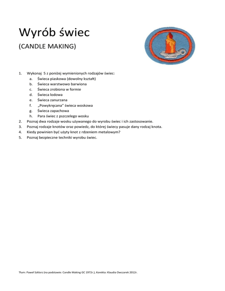Wyrób świec (CANDLE MAKING) 1. 2. 3. 4. 5. Wykonaj 5 z poniżej wymienionych rodzajów świec: a. Świeca piaskowa (dowolny kształt) b. Świeca warstwowo barwiona c. Świeca zrobiona w formie d. Świeca lodowa e. Świeca zanurzana f. „Powykręcana” świeca woskowa g. Świeca zapachowa h. Para świec z pszczelego wosku Poznaj dwa rodzaje wosku używanego do wyrobu świec i ich zastosowanie. Poznaj rodzaje knotów oraz powiedz, do której świecy pasuje dany rodzaj knota. Kiedy powinien być użyty knot z rdzeniem metalowym? Poznaj bezpieczne techniki wyrobu świec. Tłum: Paweł Szklorz (na podstawie: Candle Making GC 1972r.), Korekta: Klaudia Owczarek 2012r.