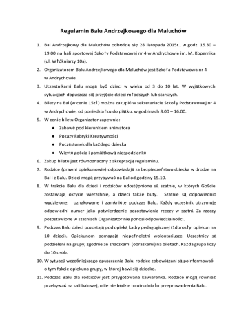 Regulamin Balu Andrzejkowego dla Maluchów 1. Bal Andrzejkowy dla Maluchów odbę dzie się28 listopada 2015r., w godz. 15.30 – 19.00 na hali sportowej Szkoły Podstawowej nr 4 w Andrychowie im. M. Kopernika (ul. Wł ókniarzy 10a). 2. Organizatorem Balu Andrzejkowego dla Maluchów jest Szkoł a Podstawowa nr 4 w Andrychowie. 3. Uczestnikami Balu mogąbyćdzieci w wieku od 3 do 10 lat. W wyją tkowych sytuacjach dopuszcza sięprzyję cie dzieci mł odszych lub starszych. 4. Bilety na Bal (w cenie 15zł ) moż na zakupićw sekretariacie Szkoł y Podstawowej nr 4 w Andrychowie, od poniedział ku do pią tku, w godzinach 8.00 – 16.00. 5. W cenie biletu Organizator zapewnia: ● Zabawępod kierunkiem animatora ● Pokazy Fabryki Kreatywnoś ci ● Poczę stunek dla każ dego dziecka ● Wizytęgoś cia i pamią tkowąniespodziankę 6. Zakup biletu jest równoznaczny z akceptacjąregulaminu. 7. Rodzice (prawni opiekunowie) odpowiadająza bezpieczeń stwo dziecka w drodze na Bal i z Balu. Dzieci mogąprzybywaćna Bal od godziny 15.10. 8. W trakcie Balu dla dzieci i rodziców udostę pnione sąszatnie, w których Goś cie zostawiają okrycie wierzchnie, a dzieci takż e buty. wydzielone, Szatnie są odpowiednio oznakowane i zamknię te podczas Balu. Każ dy uczestnik otrzymuje odpowiedni numer jako potwierdzenie pozostawienia rzeczy w szatni. Za rzeczy pozostawione w szatniach Organizator nie ponosi odpowiedzialnoś ci. 9. Podczas Balu dzieci pozostająpod opiekąkadry pedagogicznej (1dorosł y opiekun na 10 dzieci). Opiekunom pomagają niepeł noletni wolontariusze. Uczestnicy są podzieleni na grupy, zgodnie ze znaczkami (obrazkami) na biletach. Każ da grupa liczy do 10 osób. 10. W sytuacji wcześ niejszego opuszczenia Balu, rodzice zobowią zani sąpoinformować o tym fakcie opiekuna grupy, w której bawi siędziecko. 11. Podczas Balu dla rodziców jest przygotowana kawiarenka. Rodzice mogąrównież przebywaćna sali balowej, o ile nie bę dzie to utrudniał o przeprowadzenia Balu. 12. Zakup biletu i udziałw Balu jest równoznaczny z wyraż eniem zgody na nieodpł atne prawo do rejestracji fotograficznej i filmowej Balu oraz wykorzystanie zarejestrowanego materiał u i wizerunku osób uczestniczą cych w Balu na stronach internetowych i w lokalnych mediach. 13. Rodzice (prawni opiekunowie) ponosząodpowiedzialnoś ćfinansowąza szkody wyrzą dzone przez dziecko podczas Balu.