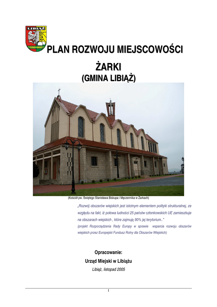 PLAN ROZWOJU MIEJSCOWOŚCI ŻARKI (GMINA LIBIĄŻ) (Kościół pw. Świętego Stanisława Biskupa i Męczennika w Żarkach) „Rozwój obszarów wiejskich jest istotnym elementem polityki strukturalnej, ze względu na fakt, iż połowa ludności 25 państw członkowskich UE zamieszkuje na obszarach wiejskich , które zajmują 90% jej terytorium..” (projekt Rozporządzenia Rady Europy w sprawie wsparcia rozwoju obszarów wiejskich przez Europejski Fundusz Rolny dla Obszarów Wiejskich) Opracowanie: Urząd Miejski w Libiążu Libiąż, listopad 2005 1 Plan Rozwoju Miejscowości Żarki (Gmina Libiąż) _________________________________________________________________________________________________________________ SPIS TREŚCI Rozdział I Idea przygotowania Planu Rozwoju Miejscowości Żarki (PRM)……………………………….. Rozdział II Analiza SWOT dla gminy Libiąż……………………………………………………………………... 3 5 Rozdział III Nawiązanie PRM Żarki do krajowych, regionalnych i gminnych dokumentów strategicznych…............................................................................................................................ 11 Rozdział IV Założenia Planu Rozwoju Miejscowości Żarki...............................………………………………. 4.1. Uwarunkowania formalne...................................................................................................... 4.2. Uzasadnienie potrzeby opracowania planu rozwoju miejscowości ……................................ 4.2.1.Charakterystyka sołectwa Żarki ……………………………………………………………….. 4.3. Beneficjenci planu................................................................................................................. 4.4. Zasięg terytorialny obszaru planu.......................................................................................... 4.5. Horyzont czasowy................................................................................................................. 4.6. Cele PRM i oczekiwane wskaźniki osiągnięć………............................................................ 4.7. Źródła weryfikacji osiągnięć planu………………………………………………………………….. Rozdział V Projekty rozwojowe na terenie sołectwa…............................................................................. 5.1. Szczegółowa charakterystyka projektów rozwojowych......................................................... 5.2.1. Projekty o charakterze odnowy wsi i dziedzictwa kulturowego ......................................... 5.2.2. Projekty rozwojowe rekomendowane do realizacji w latach 2007 – 2013…………………. 5.3. Powiązanie projektów rozwojowych z innymi działaniami realizowanymi na terenie gminy, powiatu, województwa…………………………………………………………………………………… Rozdział VI Plan finansowy PRM… ............................................................................................................... 6.1. Założenia finansowania projektów rozwoju ………………….…………………………………. 6.2. Budżet gminy Libiąż.............................................................................................................. 6.3. Zintegrowany Program Operacyjny Rozwoju Regionalnego na lata 2004 – 2006………….. 6.4. Mechanizm Norweski ……………………………………………………………………………... 6.5. SPO „Restrukturyzacja i modernizacja sektora żywnościowego i rozwój obszarów wiejskich 2004 – 2006. 6.6. Regionalny Program Operacyjny Województwa Małopolskiego na lata 2007 – 2013……….. Zakończenie ……………………………………………………………………………………………... Aneks ……………………………………………………………………………………………………... 2 14 14 14 18 22 22 24 24 25 26 26 28 32 35 38 38 38 41 43 45 46 49 50 Plan Rozwoju Miejscowości Żarki (Gmina Libiąż) _________________________________________________________________________________________________________________ ROZDZIAŁ I IDEA PRZYGOTOWANIA PLANU ROZWOJU MIEJSCOWOŚCI ŻARKI Zalecenia Komisji Europejskiej dotyczą bardziej strategicznego podejścia do rozwoju obszarów wiejskich. Podkreśla się, by strategie formułowane były po konsultacjach z zainteresowanymi i wyznaczały podstawowe wskaźniki wyników oraz pokazywały komplementarność programu rozwoju obszarów wiejskich z innymi politykami UE, a w szczególności z polityką spójności. Zgodnie z przyjętą w czerwcu 2005r. Strategią Rozwoju Obszarów Wiejskich na lata 2007 – 2013 w Polsce realizowany będzie model wielofunkcyjnego rozwoju wsi. Wspieranie zrównoważonego rozwoju obszarów wiejskich nastąpi poprzez różnicowanie działalności w celu zapewnienia alternatywnych źródeł dochodów, kształtowania produkcji rolnej w zgodzie z wymogami środowiska i przy zachowaniu walorów krajobrazowych. Ważną rolę odgrywać będzie również poprawa infrastruktury społecznej i technicznej na terenach wiejskich. Ideą przygotowania planu rozwoju miejscowości jest przede wszystkim włączenie w proces wyznaczania celów rozwoju społeczno-gospodarczego wsi jak najszerszego spektrum odbiorców późniejszych działań. Jest to odpowiedź na stawiane przez dokumenty programowe związane z wdrażaniem funduszy strukturalnych wytyczne, zwłaszcza przez Sektorowy Program Operacyjny „Restrukturyzacja i modernizacja sektora żywnościowego oraz rozwój obszarów wiejskich 2004 – 2006” w zakresie działania 2.3. Odnowa wsi oraz zachowanie i ochrona dziedzictwa kulturowego. Wymogiem jest, by PRM był tworzony przy współudziale partnerów społecznogospodarczych i stanowił istotny wkład w budowę społeczeństwa ob