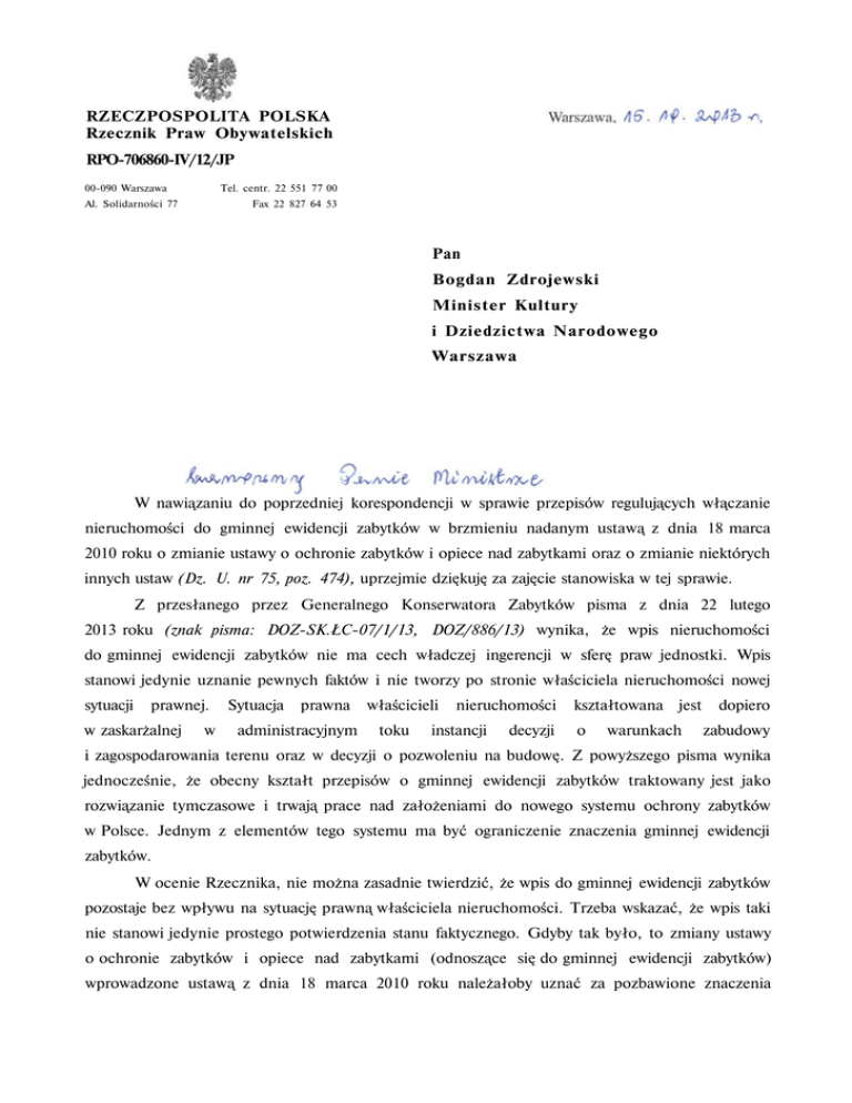 RZECZPOSPOLITA POLSKA Rzecznik Praw Obywatelskich RPO-706860-IV/12/JP 00-090 Warszawa Tel. centr. 22 551 77 00 Al. Solidarności 77 Fax 22 827 64 53 Pan Bogdan Zdrojewski Minister Kultury i Dziedzictwa Narodowego Warszawa W nawiązaniu do poprzedniej korespondencji w sprawie przepisów regulujących włączanie nieruchomości do gminnej ewidencji zabytków w brzmieniu nadanym ustawą z dnia 18 marca 2010 roku o zmianie ustawy o ochronie zabytków i opiece nad zabytkami oraz o zmianie niektórych innych ustaw (Dz. U. nr 75, poz. 474), uprzejmie dziękuję za zajęcie stanowiska w tej sprawie. Z przesłanego przez Generalnego Konserwatora Zabytków pisma z dnia 22 lutego 2013 roku (znak pisma: DOZ-SK.ŁC-07/1/13, DOZ/886/13) wynika, że wpis nieruchomości do gminnej ewidencji zabytków nie ma cech władczej ingerencji w sferę praw jednostki. Wpis stanowi jedynie uznanie pewnych faktów i nie tworzy po stronie właściciela nieruchomości nowej sytuacji prawnej. w zaskarżalnej w Sytuacja prawna administracyjnym właścicieli toku nieruchomości instancji decyzji kształtowana jest o warunkach dopiero zabudowy i zagospodarowania terenu oraz w decyzji o pozwoleniu na budowę. Z powyższego pisma wynika jednocześnie, że obecny kształt przepisów o gminnej ewidencji zabytków traktowany jest jako rozwiązanie tymczasowe i trwają prace nad założeniami do nowego systemu ochrony zabytków w Polsce. Jednym z elementów tego systemu ma być ograniczenie znaczenia gminnej ewidencji zabytków. W ocenie Rzecznika, nie można zasadnie twierdzić, że wpis do gminnej ewidencji zabytków pozostaje bez wpływu na sytuację prawną właściciela nieruchomości. Trzeba wskazać, że wpis taki nie stanowi jedynie prostego potwierdzenia stanu faktycznego. Gdyby tak było, to zmiany ustawy o ochronie zabytków i opiece nad zabytkami (odnoszące się do gminnej ewidencji zabytków) wprowadzone ustawą z dnia 18 marca 2010 roku należałoby uznać za pozbawione znaczenia 2 prawnego, a zatem zbędne. W przekonaniu Rzecznika wpis do gminnej ewidencji zabytków ma wszelkie cechy rozstrzygnięcia deklaratoryjnego, tj. stwierdzającego, że dany obiekt jest zabytkiem i powinien zostać objęty ochroną określoną w przepisach prawa. Rozstrzygnięcie to podejmowane jest w formie współdziałania organu wykonawczego gminy z podmiotem wyspecjalizowanym tj. właściwym wojewódzkim konserwatorem zabytków. Dokonanie wpisu (niezależnie od formy) powinno zostać poprzedzone przeprowadzeniem analizy spełnienia przesłanek określonych w art. 3 pkt 1 ustawy z dnia 23 lipca 2003 roku o ochronie zabytków i opiece nad zabytkami (Dz. U. Nr 162, poz. 1568 ze zm.) (dalej: u.o.z.). Współdziałające organy powinny zatem ocenić, czy nieruchomość objęta wpisem jest, czy nie jest zabytkiem w rozumieniu w/w przepisu. Dokonanie wpisu nie może stanowić dowolnego działania organów administracji publicznej, ponieważ skutkiem wpisu jest znaczące ograniczenie uprawnień właściciela nieruchomości, związanych z wykonywaniem tego prawa. Ograniczenia te zostały szczegółowo opisane w wystąpieniu Rzecznika z dnia 14 listopada 2012 roku. Występowanie tych ograniczeń nie budzi również wątpliwości w najnowszym orzecznictwie sądów administracyjnych, w tym w orzecznictwie Naczelnego Sądu Admnistracyjnego (por. m. in. uzasadnienie postanowienia Naczelnego Sądu Administracyjnego z dnia 14 września 2012 roku, sygn. akt II OSK 1950/12 oraz uzasadnienie wyroku Wojewódzkiego Sądu Administracyjnego w Warszawie z dnia 3 lipca 2013 roku, sygn. akt VII SA/Wa 2653/12). Wpis do gminnej ewidencji nie rozstrzyga (niezależnie od formy tego aktu), czy nieruchomość podlegająca wpisowi jest zabytkiem w rozumieniu art. 3 pkt 1 u.o.z., czy też nie. Nie jest to bowiem decyzja administracyjna, której treścią byłoby zakwalifikowanie danego obiektu jako zabytku w rozumieniu w/w przepisu. Niemniej jednak, nieruchomość wpisana do ewidencji jest w obrocie prawnym traktowana jako zabytek. Skutkiem wpisu jest objęcie nieruchomości ochroną przewidzianą w przepisach prawa. Nie można zgodzić się z tezą że sytuacja prawna właściciela nieruchomości kształtowana jest dopiero w zaskarżalnych w administracyjnym toku instancji decyzjach w sprawie warunków zabudowy, o pozwoleniu na budowę oraz w postanowieniu wojewódzkiego konserwatora zabytków w sprawie uzgodnienia tych decyzji. Postępowania te nie dotyczą w ogóle problemu, czy nieruchomość stanowiąca ich przedmiot jest zabytkiem w rozumieniu art. 3 pkt 1 u.o.z., czy też nie. Pomimo powyższego, wpis do gminnej ewidencji zabytków wpływa na tok tych postępowań, ich długość oraz treść rozstrzygnięcia. Wynika to z faktu, że system ochrony zabytków ma charakter ściśle zinstytucjonalizowany. Skuteczna ochrona konkretnego zabytku (w ogóle możliwość takiej ochrony) zależy od wydania odpowiedniego aktu o charakterze administracyjnym stwierdzającego, że dany obiekt jest zabytkiem w sensie prawa materialnego. W doktrynie podkreśla się, że stosowanie instrumentów ochrony zabytków względem obiektów, które nie są objęte żadną z indywidualizujących zabytek fonu ochrony zabytków jest niedopuszczalne (por. P. Antoniak w: Ustawa o ochronie zabytków 3 i opiece nad zabytkami. Komentarz pod red. M. Cherki. Warszawa 2010). W ocenie Rzecznika tak restrykcyjne stanowisko może zostać uznane za kontrowersyjne z punktu widzenia celów ustawy o ochronie zabytków i opiece nad zabytkami. Niemniej jednak należy z całą pewnością stwierdzić, że indywidualizacja zabytku np. w gminnej ewidencji zabytków umożliwia jego ochronę, ponieważ zakreśla ramy prawne tej ochrony Wpisu do gminnej ewidencji zabytków nie można zatem uznawać za czynność indyferentną z punktu widzenia praw i obowiązków właściciela nieruchomości. Reasumując, ochrona zabytków na podstawie ogólnych przepisów prawa np. art. 1 ust. 1 pkt 4 ustawy z dnia 27 marca 20