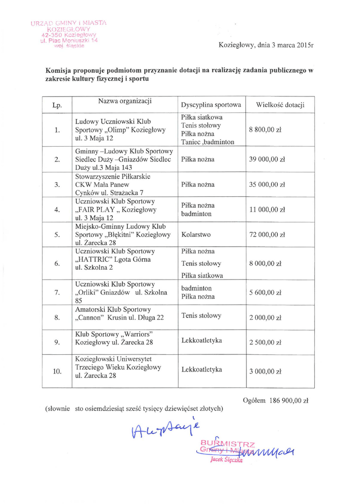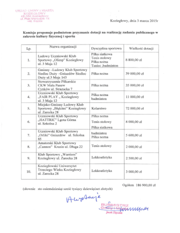URZAG U·l!NV i MI.-".STi\ KOZIFGLOWY 42-350 i<.czieglowy ul. Pl3C fl.'c~iuszki 14 "No.i Kozieglowy, dnia 3 marca 2015r ~i~sl<ie. Komisja proponuje podmiotom przyznanie dotacji na zakresie kultury ftzycznej i sportu Nazwa organizacji Lp. l. 2. 3. 4. 5. 6. Ludowy Uczniowski Klub Sportowy "Olimp" Kozieglowy ul. 3 Maja 12 Gminny - Ludowy Klub Sportowy Siedlec Duzy - Gniazd6w Siedlec Duzy ul.3 Maja 143 Stowarzyszenie Pilkarskie CKW Mala Panew Cynk6w ul. StraZacka 7 Uczniowski Klub Sportowy "FAIR PLAY" Kozieglowy ul. 3 Maja 12 Miejsko-Gminny Ludowy Klub Sportowy "Bl~kitni " Kozieglowy ul. Zarecka 28 Uczniowski Klub Sportowy "HATTRIC" Lgota G6ma ul. Szkolna 2 realizacj~ Dyscyplina sportowa zadania publicznego w Wielkosc dotacji Pilka siatkowa Tenis stolowy Pilka noma Taniec ,badminton 8800,00 zl Pilka nozna 39000,00 zl Pilka nozna 35000,00 zl Pilka nozna badminton 11 000,00 zl Kolarstwo 72 000,00 zl Pilka nozna Tenis stolowy 8000,00 zl Pilka siatkowa 8. Uczniowski Klub Sportowy "OrJiki" Gniazd6w ul. Szkolna 85 Amatorski Klub Sportowy "Cannon" Krusin ul. Dluga 22 9. Klub Sportowy " Warriors" Kozieglowy ul. Zarecka 28 Lekkoatletyka 2500,00 zl Kozieglowski Uniwersytet Trzeciego Wieku Kozieglowy ul. Zarecka 28 Lekkoatletyka 3000,00 zl 7. 10. badminton Pilka nozna 5600,00 zl Tenis stolowy 2000,00 zl Og61em 186 900,00 zl (slownie SI O osiemdziesi<tt szesc tysi«cy dziewi«cset zlotych) \ IA-~~L J~~1'~~cJZi fReek 51fcz/(a