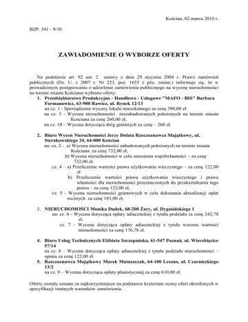 Kościan, 02 marca 2010 r. BZP. 341 - 9/10 ZAWIADOMIENIE O WYBORZE OFERTY Na podstawie art. 92 ust. 2 ustawy z dnia 29 stycznia 2004 r. Prawo zamówień publicznych (Dz. U. z 2007 r. Nr 223, poz. 1655 z póz. zmian.) informuje się, że w prowadzonym postępowaniu o udzielenie zamówienia publicznego na wycenę nieruchomości na terenie miasta Kościana wybrano oferty: 1. Przedsiębiorstwo Produkcyjno - Handlowo - Usługowe "MAFO - BIS" Barbara Formanowicz, 63-900 Rawicz, ul. Rynek 12/13 na cz. 1 - Sporządzenie wyceny lokalu mieszkalnego za cenę 390,00 zł. na cz. 3 - Wycena nieruchomości niezabudowanych położonych na terenie miasta Kościana za cenę 260,00 zł, na cz. 10 – Wycena dotycząca dróg gminnych za cenę – 260 zł. 2. Biuro Wycen Nieruchomości Jerzy Dolata Rzeczoznawca Majątkowy, ul. Sierakowskiego 24, 64-000 Kościan na: cz. 2 - a) Wycena nieruchomości zabudowanych położonych na terenie miasta Kościana za cenę 732,00 zł, b) Wycena nieruchomości w celu zniesienia współwłasności - za cenę 732,00 zł. cz. 4 – a) Przeliczenie wartości prawa użytkowania wieczystego – za cenę 122,00 zł b) Przeliczenie wartości prawa użytkowania wieczystego i prawa własności dla nieruchomości przeznaczonych do przekształcania tego prawa – za cenę 122,00 zł, cz. 5 - Wycena nieruchomości gruntowych w celu dokonania aktualizacji opłat rocznych za cenę 183,00 zł, 3. NIERUCHOMOŚCI Monika Dudek, 68-200 Żary, ul. Dygasińskiego 1 na: cz. 6 - Wycena dotycząca opłaty adiacenckiej z tytułu podziału za cenę 242,78 zł. cz. 7 - Wycena dotycząca opłaty adiacenckiej z tytułu wzrostu wartości nieruchomości za cenę 176,78 zł. 4. Biuro Usług Technicznych Elżbieta Szczepańska, 61-547 Poznań, ul. Wierzbięcice 57/14 na cz. 8 – Wycena dotycząca opłaty adiacenckiej z tytułu podziału nieruchomości – opinia za cenę 122,00 zł. 5. Rzeczoznawca Majątkowy Marek Matuszczak, 64-100 Leszno, ul. Czarnieckiego 13/2 na cz. 9 – Wycena dotycząca opłaty planistycznej za cenę 610,00 zł. Oferty zostały uznane za najkorzystniejsze na podstawie kryterium oceny ofert określonych w specyfikacji istotnych warunków zamówienia. Streszczenie i porównanie złożonych ofert: Firma (nazwa) lub nazwisko oraz adres wykonawcy Biuro Usług Technicznych Elżbieta Szczepańska 61-547 Poznań ul. Wierzbięcice 57/14 Przedsiębiorstwo Produkcyjno-Handlowo Usługowe "MAFO - BIS" Barbara Formanowicz 63-900 Rawicz ul. Rynek 12/13 Biuro Wycen Nieruchomości Jerzy Dolata Rzeczoznawca Majątkowy, ul. Sierakowskiego 24 64-000 Kościan ACRUS Waldemar Bujakowski Ul. Gen. Kutrzeby 1/55 62-010 Pobiedziska Rzeczoznawca Majątkowy Marek Matuszczak 64-100 Leszno ul. Czarnieckiego 13/2 Ilość przyznanych punktów - kryterium ` 100 % cena cz. 1 - ----cz. 2 -------cz. 3 - --------cz. 4 - 53 cz. 5 - 80 cz. 6 - ----cz. 7 – 48,31 cz. 8 - 100,00 Cz. 9- --------Cz. 10 --------cz. 1 – 100 cz. 2 - odrzucona cz. 3 – 100 cz. 4 - odrzucona cz. 5 – 75,00 cz. 6 - 44,00 cz. 7 – 70,71 cz. 8 - -24,40 Cz. 9- 93,85 Cz. 10- 100 cz. 1 – 79,92 cz. 2 -100 cz. 3 – 71,04 cz. 4 - 100 cz. 5 - 100 cz. 6 - -----cz. 7 - 96,00 cz. 8 – ------Cz. 9 --------Cz. 10- ------cz. 1 – ----------cz. 2 –----------cz. 3 – ---------cz. 4 - 52,17 cz. 5 - 61,22 cz. 6 - 36,18 cz. 7 - 74,31 cz. 8 - 41,85 Cz. 9- 90,90 Cz. 10- 23,68 cz. 1 – 79,92 cz. 2 – 57,50 cz. 3 - 85,25 cz. 4 – 50,00 Nieruchomości Monika Dudek cz. 5 - 75,00 cz. 6 - -----------cz. 7 - 96,60 cz. 8 - ----------Cz. 9 - 100 Cz. 10cz. 1 - --------cz. 2 - --------- Kolejność ---------------------------------II III --------VI I -------------I I IV II V IV II I II I III I I -------III ------------------------------- III V III IV III III II II II II IV IV II I -------------------- ul. Dygasińskiego 1 68--200 Żary cz. 3 – 42,71 IV cz. 4 - --------- ------ cz. 5 – 91,96 II cz. 6 - 100 I cz. 7 - 100 I cz. 8 - 83,30 Cz. 9 - -------Cz. 10- ------- H.W. II ---------