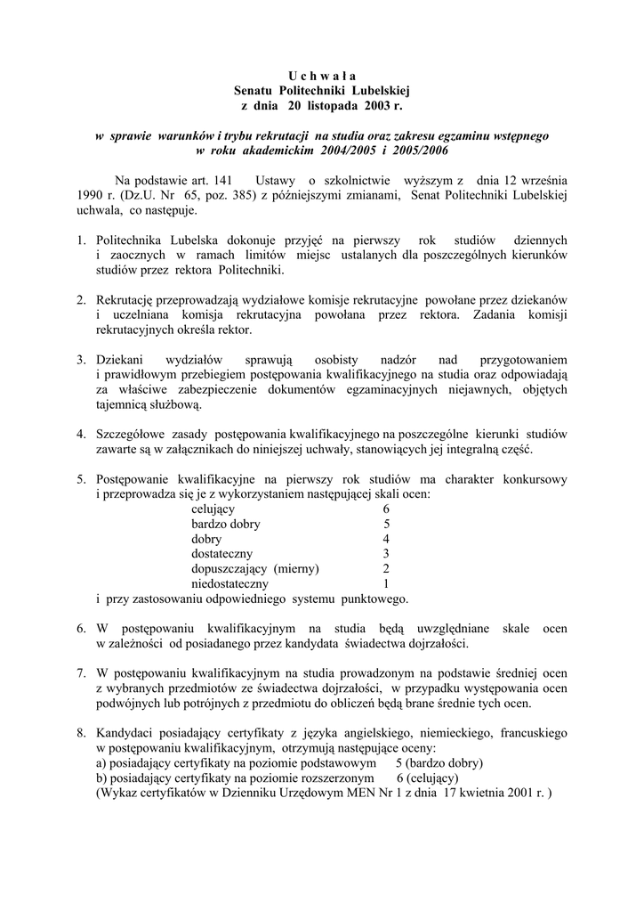 Uchwała Senatu Politechniki Lubelskiej z dnia 20 listopada 2003 r. w sprawie warunków i trybu rekrutacji na studia oraz zakresu egzaminu wstępnego w roku akademickim 2004/2005 i 2005/2006 Na podstawie art. 141 Ustawy o szkolnictwie wyższym z dnia 12 września 1990 r. (Dz.U. Nr 65, poz. 385) z późniejszymi zmianami, Senat Politechniki Lubelskiej uchwala, co następuje. 1. Politechnika Lubelska dokonuje przyjęć na pierwszy rok studiów dziennych i zaocznych w ramach limitów miejsc ustalanych dla poszczególnych kierunków studiów przez rektora Politechniki. 2. Rekrutację przeprowadzają wydziałowe komisje rekrutacyjne powołane przez dziekanów i uczelniana komisja rekrutacyjna powołana przez rektora. Zadania komisji rekrutacyjnych określa rektor. 3. Dziekani wydziałów sprawują osobisty nadzór nad przygotowaniem i prawidłowym przebiegiem postępowania kwalifikacyjnego na studia oraz odpowiadają za właściwe zabezpieczenie dokumentów egzaminacyjnych niejawnych, objętych tajemnicą służbową. 4. Szczegółowe zasady postępowania kwalifikacyjnego na poszczególne kierunki studiów zawarte są w załącznikach do niniejszej uchwały, stanowiących jej integralną część. 5. Postępowanie kwalifikacyjne na pierwszy rok studiów ma charakter konkursowy i przeprowadza się je z wykorzystaniem następującej skali ocen: celujący 6 bardzo dobry 5 dobry 4 dostateczny 3 dopuszczający (mierny) 2 niedostateczny 1 i przy zastosowaniu odpowiedniego systemu punktowego. 6. W postępowaniu kwalifikacyjnym na studia będą uwzględniane w zależności od posiadanego przez kandydata świadectwa dojrzałości. skale ocen 7. W postępowaniu kwalifikacyjnym na studia prowadzonym na podstawie średniej ocen z wybranych przedmiotów ze świadectwa dojrzałości, w przypadku występowania ocen podwójnych lub potrójnych z przedmiotu do obliczeń będą brane średnie tych ocen. 8. Kandydaci posiadający certyfikaty z języka angielskiego, niemieckiego, francuskiego w postępowaniu kwalifikacyjnym, otrzymują następujące oceny: a) posiadający certyfikaty na poziomie podstawowym 5 (bardzo dobry) b) posiadający certyfikaty na poziomie rozszerzonym 6 (celujący) (Wykaz certyfikatów w Dzienniku Urzędowym MEN Nr 1 z dnia 17 kwietnia 2001 r. ) 2 9. Uprawnienia laureatów i finalistów olimpiad przedmiotowych, turniejów i konkursów, przy ubieganiu się o przyjęcie na studia, określa uzupełniona, załączona uchwała Senatu z 21 listopada 2002 r. (tekst jednolity uchwały). 10. Absolwenci szkół średnich posiadający świadectwo uzyskane w systemie Matury Międzynarodowej (International Baccalaureate), którzy zrealizowali kurs matematyki na poziomie zaawansowanym, przyjmowani będą na studia w Politechnice Lubelskiej z pominięciem zasad postępowania kwalifikacyjnego na prowadzone kierunki studiów – z wyjątkiem kierunku architektura i urbanistyka, gdzie obowiązuje egzamin z rysunku. Należy przedłożyć świadectwo w języku polskim poświadczone przez tłumacza przysięgłego. 11. Prawo ubiegania się o przyjęcie na studia w Politechnice Lubelskiej przysługuje również kandydatom kończącym zagraniczną szkołę średnią, jeśli świadectwo jej ukończenia porównywalne jest z polskim świadectwem dojrzałości. Zaświadczenie o powyższym absolwent zagranicznej szkoły średniej może uzyskać w kuratorium oświaty właściwym dla miejsca zamieszkania kandydata. Absolwentów zagranicznych szkół średnich obowiązują takie same zasady rekrutacji jak absolwentów polskich szkół średnich. Kandydaci kończący średnią szkołę za granicą mogą być dopuszczeni do egzaminu wstępnego na podstawie złożonego w obowiązującym terminie zaświadczenia o przystąpieniu do matury wraz z pozostałymi dokumentami. Przyjęcie na studia jest uwarunkowane złożeniem świadectwa dojrzałości do dnia 30 sierpnia. 12. Cudzoziemcy przyjmowani są na studia według odrębnych przepisów. 13. Kandydaci, którzy otrzymali pozytywne wyniki w postępowaniu kwalifikacyjnym a nie zostali przyjęci na pierwszy rok studiów wybranego kierunku i rodzaju studiów, mogą ubiegać się o przyjęcie na inny kierunek studiów. 14. Kandydaci, którzy otrzymali pozytywne wyniki w postępowaniu kwalifikcyjnym w innych uczelniach o zbliżonym zakresie egzaminów mogą ubiegać się o przyjęcie na pierwszy rok studiów w Politechnice Lubelskiej 15. Politechnika Lubelska, poza określonymi limitami miejsc, umożliwia studiowanie w charakterze wolnego słuchacza. Wolnym słuchaczem może zostać kandydat, który spełnił wymagania określone w zasadach rekrutacji na pierwszy rok studiów w Politechnice Lubelskiej lub w innej uczelni o zbliżonych zasadach rekrutacji, a nie został przyjęty z powodu braku miejsc. Liczbę wolnych słuchaczy określa się na około 10% ustalonego limitu miejsc. Udział w zajęciach dydaktycznych w charakterze wolnego słuchacza jest odpłatny, wysokość opłaty ustala rektor. 16. Od kandydatów na pierwszy rok studiów wymagane są następujące dokumenty: - podanie na ustalonym formularzu wraz z życiorysem, 3 - - świadectwo dojrzałości, kandydaci z "nową maturą" również świadectwo ukończenia szkoły, 4 fotografie o wymiarach 37x52 mm, bez nakrycia głowy na jasnym tle, orzeczenie lekarskie stwierdzające u kandydata brak przeciwwskazań do podjęcia studiów na wybranym kierunku, zgodnie z obowiązującymi w tym zakresie przepisami. Kandydat, u którego stwierdzono przeciwwskazania zdrowotne do studiowania na określonym kierunku, nie będzie przyjęty na ten kierunek studiów, pokwitowanie opłaty wnoszonej przez osoby ubiegające się na studia. 17. Kandydaci, ubiegający się o przyjęcie na studia, wnoszą opłatę w wysokości ustalonej przez rektora. Opłata nie podlega zwrotowi. 18. Złożenie przez kandydata dokumentów o przyjęcie na studia w Politechnice Lubelskiej jest równoznaczne z wyrażeniem zgody na umieszczenie jego nazwiska i im