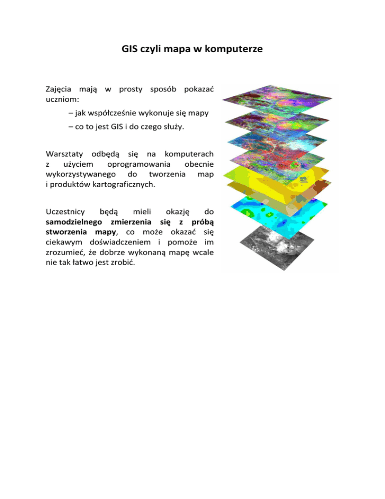 GIS czyli mapa w komputerze Zajęcia mają w prosty sposób pokazać uczniom: – jak współcześnie wykonuje się mapy – co to jest GIS i do czego służy. Warsztaty odbędą się na komputerach z użyciem oprogramowania obecnie wykorzystywanego do tworzenia map i produktów kartograficznych. Uczestnicy będą mieli okazję do samodzielnego zmierzenia się z próbą stworzenia mapy, co może okazać się ciekawym doświadczeniem i pomoże im zrozumieć, że dobrze wykonaną mapę wcale nie tak łatwo jest zrobić.