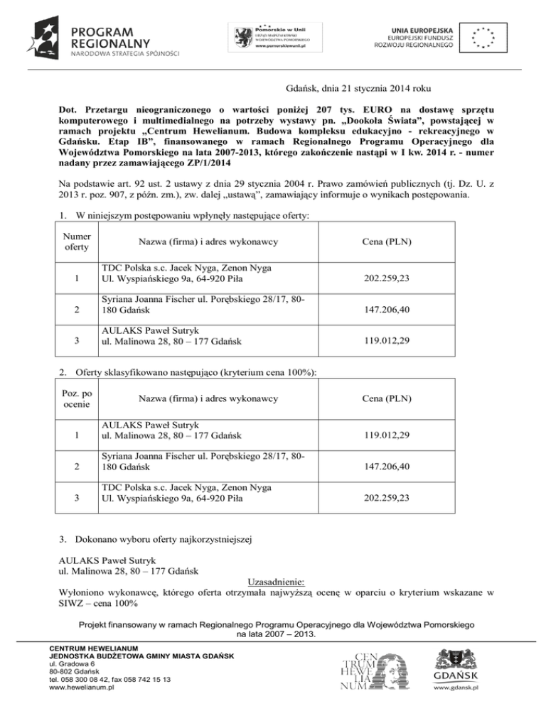Gdańsk, dnia 21 stycznia 2014 roku Dot. Przetargu nieograniczonego o wartości poniżej 207 tys. EURO na dostawę sprzętu komputerowego i multimedialnego na potrzeby wystawy pn. „Dookoła Świata”, powstającej w ramach projektu „Centrum Hewelianum. Budowa kompleksu edukacyjno - rekreacyjnego w Gdańsku. Etap IB”, finansowanego w ramach Regionalnego Programu Operacyjnego dla Województwa Pomorskiego na lata 2007-2013, którego zakończenie nastąpi w I kw. 2014 r. - numer nadany przez zamawiającego ZP/1/2014 Na podstawie art. 92 ust. 2 ustawy z dnia 29 stycznia 2004 r. Prawo zamówień publicznych (tj. Dz. U. z 2013 r. poz. 907, z późn. zm.), zw. dalej „ustawą”, zamawiający informuje o wynikach postępowania. 1. W niniejszym postępowaniu wpłynęły następujące oferty: Numer oferty Nazwa (firma) i adres wykonawcy Cena (PLN) 1 TDC Polska s.c. Jacek Nyga, Zenon Nyga Ul. Wyspiańskiego 9a, 64-920 Piła 202.259,23 2 Syriana Joanna Fischer ul. Porębskiego 28/17, 80180 Gdańsk 147.206,40 3 AULAKS Paweł Sutryk ul. Malinowa 28, 80 – 177 Gdańsk 119.012,29 2. Oferty sklasyfikowano następująco (kryterium cena 100%): Poz. po ocenie Nazwa (firma) i adres wykonawcy Cena (PLN) 1 AULAKS Paweł Sutryk ul. Malinowa 28, 80 – 177 Gdańsk 119.012,29 2 Syriana Joanna Fischer ul. Porębskiego 28/17, 80180 Gdańsk 147.206,40 3 TDC Polska s.c. Jacek Nyga, Zenon Nyga Ul. Wyspiańskiego 9a, 64-920 Piła 202.259,23 3. Dokonano wyboru oferty najkorzystniejszej AULAKS Paweł Sutryk ul. Malinowa 28, 80 – 177 Gdańsk Uzasadnienie: Wyłoniono wykonawcę, którego oferta otrzymała najwyższą ocenę w oparciu o kryterium wskazane w SIWZ – cena 100% Projekt finansowany w ramach Regionalnego Programu Operacyjnego dla Województwa Pomorskiego na lata 2007 – 2013. CENTRUM HEWELIANUM JEDNOSTKA BUDŻETOWA GMINY MIASTA GDAŃSK ul. Gradowa 6 80-802 Gdańsk tel. 058 300 08 42, fax 058 742 15 13 www.hewelianum.pl