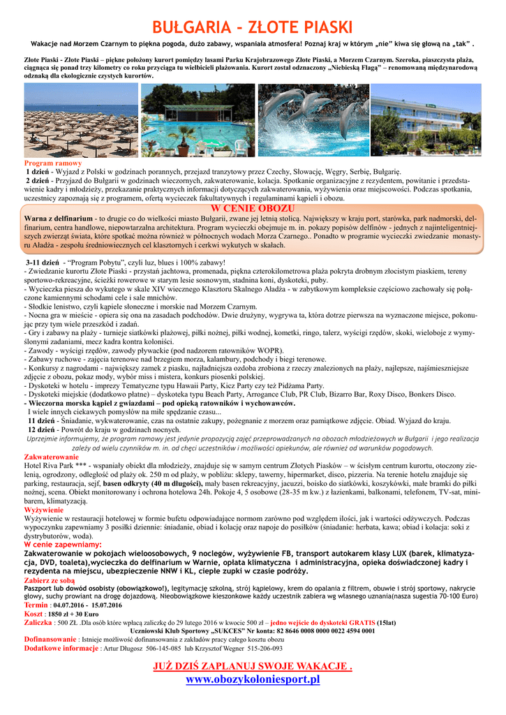 BUŁGARIA - ZŁOTE PIASKI Wakacje nad Morzem Czarnym to piękna pogoda, dużo zabawy, wspaniała atmosfera! Poznaj kraj w którym „nie” kiwa się głową na „tak” . Złote Piaski - Złote Piaski – piękne położony kurort pomiędzy lasami Parku Krajobrazowego Złote Piaski, a Morzem Czarnym. Szeroka, piaszczysta plaża, ciągnąca się ponad trzy kilometry co roku przyciąga tu wielbicieli plażowania. Kurort został odznaczony „Niebieską Flagą” – renomowaną międzynarodową odznaką dla ekologicznie czystych kurortów. Program ramowy 1 dzień - Wyjazd z Polski w godzinach porannych, przejazd tranzytowy przez Czechy, Słowację, Węgry, Serbię, Bułgarię. 2 dzień - Przyjazd do Bułgarii w godzinach wieczornych, zakwaterowanie, kolacja. Spotkanie organizacyjne z rezydentem, powitanie i przedstawienie kadry i młodzieży, przekazanie praktycznych informacji dotyczących zakwaterowania, wyżywienia oraz miejscowości. Podczas spotkania, uczestnicy zapoznają się z programem, ofertą wycieczek fakultatywnych i regulaminami kąpieli i obozu. W CENIE OBOZU Warna z delfinarium - to drugie co do wielkości miasto Bułgarii, zwane jej letnią stolicą. Największy w kraju port, starówka, park nadmorski, delfinarium, centra handlowe, niepowtarzalna architektura. Program wycieczki obejmuje m. in. pokazy popisów delfinów - jednych z najinteligentniejszych zwierząt świata, które spotkać można również w północnych wodach Morza Czarnego.. Ponadto w programie wycieczki zwiedzanie monastyru Aładża - zespołu średniowiecznych cel klasztornych i cerkwi wykutych w skałach. 3-11 dzień - “Program Pobytu”, czyli luz, blues i 100% zabawy! - Zwiedzanie kurortu Złote Piaski - przystań jachtowa, promenada, piękna czterokilometrowa plaża pokryta drobnym złocistym piaskiem, tereny sportowo-rekreacyjne, ścieżki rowerowe w starym lesie sosnowym, stadnina koni, dyskoteki, puby. - Wycieczka piesza do wykutego w skale XIV wiecznego Klasztoru Skalnego Aładża - w zabytkowym kompleksie częściowo zachowały się połączone kamiennymi schodami cele i sale mnichów. - Słodkie lenistwo, czyli kąpiele słoneczne i morskie nad Morzem Czarnym. - Nocna gra w mieście - opiera się ona na zasadach podchodów. Dwie drużyny, wygrywa ta, która dotrze pierwsza na wyznaczone miejsce, pokonując przy tym wiele przeszkód i zadań. - Gry i zabawy na plaży - turnieje siatkówki plażowej, piłki nożnej, piłki wodnej, kometki, ringo, talerz, wyścigi rzędów, skoki, wieloboje z wymyślonymi zadaniami, mecz kadra kontra koloniści. - Zawody - wyścigi rzędów, zawody pływackie (pod nadzorem ratowników WOPR). - Zabawy ruchowe - zajęcia terenowe nad brzegiem morza, kalambury, podchody i biegi terenowe. - Konkursy z nagrodami - największy zamek z piasku, najładniejsza ozdoba zrobiona z rzeczy znalezionych na plaży, najlepsze, najśmieszniejsze zdjęcie z obozu, pokaz mody, wybór miss i mistera, konkurs piosenki polskiej. - Dyskoteki w hotelu - imprezy Tematyczne typu Hawaii Party, Kicz Party czy też Pidżama Party. - Dyskoteki miejskie (dodatkowo płatne) – dyskoteka typu Beach Party, Arrogance Club, PR Club, Bizarro Bar, Roxy Disco, Bonkers Disco. - Wieczorna morska kąpiel z gwiazdami – pod opieką ratowników i wychowawców. I wiele innych ciekawych pomysłów na miłe spędzanie czasu... 11 dzień - Śniadanie, wykwaterowanie, czas na ostatnie zakupy, pożegnanie z morzem oraz pamiątkowe zdjęcie. Obiad. Wyjazd do kraju. 12 dzień - Powrót do kraju w godzinach nocnych. Uprzejmie informujemy, że program ramowy jest jedynie propozycją zajęć przeprowadzanych na obozach młodzieżowych w Bułgarii i jego realizacja zależy od wielu czynników m. in. od chęci uczestników i możliwości opiekunów, ale również od warunków pogodowych. Zakwaterowanie Hotel Riva Park *** - wspaniały obiekt dla młodzieży, znajduje się w samym centrum Złotych Piasków – w ścisłym centrum kurortu, otoczony zielenią, ogrodzony, odległość od plaży ok. 250 m od plaży, w pobliżu: sklepy, tawerny, hipermarket, disco, pizzeria. Na terenie hotelu znajduje się parking, restauracja, sejf, basen odkryty (40 m długości), mały basen rekreacyjny, jacuzzi, boisko do siatkówki, koszykówki, małe bramki do piłki nożnej, scena. Obiekt monitorowany i ochrona hotelowa 24h. Pokoje 4, 5 osobowe (28-35 m kw.) z łazienkami, balkonami, telefonem, TV-sat, minibarem, klimatyzacją. Wyżywienie Wyżywienie w restauracji hotelowej w formie bufetu odpowiadające normom zarówno pod względem ilości, jak i wartości odżywczych. Podczas wypoczynku zapewniamy 3 posiłki dziennie: śniadanie, obiad i kolację oraz napoje do posiłków (śniadanie: herbata, kawa; obiad i kolacja: soki z dystrybutorów, woda). W cenie zapewniamy: Zakwaterowanie w pokojach wieloosobowych, 9 noclegów, wyżywienie FB, transport autokarem klasy LUX (barek, klimatyzacja, DVD, toaleta),wycieczka do delfinarium w Warnie, opłata klimatyczna i administracyjna, opieka doświadczonej kadry i rezydenta na miejscu, ubezpieczenie NNW i KL, ciepłe zupki w czasie podróży. Zabierz ze sobą Paszport lub dowód osobisty (obowiązkowo!), legitymację szkolną, strój kąpielowy, krem do opalania z filtrem, obuwie i strój sportowy, nakrycie głowy, suchy prowiant na drogę dojazdową. Nieobowiązkowe kieszonkowe każdy uczestnik zabiera wg własnego uznania(nasza sugestia 70-100 Euro) Termin : 04.07.2016 - 15.07.2016 Koszt : 1850 zł + 30 Euro Zaliczka : 500 ZŁ .Dla osób które wpłacą zaliczkę do 29 lutego 2016 w kwocie 500 zł – jedno wejście do dyskoteki GRATIS (15lat) Uczniowski Klub Sportowy „SUKCES” Nr konta: 82 8646 0008 0000 0022 4594 0001 Dofinansowanie : Istnieje możliwość dofinansowania z zakładów pracy całego kosztu obozu Dodatkowe informacje : Artur Długosz 506-145-085 lub Krzysztof Wegner 515-206-093 JUŻ DZIŚ ZAPLANUJ SWOJE WAKACJE . www.obozykoloniesport.pl