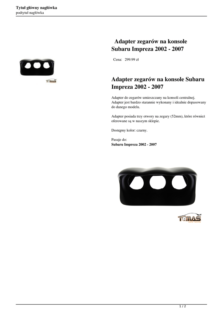 Tytuł główny nagłówka podtytuł nagłówka Adapter zegarów na konsole Subaru Impreza 2002 - 2007 Cena: 299.99 zł Adapter zegarów na konsole Subaru Impreza 2002 - 2007 Adapter do zegarów umieszczany na konsoli centralnej. Adapter jest bardzo starannie wykonany i idealnie dopasowany do danego modelu. Adapter posiada trzy otwory na zegary (52mm), które również oferowane są w naszym sklepie. Dostępny kolor: czarny. Pasuje do: Subaru Impreza 2002 - 2007 1/2 Tytuł główny nagłówka podtytuł nagłówka VW GOLF 4 2/2 Powered by TCPDF (www.tcpdf.org)