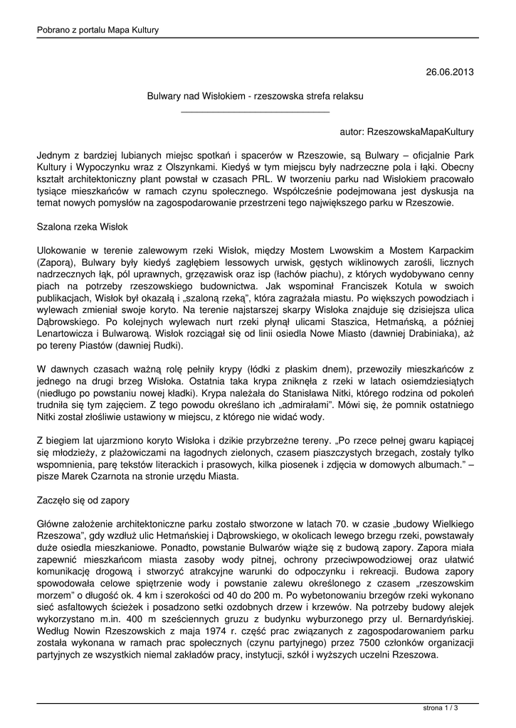 Pobrano z portalu Mapa Kultury 26.06.2013 Bulwary nad Wisłokiem - rzeszowska strefa relaksu ____________________________ autor: RzeszowskaMapaKultury Jednym z bardziej lubianych miejsc spotkań i spacerów w Rzeszowie, są Bulwary – oficjalnie Park Kultury i Wypoczynku wraz z Olszynkami. Kiedyś w tym miejscu były nadrzeczne pola i łąki. Obecny kształt architektoniczny plant powstał w czasach PRL. W tworzeniu parku nad Wisłokiem pracowało tysiące mieszkańców w ramach czynu społecznego. Współcześnie podejmowana jest dyskusja na temat nowych pomysłów na zagospodarowanie przestrzeni tego największego parku w Rzeszowie. Szalona rzeka Wisłok Ulokowanie w terenie zalewowym rzeki Wisłok, między Mostem Lwowskim a Mostem Karpackim (Zaporą), Bulwary były kiedyś zagłębiem lessowych urwisk, gęstych wiklinowych zarośli, licznych nadrzecznych łąk, pól uprawnych, grzęzawisk oraz isp (łachów piachu), z których wydobywano cenny piach na potrzeby rzeszowskiego budownictwa. Jak wspominał Franciszek Kotula w swoich publikacjach, Wisłok był okazałą i „szaloną rzeką”, która zagrażała miastu. Po większych powodziach i wylewach zmieniał swoje koryto. Na terenie najstarszej skarpy Wisłoka znajduje się dzisiejsza ulica Dąbrowskiego. Po kolejnych wylewach nurt rzeki płynął ulicami Staszica, Hetmańską, a później Lenartowicza i Bulwarową. Wisłok rozciągał się od linii osiedla Nowe Miasto (dawniej Drabiniaka), aż po tereny Piastów (dawniej Rudki). W dawnych czasach ważną rolę pełniły krypy (łódki z płaskim dnem), przewoziły mieszkańców z jednego na drugi brzeg Wisłoka. Ostatnia taka krypa zniknęła z rzeki w latach osiemdziesiątych (niedługo po powstaniu nowej kładki). Krypa należała do Stanisława Nitki, którego rodzina od pokoleń trudniła się tym zajęciem. Z tego powodu określano ich „admirałami”. Mówi się, że pomnik ostatniego Nitki został złośliwie ustawiony w miejscu, z którego nie widać wody. Z biegiem lat ujarzmiono koryto Wisłoka i dzikie przybrzeżne tereny. „Po rzece pełnej gwaru kąpiącej się młodzieży, z plażowiczami na łagodnych zielonych, czasem piaszczystych brzegach, zostały tylko wspomnienia, parę tekstów literackich i prasowych, kilka piosenek i zdjęcia w domowych albumach.” – pisze Marek Czarnota na stronie urzędu Miasta. Zaczęło się od zapory Główne założenie architektoniczne parku zostało stworzone w latach 70. w czasie „budowy Wielkiego Rzeszowa”, gdy wzdłuż ulic Hetmańskiej i Dąbrowskiego, w okolicach lewego brzegu rzeki, powstawały duże osiedla mieszkaniowe. Ponadto, powstanie Bulwarów wiąże się z budową zapory. Zapora miała zapewnić mieszkańcom miasta zasoby wody pitnej, ochrony przeciwpowodziowej oraz ułatwić komunikację drogową i stworzyć atrakcyjne warunki do odpoczynku i rekreacji. Budowa zapory spowodowała celowe spiętrzenie wody i powstanie zalewu określonego z czasem „rzeszowskim morzem” o długość ok. 4 km i szerokości od 40 do 200 m. Po wybetonowaniu brzegów rzeki wykonano sieć asfaltowych ścieżek i posadzono setki ozdobnych drzew i krzewów. Na potrzeby budowy alejek wykorzystano m.in. 400 m sześciennych gruzu z budynku wyburzonego przy ul. Bernardyńskiej. Według Nowin Rzeszowskich z maja 1974 r. część prac związanych z zagospodarowaniem parku została wykonana w ramach prac społecznych (czynu partyjnego) przez 7500 członków organizacji partyjnych ze wszystkich niemal zakładów pracy, instytucji, szkół i wyższych uczelni Rzeszowa. strona 1 / 3 Pobrano z portalu Mapa Kultury Warto tutaj przypomnieć, że w czasach PRL często były organizowane przez władzę czyny społeczne, które sprowadzały się najczęściej do darmowej pracy fizycznej w dniach wolnych. Z reguły polegały na sprzątaniu terenu przed budynkami publicznymi, wykopkach, ziemniaków, grabieniu śmieci, sadzeniu drzewek itp. Dorabiano do nich ideologię, zgodnie z którą, miały one służyć społeczeństwu, a więc wszystkim dookoła. Odmianą czynów społecznych były czyny partyjne - dla członków PZPR, w celach np. „uczczenia” 1-go Maja, Rewolucji Październikowej, zjazdów partii, rocznicę PRL. Wówczas nie chodziło o pracę przynoszącą realny pożytek, lecz o manifestację posłuszeństwa. Potocznie zwrot "zrobić w czynie społecznym" oznaczał: zrobić byle jak, na pokaz. Odmowa udziału w czynie społecznym oznaczała wpisanie buntownika na „czarną listę”. Komunistyczny bubel Zapora przyjęta z wielkim entuzjazmem okazała się bublem budowlanym, rekreacyjnym i sportowym. Zalew zamienił się w rozległe, zarośnięte bajoro. Na początku miał pojemność 1,8 mln metrów sześciennych i powierzchnię 68 hektarów. Po kilkunastu latach na wskutek zamulenia, stracił połowę powierzchni. Nie wzięto pod uwagę, że co roku w czasie roztopów wiosennych i ulewnych deszczy, przed rzeszowską zaporę, będzie napływać ogromna ilość namułów (5,8 tony na 1 godzinę, w czasie letnich powodzi). Cieszą się za to ornitolodzy, bo udaje im się znaleźć w tym terenie liczne siedliska ptaków, lubiących gęste, wodne zarośla. Obecnie nikomu o zdrowych zmysłach nie przyjdzie do głowy chęć kąpieli bezpośrednio w korycie rzeki, czy też zalewie. Czystość rzeki pozostawia wiele do życzenia ze względu na zmętniałą wodę, o kolorze zażółconym, nieprzyjemną w zapachu. Woda jest raczej postrzegana jako ściek W badaniach Wydziału Monitoringu Środowiska Wojewódzkiego Inspektoriatu Ochrony Środowiska w Rzeszowie, wody Wisłoka zasilające ujęcie dla miasta Rzeszowa nie spełniły żadnych norm jakości stawianym wodzie przeznaczonej do spożycia lub bytowania ryb. Powodem tego był zły stan sanitarny rzeki. Inną sprawą jest jedyne miejskie kąpielisko – Żwirownia, powstała po zakończeniu eksploatacji żwiru i piasku, będąca oddzielonym od zalewu zbiornikiem wody. Mówi się, że pomimo 