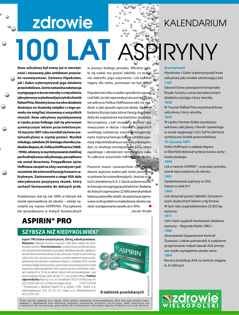 zdrowie KALENDARIUM 100 LAT ASPIRYNY Kwas salicylowy był znany już w starożytności i stosowany jako antidotum przeciwko reumatyzmowi. Zarówno Hipokrates, jak i Galen wykorzystywali jego działanie przeciwbólowe. Jest to naturalna substancja występująca w korze wierzby i z niej właśnie jako pierwszy wyizolował ją turyński chemik Rafael Piria. Niestety kwas ma silne działanie drażniące na śluzówkę żołądka i z tego powodu nie mógł być stosowany u wszystkich chorych. Kwas salicylowy zsyntetyzowany w Lipsku przez Kolbego stał się pierwszym syntetycznym lekiem przeciwbólowym. 10 stycznia 1897 roku narodził się kwas acetylosalicylowy w czystej postaci. Wysiłek młodego, zaledwie 29-letniego chemika z zakładów Bayera, dr. Feliksa Hoffmanna (1868-1946), włożony w zsyntetyzowanie stabilnej pochodnej kwasu salicylowego, początkowo nie został doceniony. Przypadkowo ojciec Hoffmana cierpiał na silny reumatyzm i jednocześnie źle tolerował kurację kwasem salicylowym. Zastosowanie u niego ASA dało zdecydowanie pozytywny skutek, który zachęcił farmaceutów do dalszych prób. Przełomowy stał się rok 1899, w którym lek został wprowadzony do obrotu – wtedy narodziła się nazwa ASPIRYNA. Początkowo lek sprzedawano w małych buteleczkach w postaci białego proszku. Wkrótce udało się nadać mu postać tabletki, co znacznie ułatwiło jego zażywanie. Lek był dostępny dla wielu, ponieważ nie był drogi. Popularności leku w żaden sposób nie ograniczał fakt, że tak naprawdę przez ponad 70 lat od odkrycia Feliksa Hoffmanna nikt nie wiedział, w jaki sposób aspiryna działa. Dopiero badania Brytyjczyka Johna Vane'a doprowadziły do wyjaśnienia mechanizmu działania. Nocyceptory, czyli receptory bólowe rozmieszczone w skórze i tkankach głębokich uwalniają substancje zwane prostaglandynami. Aspiryna hamuje enzym cyklooksygenazę odpowiedzialną za syntezę prostaglandyn, co skutkuje zmniejszeniem bólu, stanu zapalnego i obniżeniem temperatury ciała. To odkrycie przyniosło mu Nagrodę Nobla. Pozornie znana i powszechnie ceniona od dawna aspiryna zaskoczyła świat ponownie w połowie lat osiemdziesiątych. Jeszcze w latach czterdziestych A. J. Quick zaobserwował, że hamuje ona agregację płytek krwi. Badania, do których zaproszono 22 000 amerykańskich lekarzy, pozwoliły ustalić, że aspiryna przyjmowana co drugi dzień w małej dawce obniża częstość występowania zawału aż o 50%. Jacek Wolski ASPIRIN® PRO Aspirin® PRO (Acidum acetylsalicylicum), 500 mg, tabletki powlekane. Wskazania: Objawowe leczenie w gorączce i (lub) bólu o małym lub umiarkowanym nasileniu. Przeciwwskazania: uczulenie na kwas acetylosalicylowy, inne salicylany lub którykolwiek z pozostałych składników tego leku; napady astmy oskrzelowej lub reakcja alergiczna (np. pokrzywka, obrzęk naczynioruchowy, ciężki nieżyt nosa, wstrząs) w wywiadzie, wywołane podaniem kwasu acetylosalicylowego lub substancji o podobnym działaniu, szczególnie NLPZ; choroba wrzodowa żołądka lub dwunastnicy; skaza krwotoczna lub podwyższone ryzyko krwawienia; ciężka niewydolność nerek, wątroby lub serca; metotreksat w dawkach większych niż 20 mg na tydzień; doustne leki przeciwzakrzepowe; ciąża powyżej piątego miesiąca; dzieci poniżej 12 r.ż. bez przepisu lekarza. Podmiot odpowiedzialny: Bayer Sp. z o.o., Al. Jerozolimskie 158, 02-326 Warszawa, tel. (22) 5723500, faks (22) 5723500, www.bayer.com.pl. V1/01.01.2015/LR * W porównaniu z tabletkami Aspirin® 0,5 g, zgodnie z CHPL.; Voelker et al; Inflammopharmacol. 2012; 20: 225–231.; Cooper et al.; Inflammopharmacol. 2012; 20:233–242. 8 tabletek powlekanych produkt leczniczy OTC SZYBSZA NIŻ KIEDYKOLWIEK!* Przed użyciem zapoznaj się z ulotką, która zawiera wskazania, przeciwwskazania, dane dotyczące działań niepożądanych i dawkowanie oraz informacje dotyczące stosowania produktu leczniczego, bądź skonsultuj się 22 NR 3 |lub 2016 z lekarzem farmaceutą, gdyż każdy lek niewłaściwie stosowany zagraża Twojemu życiu lub zdrowiu. Starożytność Hipokrates i Galen wykorzystywali kwas salicylowy jako środek uśmierzający ból. 1763 Edward Stone powiadomił londyńskie Royale Society o przeciwmalarycznym działaniu wyciągu z kory wierzby. 1838 W Turynie Raffael Piria wyizolował kwas salicylowy z kory wierzby. 1859 W Lipsku Herman Kolbe zsyntetyzował kwas salicylowy z fenolu (zawartego w smole węglowej) i CO2; był to pierwszy syntetyczny środek przeciwbólowy. 10 stycznia 1897 Feliks Hoffmann z zakładu Bayera w Elberfeld dokonał syntezy kwasu acetylosalicylowego. 1899 Lek o nazwie ASPIRIN ®, w postaci proszku, został wprowadzony do obrotu. 1901 Opatentowanie aspiryny w USA. Patent nr 644 077. 1904 Lek otrzymał postać tabletki i był pierwszym skutecznym lekiem o tej formie. W tym roku wyprodukowano 25 823 kg aspiryny. 1971 John Vane wyjaśnił mechanizm działania aspiryny – Nagroda Nobla 1982 r. 1985 Amerykański Departament Kontroli Żywności i Leków potwierdził, iż codzienne przyjmowanie małych dawek ASA zmniejsza ryzyko wystąpienia zawału serca. 1994 Roczna produkcja ASA na świecie osiągnęła 35 000 ton!