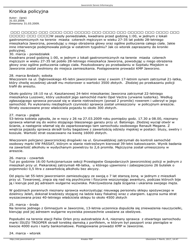 Jaworznicki Serwis Informacyjny Kronika policyjna Autor: (ipra) 31.03.2009. Zmieniony 31.03.2009. W zeszły poniedziałek, kwadrans przed godziną 1:00, w jednym z lokali gastronomicznych na terenie miasta czterech mężczyzn w wieku 27-35 lat pobiło 28-letniego mieszkańca Jaworzna, powodując u niego obrażenia głowy oraz ogólne potłuczenia całego ciała. Jakie inne interwencje podejmowała policja w ostatnim tygodniu? Jak co wtorek zapraszamy do kroniki policyjnej. 30. marca - poniedziałek Kwadrans przed godziną 1:00, w jednym z lokali gastronomicznych na terenie miasta czterech mężczyzn w wieku 27-35 lat pobiło 28-letniego mieszkańca Jaworzna, powodując u niego obrażenia głowy oraz ogólne potłuczenia całego ciała. Poszkodowany po przebadaniu w Szpitalu Miejskim w Jaworznie został zwolniony do miejsca zamieszkania. Postępowanie prowadzi KMP Jaworzno. 28. marca – sobota Wieczorem na ul. Dąbrowskiego 45-letni jaworznianin wraz z swoim 17-letnim synem zatrzymał 21-latka, który chwilę wcześniej ukradł mu motorower o wartości 3500 złotych. Złodziej po przekazaniu policji trafił do aresztu. Około godziny 18:10 na ul. Kasztanowej 24-letni mieszkaniec Jaworzna zatrzymał 22-letniego mieszkańca Luszowic, który uszkodził jego samochód marki Opel Vectra (urwanie lusterka). Według zgłaszającego sprawca poruszał się w stanie nietrzeźwym (ponad 2 promile) rowerem i uderzył w jego samochód. Po wykonaniu niezbędnych czynności sprawca został umieszczony w policyjnym areszcie. Straty oszacowane przez właściciela pojazdu to około 300 złotych. 27. marca - piątek 53-letnia kobieta zgłosiła, że w nocy z 26 na 27.03.2009 roku pomiędzy godz. 17.30 a 08.00, nieznany sprawca włamał się do wolno stojącego blaszanego garażu przy ul. Batorego. Złodziej wyciął otwór w ścianie, a następnie włamał się do zaparkowanego tam samochodu osobowego Renault Megane. Z wnętrza pojazdu sprawca skradł torby bagażowe z zawartością odzieży męskiej w postaci: bluzy, swetry i koszule. Wartość strat oszacowano na kwotę 16000 złotych. Wieczorem policjanci jaworznickiej drogówki na ul. Grunwaldzkiej zatrzymali do kontroli samochód osobowy marki VW PASSAT, którym w stanie nietrzeźwym kierował 39-letni katowiczanin. Wynik badania na zawartość alkoholu w wydychanym powietrzu to 2,6 promila. Mężczyzna został umieszczony w areszcie. 26. marca - czwartek Tuż po godzinie 16:00 funkcjonariusze sekcji Przestępstw Gospodarczych jaworznickiej policji w jednym z mieszkań przy ul. Piekarskiej zatrzymali 48-latka, u którego ujawniono i zabezpieczono 26 butelek o pojemności 0,5 litra z zawartością alkoholu bez akcyzy. Od pięciu lat 55-letni jaworznianin zamieszkujący ze swoją o 7 lat starszą żoną w jednym z mieszkań przy ul. Towarowej, znęca się nad nią psychicznie i fizycznie wszczynając awantury, podczas których bije ją i kieruje pod jej adresem wulgarne wyzwiska. Pokrzywdzona żąda ścigania i ukarania swojego męża. W godzinach porannych nieznany sprawca wykorzystując nieuwagę personelu sklepu spożywczego w dzielnicy Jeleń, dokonał kradzieży stojącej na ladzie kasy fiskalnej wraz z utargiem. Łączna suma strat wyszacowana przez 40-letniego właściciela sklepu to około 4500 złotych 25. marca - środa Na terenie jednego z Gimnazjum w Jaworznie, 13-letnia uczennica dopuściła się znieważenia nauczycielki, kierując pod jej adresem wulgarne wyzwiska powszechnie uważane za obelżywe. Popołudni na terenie stacji Paliw Orlen przy autostradzie A-4, nieznany sprawca z otwartego samochodu marki ISUZU TROOPER skradł torebkę damską z portfelem, w którym był paszport oraz pieniądze w kwocie 4000 euro i karty bankomatowe. Postępowanie prowadzi KMP w Jaworznie. 24. marca - wtorek http://old.jaworznianin.pl Kreator PDF Utworzono 7 March, 2017, 14:47 Jaworznicki Serwis Informacyjny W godzinach popołudniowych policjanci Ruchu Drogowego na ul. Św. Wojciecha zatrzymali 49-letniego mieszkańca gminy Alwernia, który będąc w stanie nietrzeźwym (0,6 promila), kierował samochodem marki Ford Fiesta. Postępowanie prowadzi KMP Jaworzno. 23. marca - poniedziałek 48-letnia mieszkanka Jaworzna zgłosiła, że na ul. Batorego dwóch znanych jej chłopców w wieku 16-lat, kopiąc nogami i uderzając rękoma po całym ciele doprowadzili do stanu bezbronności jej 15-letniego syna. Sprawcy następnie skradli pokrzywdzonemu telefon komórkowy marki NOKIA wartości 600 złotych. FOTO: Archiwum UM http://old.jaworznianin.pl Kreator PDF Utworzono 7 March, 2017, 14:47
