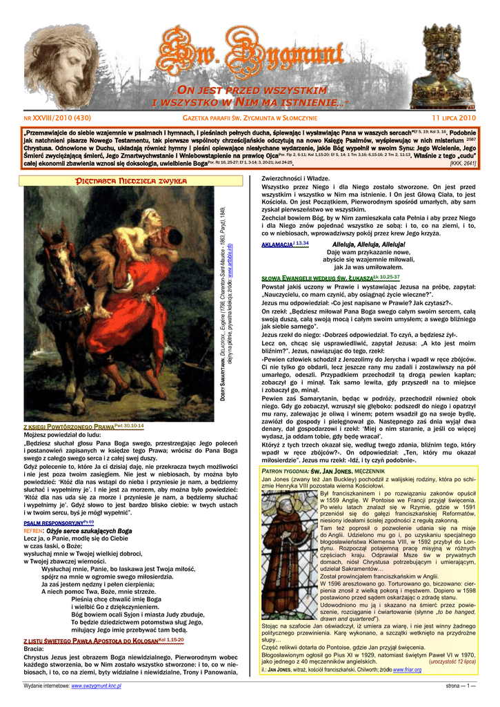 „ON JEST PRZED WSZYSTKIM I WSZYSTKO W NIM MA ISTNIENIE…” NR XXVIII/2010 (430) GAZETKA PARAFII ŚW. ZYGMUNTA W SŁOMCZYNIE 11 LIPCA 2010 „Przemawiajcie do siebie wzajemnie w psalmach i hymnach, i pieśniach pełnych ducha, śpiewając i wysławiając Pana w waszych sercach”Ef 5, 19; Kol 3, 16. Podobnie jak natchnieni pisarze Nowego Testamentu, tak pierwsze wspólnoty chrześcijańskie odczytują na nowo Księgę Psalmów, wyśpiewując w nich misterium 2587 Chrystusa. Odnowione w Duchu, układają również hymny i pieśni opiewające niesłychane wydarzenie, jakie Bóg wypełnił w swoim Synu: Jego Wcielenie, Jego Śmierć zwyciężającą śmierć, Jego Zmartwychwstanie i Wniebowstąpienie na prawicę OjcaPor. Flp 2, 6-11; Kol 1,15-20; Ef 5, 14; 1 Tm 3,16; 6,15-16; 2 Tm 2, 11-13. Właśnie z tego „cudu” całej ekonomii zbawienia wznosi się doksologia, uwielbienie BogaPor. Rz 16, 25-27; Ef 1, 3-14; 3, 20-21; Jud 24-25. [KKK, 2641] ZWYKŁA DOBRY SAMARYTANIN, DELACROIX, , Eugène (1798, Charenton-Saint-Maurice - 1863, Paryż), 1849, olejny na płótnie, prywatna kolekcja; źródło: www.artbible.info PIĘTNASTA NIEDZIELA Z KSIĘGI POWTÓRZONEGO PRAWAPwt 30,10-14 Mojżesz powiedział do ludu: „Będziesz słuchał głosu Pana Boga swego, przestrzegając Jego poleceń i postanowień zapisanych w księdze tego Prawa; wrócisz do Pana Boga swego z całego swego serca i z całej swej duszy. Gdyż polecenie to, które Ja ci dzisiaj daję, nie przekracza twych możliwości i nie jest poza twoim zasięgiem. Nie jest w niebiosach, by można było powiedzieć: ‘Któż dla nas wstąpi do nieba i przyniesie je nam, a będziemy słuchać i wypełnimy je’. I nie jest za morzem, aby można było powiedzieć: ‘Któż dla nas uda się za morze i przyniesie je nam, a będziemy słuchać i wypełnimy je’. Gdyż słowo to jest bardzo blisko ciebie: w twych ustach i w twoim sercu, byś je mógł wypełnić”. PSALM RESPONSORYJNYPs 69 REFREN: Ożyje serce szukających Boga Lecz ja, o Panie, modlę się do Ciebie w czas łaski, o Boże; wysłuchaj mnie w Twojej wielkiej dobroci, w Twojej zbawczej wierności. Wysłuchaj mnie, Panie, bo łaskawa jest Twoja miłość, spójrz na mnie w ogromie swego miłosierdzia. Ja zaś jestem nędzny i pełen cierpienia; A niech pomoc Twa, Boże, mnie strzeże. Pieśnią chcę chwalić imię Boga i wielbić Go z dziękczynieniem. Bóg bowiem ocali Syjon i miasta Judy zbuduje, To będzie dziedzictwem potomstwa sług Jego, miłujący Jego imię przebywać tam będą. Z LISTU ŚWIĘTEGO PAWŁA APOSTOŁA DO KOLOSANKol 1,15-20 Bracia: Chrystus Jezus jest obrazem Boga niewidzialnego, Pierworodnym wobec każdego stworzenia, bo w Nim zostało wszystko stworzone: i to, co w niebiosach, i to, co na ziemi, byty widzialne i niewidzialne, Trony i Panowania, Wydanie internetowe: www.swzygmunt.knc.pl Zwierzchności i Władze. Wszystko przez Niego i dla Niego zostało stworzone. On jest przed wszystkim i wszystko w Nim ma istnienie. I On jest Głową Ciała, to jest Kościoła. On jest Początkiem, Pierworodnym spośród umarłych, aby sam zyskał pierwszeństwo we wszystkim. Zechciał bowiem Bóg, by w Nim zamieszkała cała Pełnia i aby przez Niego i dla Niego znów pojednać wszystko ze sobą: i to, co na ziemi, i to, co w niebiosach, wprowadziwszy pokój przez krew Jego krzyża. AKLAMACJAJ 13,34 Alleluja, Alleluja, Alleluja! Daję wam przykazanie nowe, abyście się wzajemnie miłowali, jak Ja was umiłowałem. SŁOWA EWANGELII WEDŁUG ŚW. ŁUKASZAŁk 10,25-37 Powstał jakiś uczony w Prawie i wystawiając Jezusa na próbę, zapytał: „Nauczycielu, co mam czynić, aby osiągnąć życie wieczne?”. Jezus mu odpowiedział: »Co jest napisane w Prawie? Jak czytasz?«. On rzekł: „Będziesz miłował Pana Boga swego całym swoim sercem, całą swoją duszą, całą swoją mocą i całym swoim umysłem; a swego bliźniego jak siebie samego”. Jezus rzekł do niego: »Dobrześ odpowiedział. To czyń, a będziesz żył«. Lecz on, chcąc się usprawiedliwić, zapytał Jezusa: „A kto jest moim bliźnim?”. Jezus, nawiązując do tego, rzekł: »Pewien człowiek schodził z Jerozolimy do Jerycha i wpadł w ręce zbójców. Ci nie tylko go obdarli, lecz jeszcze rany mu zadali i zostawiwszy na pół umarłego, odeszli. Przypadkiem przechodził tą drogą pewien kapłan; zobaczył go i minął. Tak samo lewita, gdy przyszedł na to miejsce i zobaczył go, minął. Pewien zaś Samarytanin, będąc w podróży, przechodził również obok niego. Gdy go zobaczył, wzruszył się głęboko: podszedł do niego i opatrzył mu rany, zalewając je oliwą i winem; potem wsadził go na swoje bydlę, zawiózł do gospody i pielęgnował go. Następnego zaś dnia wyjął dwa denary, dał gospodarzowi i rzekł: ‘Miej o nim staranie, a jeśli co więcej wydasz, ja oddam tobie, gdy będę wracał’. Któryż z tych trzech okazał się, według twego zdania, bliźnim tego, który wpadł w ręce zbójców?«. On odpowiedział: „Ten, który mu okazał miłosierdzie”. Jezus mu rzekł: »Idź, i ty czyń podobnie«. PATRON TYGODNIA: ŚW. JAN JONES, MĘCZENNIK Jan Jones (zwany też Jan Buckley) pochodził z walijskiej rodziny, która po schizmie Henryka VIII pozostała wierna Kościołowi. Był franciszkaninem i po rozwiązaniu zakonów opuścił w 1559 Anglię. W Pontoise we Francji przyjął święcenia. Po wielu latach znalazł się w Rzymie, gdzie w 1591 przeniósł się do gałęzi franciszkańskiej Reformatów, niesiony ideałami ścisłej zgodności z regułą zakonną. Tam też poprosił o pozwolenie udania się na misje do Anglii. Udzielono mu go i, po uzyskaniu specjalnego błogosławieństwa Klemensa VIII, w 1592 przybył do Londynu. Rozpoczął potajemną pracę misyjną w różnych częściach kraju. Odprawiał Msze św w prywatnych domach, niósł Chrystusa potrzebującym i umierającym, udzielał Sakramentów… Został prowincjałem franciszkańskim w Anglii. W 1