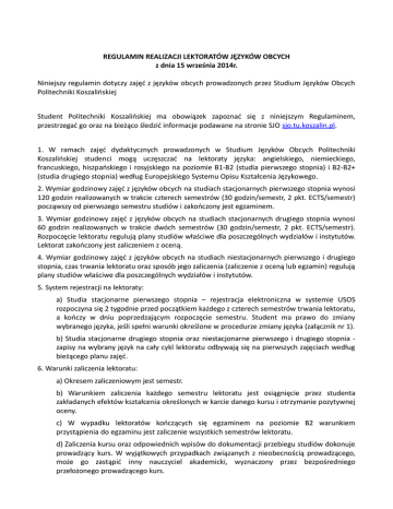 REGULAMIN REALIZACJI LEKTORATÓW JĘZYKÓW OBCYCH z dnia 15 września 2014r. Niniejszy regulamin dotyczy zajęć z języków obcych prowadzonych przez Studium Języków Obcych Politechniki Koszalińskiej Student Politechniki Koszalińskiej ma obowiązek zapoznać się z niniejszym Regulaminem, przestrzegać go oraz na bieżąco śledzić informacje podawane na stronie SJO sjo.tu.koszalin.pl. 1. W ramach zajęć dydaktycznych prowadzonych w Studium Języków Obcych Politechniki Koszalińskiej studenci mogą uczęszczać na lektoraty języka: angielskiego, niemieckiego, francuskiego, hiszpańskiego i rosyjskiego na poziomie B1-B2 (studia pierwszego stopnia) i B2-B2+ (studia drugiego stopnia) według Europejskiego Systemu Opisu Kształcenia Językowego. 2. Wymiar godzinowy zajęć z języków obcych na studiach stacjonarnych pierwszego stopnia wynosi 120 godzin realizowanych w trakcie czterech semestrów (30 godzin/semestr, 2 pkt. ECTS/semestr) począwszy od pierwszego semestru studiów i zakończony jest egzaminem. 3. Wymiar godzinowy zajęć z języków obcych na studiach stacjonarnych drugiego stopnia wynosi 60 godzin realizowanych w trakcie dwóch semestrów (30 godzin/semestr, 2 pkt. ECTS/semestr). Rozpoczęcie lektoratu regulują plany studiów właściwe dla poszczególnych wydziałów i instytutów. Lektorat zakończony jest zaliczeniem z oceną. 4. Wymiar godzinowy zajęć z języków obcych na studiach niestacjonarnych pierwszego i drugiego stopnia, czas trwania lektoratu oraz sposób jego zaliczenia (zaliczenie z oceną lub egzamin) regulują plany studiów właściwe dla poszczególnych wydziałów i instytutów. 5. System rejestracji na lektoraty: a) Studia stacjonarne pierwszego stopnia – rejestracja elektroniczna w systemie USOS rozpoczyna się 2 tygodnie przed początkiem każdego z czterech semestrów trwania lektoratu, a kończy w dniu poprzedzającym rozpoczęcie semestru. Student ma prawo do zmiany wybranego języka, jeśli spełni warunki określone w procedurze zmiany języka (załącznik nr 1). b) Studia stacjonarne drugiego stopnia oraz niestacjonarne pierwszego i drugiego stopnia zapisy na wybrany język na cały cykl lektoratu odbywają się na pierwszych zajęciach według bieżącego planu zajęć. 6. Warunki zaliczenia lektoratu: a) Okresem zaliczeniowym jest semestr. b) Warunkiem zaliczenia każdego semestru lektoratu jest osiągnięcie przez studenta zakładanych efektów kształcenia określonych w karcie danego kursu i otrzymanie pozytywnej oceny. c) W wypadku lektoratów kończących się egzaminem na poziomie B2 warunkiem przystąpienia do egzaminu jest zaliczenie wszystkich semestrów lektoratu. d) Zaliczenia kursu oraz odpowiednich wpisów do dokumentacji przebiegu studiów dokonuje prowadzący kurs. W wyjątkowych przypadkach związanych z nieobecnością prowadzącego, może go zastąpić inny nauczyciel akademicki, wyznaczony przez bezpośredniego przełożonego prowadzącego kurs. e) Skala ocen stosowana w uczelni, traktowana w systemie ECTS jako skala lokalna, przedstawiona jest w poniższej tabeli: Miara Słowne liczbowa wyrażenie oceny oceny Skrót Opis kryteriów Kursy kończące się oceną 5 bardzo dobry bdb osiągnięcie zakładanych efektów kształcenia, obejmujących wszystkie istotne aspekty 4,5 dobry plus db+ osiągnięcie zakładanych efektów kształcenia, obejmujących wszystkie istotne aspekty z pewnymi błędami lub nieścisłościami 4 dobry db osiągnięcie zakładanych efektów kształcenia z pominięciem niektórych mniej istotnych aspektów 3,5 dostateczny plus dst+ osiągnięcie zakładanych efektów kształcenia z pominięciem niektórych istotnych aspektów lub z istotnymi nieścisłościami 3 dostateczny dst osiągnięcie zakładanych efektów kształcenia z pominięciem niektórych ważnych aspektów lub z poważnymi nieścisłościami 2 niedostateczny ndst brak osiągnięcia zakładanych efektów kształcenia f) Na początku semestru nauczyciel prowadzący kurs podaje do wiadomości studentów: - opis przedmiotu, zawierający efekty kształcenia, program zajęć i wykaz zalecanej literatury, - warunki uzyskania zaliczenia kursu oraz sposób bieżącej kontroli wyników nauczania, - sposoby przekazywania informacji o uzyskanych wynikach egzaminów i zaliczeń, terminy i miejsce konsultacji. g) Udział w lektoracie języka obcego jest obowiązkowy. h) Student, który był nieobecny na zajęciach więcej niż 2 razy w semestrze, ma obowiązek ustalenia z prowadzącym formy odrobienia opuszczonych zajęć. W przeciwnym razie nie uzyska on zaliczenia z lektoratu. i) Stopień realizacji programu kształcenia wyklucza możliwość osiągnięcia przez studenta założonych efektów kształcenia w wypadku opuszczenia przez studenta ponad 50% zajęć. Jeżeli nieobecności te są nieuzasadnione i nieusprawiedliwione, student nie otrzymuje zaliczenia z lektoratu i musi powtarzać semestr z tego przedmiotu. Jeżeli nieobecności wynikły z przyczyn uzasadnionych, niezależnych od studenta (takich jak choroba, udział w kursach, szkoleniach, badaniach naukowych, pracach na rzecz uczelni), sposób uzupełnienia zaległości i uzyskania efektów kształcenia jest ustalany indywidualnie. j) Student, który nie przystąpił do końcowego egzaminu z języka obcego w ustalonym terminie, jest zobowiązany do przedstawienia egzaminatorowi usprawiedliwienia nieobecności, w terminie 7 dni od dnia ustania jej przyczyn. Egzaminator, uwzględniając usprawiedliwienie, wyznacza dodatkowy termin egzaminu. W przypadku nieuwzględnienia usprawiedliwienia, studentowi przysługuje odwołanie do Kierownika SJO, w terminie 7 dni od dnia rozstrzygnięcia podjętego przez egzaminatora. k) SJO może ogłosić termin „zerowy” egzaminu jako dodatkowy, określając warunki przystąpienia do tego egzaminu. Termin egzaminu zerowego jest wyznaczany przez Kierownika SJO. l) W razie uzyskania z egzaminu (zaliczenia) oceny niedostatecznej, studentowi przysług