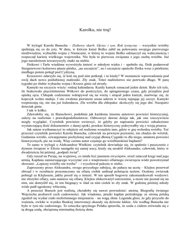 Karolku, nie truj! W trylogii Karola Bunscha – Dzikowy skarb, Ojciec i syn, Rok tysięczny – wszystkie wróżby spełniają się co do joty. W dniu, w którym kniaź Bolko zabił na polowaniu swojego pierwszego niedźwiedzia, wybuchła wojna z Niemcami, w której to wojnie Bolko odznaczył się walecznością i rozpoczął karierę wielkiego wojownika. Nie była to pierwsza związana z jego osobą wróżba. Już jego narodzinom towarzyszyły znaki na niebie. Dzikowi i Tarle wiedźma wywróżyła śmierć w młodym wieku i – spełniło się. Dzik podarował Stoigniewowi kolorowe ptasie piórko, „na szczęście”, no i szczęście opuściło Dzika wraz z piórkiem; niedługo potem poległ pod Cydzyną. Krzeszowi zdarzyło się, iż koń się pod nim potknął, i to kiedy? W momencie wprowadzania pod swój dach nowo poślubionej małżonki. Zły znak. Toteż małżeństwo nie potrwało długo. W parę tygodni po ślubie wybucha wojna i Krzesz ginie od strzały. Kamyki na szczycie wieży: rodzaj kalendarza. Każdy kamyk oznaczał jeden dzień. Było ich tyle, ile brakowało pięcioletniemu Witkowi do postrzyżyn, do upragnionego czasu, gdy przejdzie pod opiekę ojca. Chłopak codziennie wdrapywał się na wieżę i strącał jeden kamyk, martwiąc się, że kopczyk wolno maleje. I oto zwalona piorunem sosna uderza w wieżę rujnując jej szczyt. Kamyki rozpraszają się, nie ma już kalendarza. Zła wróżba dla chłopaka: skończyły się jego dni. Nazajutrz dzieciak ginie. I tak w kółko. Zdawałoby się, że Bunschowi, podobnie jak każdemu innemu autorowi powieści historycznej, zależy na realizmie i prawdopodobieństwie. Odtworzyć dawne dzieje tak, jak one rzeczywiście mogły wyglądać. Czytelnik powinien uwierzyć, że gdyby po napisaniu powieści odnaleziono wystarczającą ilość dokumentów z danej epoki, przekaz historyczny pokrywałby się z wizją pisarza. Jak zatem wytłumaczyć to odejście od realizmu wszędzie tam, gdzie w grę wchodzą wróżby. Toć przecież czytelnik powieści Karola Bunscha, człowiek na pewnym poziomie, nie chadza do wróżek. Gadanina wróżki, szwargotanie pochylonej nad czyjąś dłonią Cyganki to dla niego, amatora powieści historycznych, pic na wodę. Więc czemu autor częstuje go wróżbiarskimi bajdami? To samo w trylogii o Aleksandrze Wielkim: czytelnik dowiaduje się, że spalenie i puszczenie z dymem świątyni w Efezie nastąpiło tej samej nocy, kiedy się urodził Aleksander, człowiek, który w dwadzieścia lat później „podpali świat”. Gdy ruszał na Persję, na wyprawę, co miała być pasmem zwycięstw, orzeł zataczał kręgi nad jego armią. Kapłana zamierzającego wyczytać coś z wnętrzności ofiarnego zwierzęcia wódz powstrzymał słowami: „Lepszej wróżby nie trzeba” – i wycelował palcem w niebo. Zaproszony przez Aleksandra, swego przyszłego zabójcę, do pałacu na ucztę – Klejtos przerwał obrzęd i w rezultacie przeznaczony na ofiarę ciołek uniknął pchnięcia nożem. Ocalony zwierzak pobiegł za Klejtosem, jakby prosił się o śmierć. W ten sposób bogowie zakomunikowali wodzowi: nie złożyłeś ofiary, sam staniesz się ofiarą. Klejtos zlekceważył ostrzeżenie, a może nie poznał się na nim, nie domyślił się, że ten biegnący w ślad za nim ciołek to zły znak. W godzinę później młody wódz padł ugodzony włócznią. A przecież Bunsch jest realistą, chciałoby się nawet powiedzieć: ateistą. Biografię świętego Wojciecha pozbawił cech cudowności. Jak wiadomo, pruski kapłan pertraktując ze stroną polską zgodził się wydać ciało niefortunnego misjonarza – na wagę złota. Legenda głosi, że gdy przyszło do ważenia, zwłoki w wyniku Boskiej interwencji okazały się dziwnie lekkie. Ale według Bunscha nie było w tym nic cudownego. To sztuczka sprytnego Polaka sprawiła, że szala z ciałem zrównała się z tą drugą szalą, obciążoną minimalną ilością złota. Podobnie obszedł się autor z biografią biskupa Stanisława Szczepanowskiego – żadnych cudów. Nie było żadnego wskrzeszenia. To nie Piotrowin wynurzył się z grobu, tylko oszust udający zmarłego szlachcica. Tak więc pisarz obala legendy i wszystko tłumaczy w sposób racjonalny. Irracjonalizm wchodzi w grę jedynie w związku z wróżbami. Zawsze się spełniają. Gdyby ziściła się tylko jedna, nie powiem. Na przykład ta obiecująca wszechwładzę spryciarzowi, co rozwiąże węzeł gordyjski. Jedna, dwie, proszę bardzo. Byłoby jak w życiu, które przecież nie jest całkiem pozbawione dziwności. Ale nie wszystkie! Niestety, żadnych wyjątków. Ze dwadzieścia jest tych wróżb i spełnia się każda. Człowiek strzela, Pan Bóg kule nosi. To Bóg sprawia, że wszelkiego rodzaju pociski, kule ołowiane, strzały, kamienie, trafiają do celu lub chybiają. Nie tylko pociski, dawki trucizny również. Od woli Boskiej zależy, czy trucicielowi się powiedzie i przygotowana przezeń trucizna dotrze do ust ofiary. To Bóg sprawił, że odeszli przedwcześnie ci dwaj, kompozytor Mozart i generał Hoche. Pierwszy otruty przez zazdrosnego męża (tak, przez męża zazdrośnika, a nie przez zawistnego Salierego), drugi tym samym podstępnym sposobem zgładzony przez jakiegoś rojalistę. Ale truciciele byli tylko narzędziami w ręku Boga. Jak sobie wytłumaczyć tę Boską decyzję? Nasuwa się odpowiedź: musieli ci dwaj, muzyk i wojskowy, ustąpić ludziom opatrznościowym, charyzmatycznym. W świecie muzyki był nim Beethoven, w świecie realnym – Bonaparte. Słowem, Opatrzność nie działa opacznie. Wracając do literatury: pomiędzy Panem Bogiem a powieściopisarzem analogie są uderzające. Z zachowaniem wszelkich proporcji. Stwórca i twórca, Stworzyciel i pisatiel. Karol Bunsch, autor Dzikowego skarbu, jest w stworzonym przez siebie świecie ojcem wszechmogącym. W bitwie pod Cydzyną strzelają Niemcy, owszem, oni szyją z łuków, ale to Pan... Bunsch nosi te