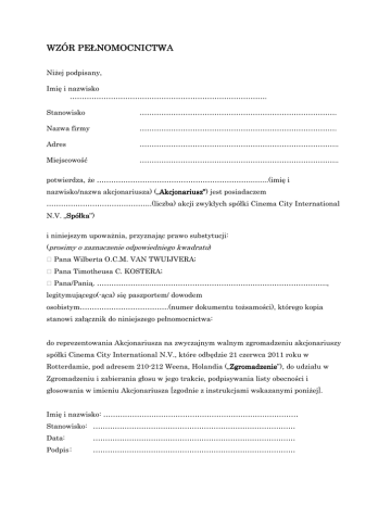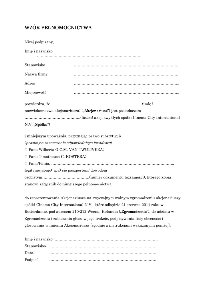 WZÓR PEŁNOMOCNICTWA PEŁNOMOCNICTWA Niżej podpisany, Imię i nazwisko ………………………………………………………………………. Stanowisko ………………………………………………………………………. Nazwa firmy ………………………………………………………………………. Adres ……………………………………………………………………….. Miejscowość ……………………………………………………………………….. potwierdza, że ………………………………………………………..........(imię i nazwisko/nazwa akcjonariusza) („Akcjonariusz” Akcjonariusz”) Akcjonariusz” jest posiadaczem ……………………………………..(liczba) akcji zwykłych spółki Cinema City International N.V. „Spółka Spółka”) Spółka i niniejszym upoważnia, przyznając prawo substytucji: (prosimy o zaznaczenie odpowiedniego kwadratu) Pana Wilberta O.C.M. VAN TWUIJVERA; Pana Timotheusa C. KOSTERA; Pana/Panią. …………………..………………………………………………………………., legitymującego(-ąca) się paszportem/ dowodem osobistym……………………………….(numer dokumentu tożsamości), którego kopia stanowi załącznik do niniejszego pełnomocnictwa: do reprezentowania Akcjonariusza na zwyczajnym walnym zgromadzeniu akcjonariuszy spółki Cinema City International N.V., które odbędzie 21 czerwca 2011 roku w Rotterdamie, pod adresem 210-212 Weena, Holandia („Zgromadzenie Zgromadzenie”), Zgromadzenie do udziału w Zgromadzeniu i zabierania głosu w jego trakcie, podpisywania listy obecności i głosowania w imieniu Akcjonariusza [zgodnie z instrukcjami wskazanymi poniżej]. Imię i nazwisko: ……………………………………………………………………… Stanowisko: ………………………………………………………………………… Data: ………………………………………………………………………… Podpis : ………………………………………………………………………… INSTRUKCJA GŁOSOWANIA PEŁNOMOCNIKA Na Zwyczajnym Walnym Zgromadzeniu Akcjonariuszy Cinema City International N.V., które odbędzie się 21 czerwca 2011 r. w Rotterdamie, pod adresem 210-212 Weena, Holandia Punkt Uchwała∗ Głosuję Głosuję Wstrzymuję za przeciw się od głosu porządku obrad 3 Przyjęcie rocznego sprawozdania finansowego za rok obrotowy 2010 5 Podział zysku netto za rok obrotowy 2010 6 Udzielenie absolutorium członkom Zarządu 7 Udzielenie absolutorium członkom Rady Nadzorczej 9 Wybór niezależnego biegłego rewidenta na rok obrotowy 2011 10 i Powtórny wybór pana Arthur F. Pierce na stanowisko członka Rady Nadzorczej 10 ii Powtórny wybór pana Yair Shilhav na stanowisko członka Rady Nadzorczej 11 Upoważnienie Zarządu na podstawie art. 6 Statutu Spółki do wyemitowania akcji Spółki 12 Upoważnienie Zarządu na podstawie art. 9 ust. 3.c Statutu Spółki do nabywania akcji Spółki przez Spółkę 13. Zmiana statutu Spółki zgodnie z projektem zmian z dnia 20 kwietnia 2011 Prosimy o zaznaczenie odpowiedniej rubryki krzyżykiem (“X”) Załącznik: oryginał świadectwa depozytowego wydanego przez bank lub firmę inwestycyjną oraz kopia dokumentu tożsamości pełnomocnika, jeśli nie jest nim VAN TWUIJVER lub KOSTER. Jeśli nie zostały udzielone żadne instrukcje, Panowie Van Twuijver i Koster będą głosować zgodnie z zaleceniami organów zarządzających. …………………………………. ………………………………………… (Imię i nazwisko) (Podpis) UWAGA: UWAGA: NINIEJSZE PEŁNOMOCNICTWO PEŁNOMOCNICTWO JEST WAŻNE JEDYNIE JEDYNIE W PRZYPADKU, PRZYPADKU, GDY NAZWISKO/NAZWA AKCJONARIUSZA WSKAZANE WSKAZANE W PEŁNOMOCNICTWIE JEST TAKIE SAMO JAK NAZWISKO/NAZWA AKCJONARIUSZA ZNAJDUJĄCE ZNAJDUJĄCE SIĘ NA IMIENNYM ŚWIADECTWIE DEPOZYTOWYM DEPOZYTOWYM ∗ Odniesienie do proponowanych uchwał znajduje się w Dokumencie Informacyjnym dla Akcjonariuszy z dn. 10 maja 2011 r.