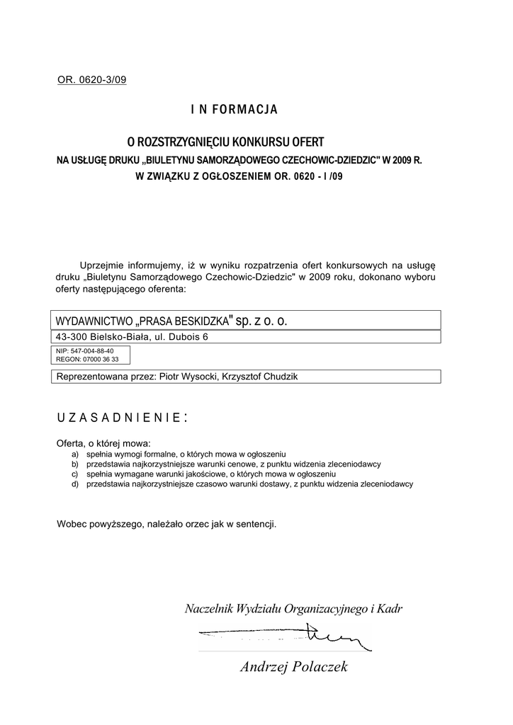 OR. 0620-3/09 l N FORMACJA O ROZSTRZYGNIĘCIU KONKURSU OFERT NA USŁUGĘ DRUKU „BIULETYNU SAMORZĄDOWEGO CZECHOWIC-DZIEDZIC" W 2009 R. W ZWIĄZKU Z OGŁOSZENIEM OR. 0620 - l /09 Uprzejmie informujemy, iż w wyniku rozpatrzenia ofert konkursowych na usługę druku „Biuletynu Samorządowego Czechowic-Dziedzic" w 2009 roku, dokonano wyboru oferty następującego oferenta: WYDAWNICTWO „PRASA BESKIDZKA" sp. z o. o. 43-300 Bielsko-Biała, ul. Dubois 6 NIP: 547-004-88-40 REGON: 07000 36 33 Reprezentowana przez: Piotr Wysocki, Krzysztof Chudzik UZASADNIENIE: Oferta, o której mowa: a) b) c) d) spełnia wymogi formalne, o których mowa w ogłoszeniu przedstawia najkorzystniejsze warunki cenowe, z punktu widzenia zleceniodawcy spełnia wymagane warunki jakościowe, o których mowa w ogłoszeniu przedstawia najkorzystniejsze czasowo warunki dostawy, z punktu widzenia zleceniodawcy Wobec powyższego, należało orzec jak w sentencji. Naczelnik Wydziału Organizacyjnego i Kadr Andrzej Polaczek