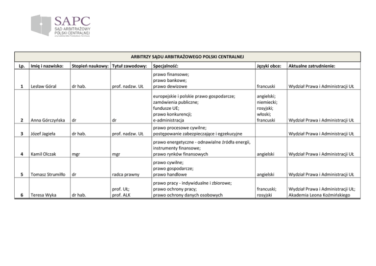 ARBITRZY SĄDU ARBITRAŻOWEGO POLSKI CENTRALNEJ Lp. 1 Imię i nazwisko: Lesław Góral Stopień naukowy: Tytuł zawodowy: Specjalność: Języki obce: Aktualne zatrudnienie: dr hab. prof. nadzw. UŁ prawo finansowe; prawo bankowe; prawo dewizowe francuski Wydział Prawa i Administracji UŁ angielski; niemiecki; rosyjski; włoski; francuski Wydział Prawa i Administracji UŁ 2 Anna Górczyńska dr dr europejskie i polskie prawo gospodarcze; zamówienia publiczne; fundusze UE; prawo konkurencji; e-administracja 3 Józef Jagieła dr hab. prof. nadzw. UŁ prawo procesowe cywilne; postępowanie zabezpieczające i egzekucyjne mgr prawo energetyczne - odnawialne źródła energii, instrumenty finansowe; prawo rynków finansowych angielski Wydział Prawa i Administracji UŁ dr radca prawny prawo cywilne; prawo gospodarcze; prawo handlowe angielski Wydział Prawa i Administracji UŁ dr hab. prof. UŁ; prof. ALK prawo pracy - indywidualne i zbiorowe; prawo ochrony pracy; prawo ochrony danych osobowych francuski; rosyjski Wydział Prawa i Administracji UŁ; Akademia Leona Koźmińskiego 4 5 6 Kamil Olczak Tomasz Strumiłło Teresa Wyka mgr Wydział Prawa i Administracji UŁ