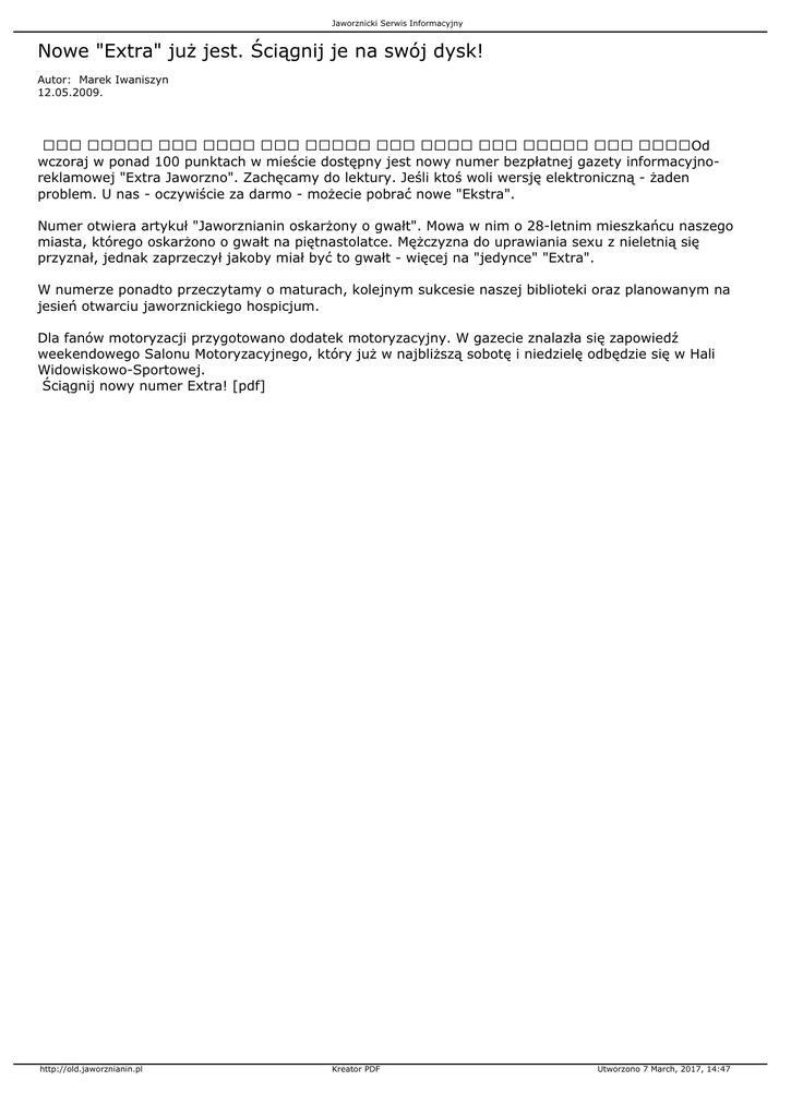 Jaworznicki Serwis Informacyjny Nowe "Extra" już jest. Ściągnij je na swój dysk! Autor: Marek Iwaniszyn 12.05.2009. Od wczoraj w ponad 100 punktach w mieście dostępny jest nowy numer bezpłatnej gazety informacyjnoreklamowej "Extra Jaworzno". Zachęcamy do lektury. Jeśli ktoś woli wersję elektroniczną - żaden problem. U nas - oczywiście za darmo - możecie pobrać nowe "Ekstra". Numer otwiera artykuł "Jaworznianin oskarżony o gwałt". Mowa w nim o 28-letnim mieszkańcu naszego miasta, którego oskarżono o gwałt na piętnastolatce. Mężczyzna do uprawiania sexu z nieletnią się przyznał, jednak zaprzeczył jakoby miał być to gwałt - więcej na "jedynce" "Extra". W numerze ponadto przeczytamy o maturach, kolejnym sukcesie naszej biblioteki oraz planowanym na jesień otwarciu jaworznickiego hospicjum. Dla fanów motoryzacji przygotowano dodatek motoryzacyjny. W gazecie znalazła się zapowiedź weekendowego Salonu Motoryzacyjnego, który już w najbliższą sobotę i niedzielę odbędzie się w Hali Widowiskowo-Sportowej. Ściągnij nowy numer Extra! [pdf] http://old.jaworznianin.pl Kreator PDF Utworzono 7 March, 2017, 14:47
