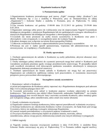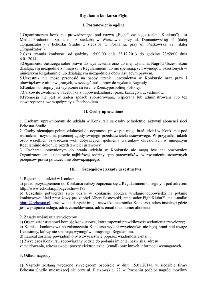 Regulamin konkursu Fight I. Postanowienia ogólne 1.Organizatorem konkursu prowadzonego pod nazwą „Fight” zwanego (dalej „Konkurs”) jest Media Production Sp. z o.o z siedzibą w Warszawie, przy ul. Domaniewskiej 41 (dalej „Organizator”) i Echostar Studio z siedzibą w Poznaniu, przy ul. Piątkowska 72. (dalej „Organizator”) 2.Czas trwania konkursu: od godziny 15:00:00 dnia 23.12.2013 do godziny 23:59:00 dnia 6.01.2014. 3.Organizator zastrzega sobie prawo do wykluczenia oraz do nieprzyznania Nagród Uczestnikom działającym niezgodnie z niniejszym Regulaminem lub nie spełniających wymogów określonych w niniejszym Regulaminie lub działającym niezgodnie z obowiązującym prawem. 5.Uczestnik nie może przenosić na osoby trzecie uczestnictwa w Konkursie oraz praw i obowiązków z nim związanych, w szczególności praw do wydania Nagrody. 6.Konkurs dostępny jest wyłącznie na terenie Rzeczypospolitej Polskiej. 7.Całkowite zwolnienie Facebooka z odpowiedzialności przez każdego z uczestników. 8.Promocja nie jest w żaden sposób sponsorowana, wspierana lub administrowana lub też stowarzyszona we współpracy z Facebookiem. II. Osoby uprawnione 1. Osobami uprawnionymi do udziału w Konkursie są osoby pełnoletnie, aktywni abonenci sieci Echostar Studio. 2. Osoby niemające pełnej zdolności do czynności prawnych mogą brać udział w Konkursie pod warunkiem uzyskania pisemnej zgody swojego przedstawiciela ustawowego. W przypadku takich osób wszelkich oświadczeń woli dotyczących spełnienia warunków określonych w niniejszym Regulaminie dokonuje przedstawiciel ustawowy. 3. Osobami uprawnionym do brania udziału w Konkursie nie mogą być ani pracownicy Organizatora ani członkowie najbliższej rodziny tych pracowników, w rozumieniu stosownych przepisów prawa powszechnie obowiązującego. III. Szczegółowe zasady uczestnictwa 1. Rejestracja i udział w Konkursie a) przed przystąpieniem do Konkursu należy zapoznać się z Regulaminem dostępnym pod adresem http://www.echostar.pl/pages/show/187 b) Uczestnik potwierdza swój udział w konkursie poprzez wysłanie odpowiedzi na pytanie konkursowe: "Jaki prestiżowy pas zdobył Albert Sosnowski, ambasador FightKlubu?" na e-maila: [email protected] oraz swoich danych: imię i nazwisko uczestnika Konkursu, adres instalacji gdzie jest wykupiona usługa, adres zameldowania, adres email oraz numer abonenta 2. Zasady wyłaniania zwycięzców a) Organizator ustanowi komisję konkursową, która zapewni prawidłowość wyłonienia zwycięzcy; c) Komisja konkursowa po zakończeniu Konkursu wyłoni zwycięzców, nie będą brani pod uwagę Uczestnicy, którzy nie spełniają wymogów niniejszego Regulaminu. d) Laureat zostanie powiadomiony o zwycięstwie poprzez wiadomość e-mail.; e) Zwycięzca Konkursu zobowiązany będzie do podania imienia, nazwiska, adresu zameldowania, adresu swojej poczty elektronicznej (email) oraz innych informacji wymaganych. 3. Odbiór nagrody a) Nagrody zostaną wręczone zwycięzcom osobiście w dniu 15.01.2014r. w siedzibie firmy Echostar Studio mieszczącej się przy ul. Piątkowskiej 72 w Poznaniu (odbiór nagród możliwy będzie w godzinach od 9:00 do 16:00). b) Organizator nie ponosi odpowiedzialności za brak możliwości wydania Uczestnikowi nagrody z przyczyn leżących po stronie Uczestnika, a w szczególności z powodu nie odebrania wiadomości mailowej z informacją o wygranej przed terminem wydania nagrody. c) Uczestnik potwierdza odbiór nagrody własnoręcznym podpisem na protokole odbioru nagrody. e) Nagrody rzeczowe nie mogą być zamieniane na ekwiwalent pieniężny; f) Wszelkie roszczenia z tytułu gwarancji czy rękojmi należy kierować do producentów lub autoryzowanych dystrybutorów Nagród; g) w przypadku nieodebrania przez Zwycięzców Nagrody w wyznaczonym terminie Nagroda przechodzi do dyspozycji Organizatora. IV. Nagrody W konkursie przewidziano następujące nagrody: 1 miejsce- duża rękawica z autografem + karta 2 miejsce- koszulka + karta z autografem 3 miejsce- czapka z autografem + karta 4 miejsce (wyróżnienie)- 1 mała rękawica + smycz + karta z autografem 5 miejsce (wyróżnienie)- 1 mała rękawica + brelok + karta z autografem V. Reklamacje 1. Reklamacje, co do niezgodności Konkursu z niniejszym Regulaminem należy zgłaszać pisemnie, listem poleconym na adres korespondencyjny Organizatora: 2. Do rozstrzygania reklamacji powołana jest Komisja Reklamacyjna. Decyzja Komisji co do reklamacji jest ostateczna. 3. Reklamacje można wnosić do czternastu dni po zakończeniu Konkursu. Decyduje data stempla pocztowego. Po upływie tego terminu reklamacje nie będą uwzględniane. 4. Prawidłowo złożona reklamacja powinna zawierać imię, nazwisko, adres pocztowy, nr telefonu komórkowego Uczestnika oraz opis problemu. 5. Organizator dołoży wszelkich starań, aby reklamacje były rozpatrzone w terminie 14(czternastu) dni od ich otrzymania. 6. Uczestnik zostanie powiadomiony o rozpatrzeniu reklamacji listem poleconym. 7.Reklamacje nie zawierające danych wymienionych w pkt. 4 powyżej nie będą rozpatrywane. VI. Postanowienia końcowe 1. Organizator nie ponosi odpowiedzialności za wszelkie nieprawidłowości w zakresie podawania danych wskazanych przez Uczestnika w celu otrzymania Nagrody. 2. Organizator będzie dokonywał weryfikacji danych. 3. Dane osobowe dotyczące Uczestników gromadzone są tylko i wyłącznie w celu doręczenia Nagrody. Po doręczeniu Nagrody dane te zostaną zniszczone i nie będą gromadzone, przetwarzane i przekazywane jakimkolwiek podmiotom trzecim, z wyłączeniem przypadków gdy do ich przechowywania Organizator zobowiązany będzie na podstawie przepisów prawa powszechnie obowiązującego. 4. Organizator zastrzega sobie prawo do dokonania zmian postanowień niniejszego Regulaminu. O zmianie Uczestnicy zostaną poinformowani na stronie: http://www.echostar.pl/pages/show/187 Zmiana wchodzi w życie w ciągu siedmiu dni 