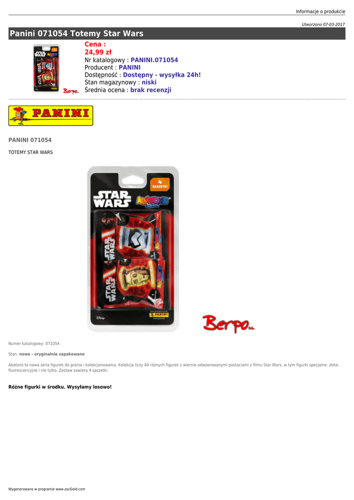 Informacje o produkcie Utworzono 07-03-2017 Panini 071054 Totemy Star Wars Cena : 24,99 zł Nr katalogowy : PANINI.071054 Producent : PANINI Dostępność : Dostępny - wysyłka 24h! Stan magazynowy : niski Średnia ocena : brak recenzji PANINI 071054 TOTEMY STAR WARS Numer katalogowy: 071054 Stan: nowe - oryginalnie zapakowane Abatons to nowa seria figurek do grania i kolekcjonowania. Kolekcja liczy 40 różnych figurek z wiernie odwzorowanymi postaciami z filmu Star Wars, w tym figurki specjalne: złote, fluorescencyjne i nie tylko. Zestaw zawiera 4 saszetki. Różne figurki w środku. Wysyłamy losowo! Wygenerowano w programie www.oscGold.com Dostępność w salonach: Ilość sztuk: Sklep - Złotniki: 1 Sklep - zlikwidowany: 0 Sklep - Szczepankowo: 1