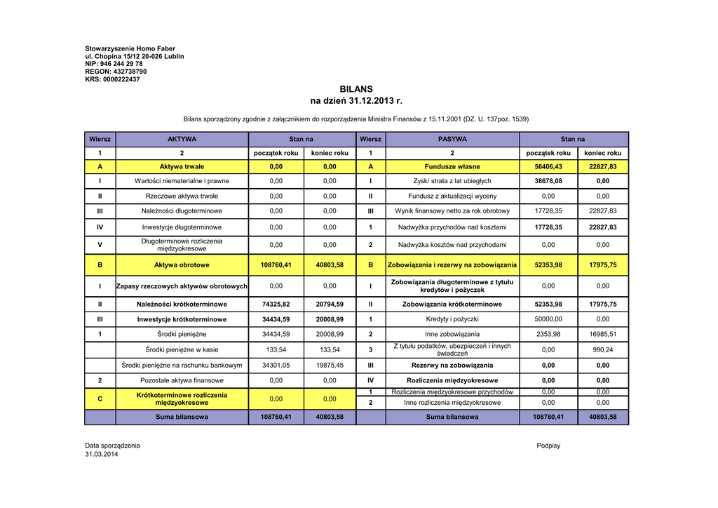 Stowarzyszenie Homo Faber ul. Chopina 15/12 20-026 Lublin NIP: 946 244 29 78 REGON: 432738790 KRS: 0000222437 BILANS na dzień 31.12.2013 r. Bilans sporządzony zgodnie z załącznikiem do rozporządzenia Ministra Finansów z 15.11.2001 (DZ. U. 137poz. 1539) Wiersz AKTYWA Wiersz PASYWA 1 2 początek roku koniec roku 1 2 początek roku koniec roku A Aktywa trwałe 0,00 0,00 A Fundusze własne 56406,43 22827,83 I Wartości niematerialne i prawne 0,00 0,00 I Zysk/ strata z lat ubiegłych 38678,08 0,00 II Rzeczowe aktywa trwałe 0,00 0,00 II Fundusz z aktualizacji wyceny 0,00 0,00 III Należności długoterminowe 0,00 0,00 III Wynik finansowy netto za rok obrotowy 17728,35 22827,83 IV Inwestycje długoterminowe 0,00 0,00 1 Nadwyżka przychodów nad kosztami 17728,35 22827,83 V Długoterminowe rozliczenia międzyokresowe 0,00 0,00 2 Nadwyżka kosztów nad przychodami 0,00 0,00 B Aktywa obrotowe 108760,41 40803,58 B Zobowiązania i rezerwy na zobowiązania 52353,98 17975,75 I Zapasy rzeczowych aktywów obrotowych 0,00 0,00 I Zobowiązania długoterminowe z tytułu kredytów i pożyczek 0,00 0,00 II Należności krótkoterminowe 74325,82 20794,59 II Zobowiązania krótkoterminowe 52353,98 17975,75 III Inwestycje krótkoterminowe 34434,59 20008,99 1 Kredyty i pożyczki 50000,00 0,00 1 Środki pieniężne 34434,59 20008,99 2 Inne zobowiązania 2353,98 16985,51 Środki pieniężne w kasie 133,54 133,54 3 Z tytułu podatków, ubezpieczeń i innych świadczeń 0,00 990,24 Środki pieniężne na rachunku bankowym 34301,05 19875,45 III Rezerwy na zobowiązania 0,00 0,00 Pozostałe aktywa finansowe 0,00 0,00 IV Rozliczenia międzyokresowe 0,00 0,00 1 Rozliczenia międzyokresowe przychodów 0,00 0,00 2 Inne rozliczenia międzyokresowe 0,00 0,00 Suma bilansowa 108760,41 40803,58 2 C Stan na Krótkoterminowe rozliczenia międzyokresowe 0,00 0,00 Suma bilansowa 108760,41 40803,58 Data sporządzenia 31.03.2014 Stan na Podpisy Lublin, dnia 31 marca 2014 roku Stowarzyszenie Homo Faber ul. Chopina 10/15 20-026 Lublin NIP: 946 244 29 78 REGON: 432738790 KRS: 0000222437 Informacja dodatkowa stanowi załącznik do bilansu i rachunku zysków i strat za dany rok obrotowy 2013 i opracowana została na podstawie Rozporządzenia Ministra Finansów z 15 listopada 2001 r. w sprawie szczególnych zasad rachunkowości dla niektórych jednostek niebędących spółkami handlowymi, nieprowadzących działalności gospodarczej. Stowarzyszenie Homo Faber zajmuje się prawami człowieka, kulturą, edukacją działalnością na rzecz społeczności lokalnych. Organami podmiotu są: Walne Zgromadzenie, Zarząd i Organ Kontroli Wewnętrznej. Stowarzyszenie utrzymuje się głównie ze składek członkowskich, darowizn oraz dotacji. Stowarzyszenie nie prowadzi działalności gospodarczej, natomiast od 2009 roku prowadzi odpłatną działalność statutową w zakresie: organizowania konferencji, spotkań, prelekcji, wystaw. Od 2009 roku Stowarzyszenie posiada status organizacji pożytku publicznego. Wszelkie przychody stowarzyszenia są przeznaczane na cele statutowe organizacji. Sprawozdanie finansowe sporządzone zostało za okres od 01.01.2013 do 31.12.2013. RACHUNEK WYNIKÓW STOWARZYSZENIA Przychody Przychody pochodzące ze składek wyniosły w 2013 roku 1040,00 zł, przychody z darowizn wyniosły 7017,08 zł, natomiast przychody z dotacji wyniosły 249 013,20 zł. Stowarzyszenie Homo Faber otrzymało następujące dotacje na realizację projektów: Projekt Wsparcie Integracji Dzieci Uchodźców 2013 (EFU) : 16 955,00 zł Projekt Wsparcie Integracji Dzieci Uchodźców 2012 (EFU) : 55 850,07 zł Projekt Wsparcie Integracji Dzieci Uchodźców (Urząd Miasta Lublin): 3 000,00 zł Projekt „Rozbawione przedszkole” (Urząd Miasta Lublin): 4 000,00 zł Projekt Monitoring funkcjonowania Rady Miasta pod kątem dostępności radnych i przejrzystości ich prac (Fundacja Batory): 38 000,00 zł Projekt Standardy działania III Sektora (WSPA): 55 966,42 zł Projekt „Wsparcie współpracy transgranicznej”z programu RITA: 39 530,00 zł Projekt „Akademia HF” z programu „Młodzież w działaniu”: 15201,71 zł Projekt „Lokalne Międzysektorowe Polityki na rzecz Integracji Imigrantów”: 2400,00 zł Projekt „Obywatele na horyzoncie”: 18 110,00 zł W 2013 roku Stowarzyszenie w ramach odpłatnej działalności statutowej otrzymało środki w wysokości 45 100,00 zł na realizację następujących działań: Urząd Miasta Lublin : 12 400 zł Wielokulturowa Lubelszczyzna : 5 000,00 zł FIM- przeprowadzenia ankiet: 22 700,00 zł UNDP- Wizyta studyjna: 5 000,00 zł Część środków (w kwocie: 10 902,40 zł) zostanie wykorzystane w roku 2013 na kontynuację działań statutowych. W 2013 roku Stowarzyszenie, jako organizacja pożytku publicznego otrzymała przychody z 1% podatku dochodowego od osób fizycznych przekazanego na rzecz organizacji w łącznej wysokości: 2 963,00 zł. Całość środków zostanie wykorzystana w 2014 roku na zorganizowanie wielokulturowej wycieczki po Lubelszczyźnie. W sumie w okresie sprawozdawczym suma przychodów z działalności statutowej wyniosła 305 433,28 zł. Koszty Koszty ewidencjonowane są w układzie kalkulacyjnym. Koszty bezpośrednio związane z realizacją wymienionych projektów wyniosły w bieżącym roku 203 000,48 zł. Koszty administracyjne Stowarzyszenia wyniosły w 2013 roku: 37 628,87 zł i składały się na nie: opłaty bankowe, wynagrodzenia pracowników, koszty wynajmu lokalu i inne koszty bezpośrednio związane z działalnością stowarzyszania. Koszty związane z prowadzeniem działalności statutowej odpłatnej wyniosły: 34 197,60 zł, natomiast koszty finansowe 5 648,68 zł. Koszty wydatków związanych z darowizną 1% wyniosły 2 129,82 zł Nie wystąpiły pozostałe przychody i koszty oraz zdarzenia nadzwyczajne, które mogłyby wpłynąć na wynik finansowy. Wynik finansowy wyniósł 22 827,83 zł. Zysk ten zostanie przeznaczony na działalność statutową stowarz