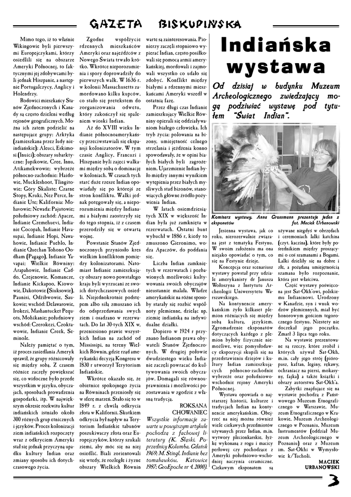 Mimo tego, iż to właśnie Wikingowie byli pierwszy− mi Europejczykami, którzy osiedlili się na obszarze Ameryki Północnej, to fak− tycznymi jej zdobywcami by− li jednak Hiszpanie, a następ− nie Portugalczycy, Anglicy i Holendrzy. Rodowici mieszkańcy Sta− nów Zjednoczonych i Kana− dy są często dzieleni według rejonów geograficznych. Mo− żna ich zatem podzielić na następujące grupy: Arktyka (zamieszkana przez ludy nie− indiańskie): Aleuci, Eskimo− si (Inuici); obszary subarkty− czne: Jupikowie, Cree, Innu, Atikamekwowie; wybrzeże północno−zachodnie: Haido− wie, Muckleshoot, Tlingito− wie; Góry Skaliste: Czarne Stopy, Kruki, Nez Perce, In− dianie Ute; Kalifornia: Mo− havowie; Newada: Pajutowie; południowy zachód: Apacze, Indianie Czemehuevi, India− nie Cocopah, Indianie Hava− supai, Indianie Hopi, Nawa− howie, Indianie Pueblo, In− dianie Quechan Tohono Oo− dham (Pagago), Indianie Ya− vapai; Wielkie Równiny: Arapahowie, Indianie Cad− do, Czejenowie, Komancze, Indianie Kickapoo, Kiowo− wie, Dakotowie (Siuksowie), Paunisi, Odżibwowie, Sau− kowie; wschód: Delawarowie, Irokezi, Mashantucket Pequ− ots, Mohikanie; południowy wschód: Czerokezi, Czokta− wowie, Indianie Creek, Se− minole. Należy pamiętać o tym, iż proces zasiedlania Ameryk sprawił, że grupy różnicowały się między sobą. Z czasem różnice zaczęły powiększać się, co widoczne było przede wszystkim w języku, obycza− jach, sposobach prowadzenia gospodarki, itp. W najwięk− szym okresie rozkwitu kultur indiańskich istniało około 300 różnych grup etnicznych i języków. Proces kolonizacji ziem indiańskich rozpoczęty wraz z odkryciem Ameryki stał się jednak przyczyną upa− dku kultury Indian oraz zmiany sposobu ich dotych− czasowego życia. Zgodne współżycie rdzennych mieszkańców Ameryki oraz najeźdźców z Nowego Świata trwało kró− tko. Wkrótce nieporozumie− nia i spory doprowadziły do pierwszych walk. W 1636 r. w kolonii Massachusetts za− mordowano kilku kupców, co stało się pretekstem do zorganizowania odwetu, który zakończył się spale− niem wioski Indian. Aż do XVIII wieku In− dianie północnoamerykańs− cy przeciwstawiali się ekspa− nsji kolonizatorów. W tym czasie Anglicy, Francuzi i Hiszpanie byli zajęci walka− mi między sobą o dominację w koloniach. W czasach tych starć duże rzesze Indian opo− wiadały się po którejś ze stron konfliktu. Walki jed− nak potęgowały się, a niepo− rozumienia między Indiana− mi a białymi zaostrzyły się do tego stopnia, iż z czasem przerodziły się w otwartą wojnę. Powstanie Stanów Zjed− noczonych przyniosło kres wielkim konfliktom pomię− dzy kolonizatorami. Nato− miast Indianie zamieszkują− cy obszary nowo powstałego kraju byli wyrzucani ze swo− ich dotychczasowych osied− li. Niejednokrotnie podstę− pem albo siłą zmuszano ich do odsprzedawania swych ziem i osadzano w rezerwa− tach. Do lat 30−tych XIX w, przeniesiono prawie wszyst− kich Indian na zachód od Mississipi, na tereny Wiel− kich Równin, gdzie rząd ame− rykański decyzją Kongresu w 1830 r utworzył Terytorium Indiańskie. Wkrótce okazało się, że obietnice spokojnego życia na Równinach przeniosły się w sferę marzeń. Stało się to w 1849 r. z chwilą odkrycia złota w Kalifornii. Skutkiem odkrycia był napływ na Tery− torium Indiańskie tabunów poszukiwaczy złota oraz Eu− ropejczyków, którzy szukali ziemi, aby móc się na niej osiedlić. Biali zorientowali się wtedy, że rozległe i żyzne obszary Wielkich Równin warte są zainteresowania. Pio− nierzy zaczęli stopniowo wy− pierać Indian, często posiłko− wali się pomocą armii amery− kańskiej, mordowali i zajmo− wali wszystko co udało się zdobyć. Konflikt między białymi a rdzennymi miesz− kańcami Ameryki wszedł w ostatnią fazę. Przez długi czas Indianie zamieszkujący Wielkie Rów− niny opierali się oddziaływa− niom białego człowieka. Ich tryb życia: polowania na bi− zony, umiejętność celnego strzelania i jeżdżenia konno spowodawały, że w opini bia− łych białych byli zagroże− niem. Ujarzmienie Indian by− ło między innymi wynikiem wytępienia przez białych my− śliwych stad bizonów, stano− wiących główne źródło poży− wienia Indian. W latach osiemdziesią− tych XIX w większość In− dian była już zamknięta w rezerwatach. Ostatni bunt wybuchł w 1886 r, kiedy to zmuszono Gieronimo, wo− dza Apaczów, do poddania się. Liczba Indian zamknię− tych w rezerwatach i pozba− wionych możliwości kulty− wowania swoich obyczajów nieustannie malała. Władze amerykańskie na różne sposo− by starały się rozbić wspól− noty plemienne, dzieląc np. ziemię indiańską na indywi− dualne działki. Dopiero w 1924 r przy− znano Indianom prawa oby− wateli Stanów Zjednoczo− nych. W drugiej połowie dwudziestego wieku India− nie zaczęli powracać do kul− tywowania swoich obycza− jów. Domagali się równou− prawnienia i możliwości po− zostawania w zgodzie z wła− sną tradycją. ROKSANA CHOWANIEC Wszystkie informacje za− warte w powyższym artykule pochodzą z fachowej li− teratury (K. Śląski, Po− przednicy Kolumba, Gdańsk 1969; M. Stingl, Indianie bez tomahawków, Katowice 1987; GeoEpoche nr 4, 2000). Indiańska wystawa Od dzisiaj w budynku Muzeum Archeologicznego zwiedzający mo− gą podziwiać wystawę pod tytu− łem “Świat Indian”. Komisarz wystawy, Anna Grossmann prezentuje jeden z fot. Maciek Urbanowski eksponatów Jesienna wystawa, jak co roku, nierozerwalnie związa− na jest z tematyką Festynu. W swoim założeniu ma ona niejako opowiadać o tym, co się na Festynie dzieje. Koncepcja oraz scenariusz wystawy powstał przy udzia− le amerykanisty dr Janusza Wołoszyna z Instytutu Ar− cheologii Uniwersytetu Wa− rszawskiego. Na kontyne