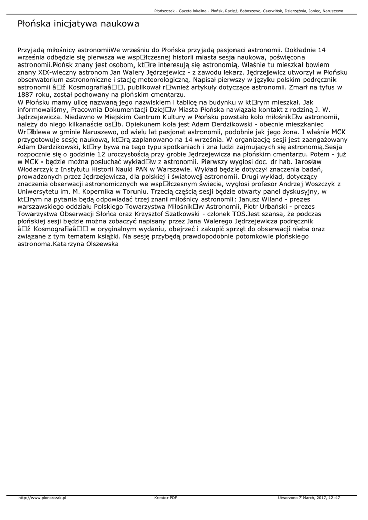 Płońszczak - Gazeta lokalna - Płońsk, Raciąż, Baboszewo, Czerwińsk, Dzierzążnia, Joniec, Naruszewo Płońska inicjatywa naukowa Przyjadą miłośnicy astronomiiWe wrześniu do Płońska przyjadą pasjonaci astronomii. Dokładnie 14 września odbędzie się pierwsza we wspÃłłczesnej historii miasta sesja naukowa, poświęcona astronomii.Płońsk znany jest osobom, ktÃłre interesują się astronomią. Właśnie tu mieszkał bowiem znany XIX-wieczny astronom Jan Walery Jędrzejewicz - z zawodu lekarz. Jędrzejewicz utworzył w Płońsku obserwatorium astronomiczne i stację meteorologiczną. Napisał pierwszy w języku polskim podręcznik astronomii „Kosmografia―, publikował rÃłwnież artykuły dotyczące astronomii. Zmarł na tyfus w 1887 roku, został pochowany na płońskim cmentarzu. W Płońsku mamy ulicę nazwaną jego nazwiskiem i tablicę na budynku w ktÃłrym mieszkał. Jak informowaliśmy, Pracownia Dokumentacji DziejÃłw Miasta Płońska nawiązała kontakt z rodziną J. W. Jędrzejewicza. Niedawno w Miejskim Centrum Kultury w Płońsku powstało koło miłośnikÃłw astronomii, należy do niego kilkanaście osÃłb. Opiekunem koła jest Adam Derdzikowski - obecnie mieszkaniec WrÃłblewa w gminie Naruszewo, od wielu lat pasjonat astronomii, podobnie jak jego żona. I właśnie MCK przygotowuje sesję naukową, ktÃłrą zaplanowano na 14 września. W organizację sesji jest zaangażowany Adam Derdzikowski, ktÃłry bywa na tego typu spotkaniach i zna ludzi zajmujących się astronomią.Sesja rozpocznie się o godzinie 12 uroczystością przy grobie Jędrzejewicza na płońskim cmentarzu. Potem - już w MCK - będzie można posłuchać wykładÃłw z astronomii. Pierwszy wygłosi doc. dr hab. Jarosław Włodarczyk z Instytutu Historii Nauki PAN w Warszawie. Wykład będzie dotyczył znaczenia badań, prowadzonych przez Jędrzejewicza, dla polskiej i światowej astronomii. Drugi wykład, dotyczący znaczenia obserwacji astronomicznych we wspÃłłczesnym świecie, wygłosi profesor Andrzej Woszczyk z Uniwersytetu im. M. Kopernika w Toruniu. Trzecią częścią sesji będzie otwarty panel dyskusyjny, w ktÃłrym na pytania będą odpowiadać trzej znani miłośnicy astronomii: Janusz Wiland - prezes warszawskiego oddziału Polskiego Towarzystwa MiłośnikÃłw Astronomii, Piotr Urbański - prezes Towarzystwa Obserwacji Słońca oraz Krzysztof Szatkowski - członek TOS.Jest szansa, że podczas płońskiej sesji będzie można zobaczyć napisany przez Jana Walerego Jędrzejewicza podręcznik „Kosmografia― w oryginalnym wydaniu, obejrzeć i zakupić sprzęt do obserwacji nieba oraz związane z tym tematem książki. Na sesję przybędą prawdopodobnie potomkowie płońskiego astronoma.Katarzyna Olszewska http://www.plonszczak.pl Kreator PDF Utworzono 7 March, 2017, 12:47