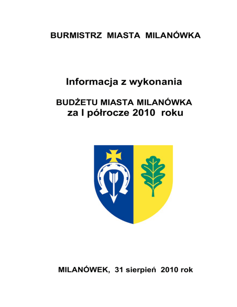 BURMISTRZ MIASTA MILANÓWKA Informacja z wykonania BUDŻETU MIASTA MILANÓWKA za I półrocze 2010 roku MILANÓWEK, 31 sierpień 2010 rok Budżet miasta Milanówka na rok 2010 został uchwalony przez Radę Miasta w Milanówku w dniu 27 stycznia 2010 roku. Plan po zmianach wg stanu na dzień 30 czerwca 2010 roku po stronie dochodów zamknął się kwotą 47 646 697,15 zł, w tym dochody bieżące 45 172 875,15 zł i dochody majątkowe 2 473 822,00 zł. Plan po zmianach wg stanu na dzień 30 czerwca 2010 roku po stronie wydatków zamknął się kwotą 56 313 457,15 zł, w tym wydatki bieżące 37 700 653,15 zł i wydatki majątkowe 18 612 804,00 zł. Przychody budżetu ogółem zaplanowane zostały w wysokości 12 659 552,00 zł (w tym: kredyty i pożyczki 11 296 653,00 zł, wolne środki 1 337 899,00 zł oraz spłata udzielonej w 2008 roku pożyczki dla Ochotniczej Straży Pożarnej 25 000,00 zł), natomiast na rozchody – spłaty rat kapitałowych kredytów i pożyczek zaciągniętych w latach poprzednich przeznaczono kwotę 3 992 792,00 zł. Planowany deficyt czyli różnica pomiędzy planowanymi wydatkami a planowanymi dochodami budżetu wynosi 8 666 760,00 zł. Plan budżetu miasta na dzień 30.06.2010 roku wynosi po stronie dochodów 47 646 697,15 zł i został zrealizowany w kwocie 21 720 302,18 zł tj. w 45,6 %. Plan wydatków na dzień 30.06.2010 roku wynosi 56 313 457,15 zł, z czego wydatkowano 22 337 980,58 zł, co stanowi 39,7 % realizacji planu. Wykonanie deficytu za I półrocze stanowi kwotę 617 678,48 zł. Plan przychodów budżetu miasta na 30.06.2010 roku wynosi 12 659 552,00 zł. Wykonanie planu wyniosło 4 094 320,85 zł. Składają się na to zaciągnięte kredyty w wysokości 2 756 421,13 zł na pokrycie przejściowego deficytu oraz kwota wolnych środków jako nadwyżki środków pieniężnych na rachunku bankowym wynikających z rozliczeń wyemitowanych papierów wartościowych, kredytów i pożyczek z lat ubiegłych w wysokości 1 337 899,72 zł. Plan rozchodów wynosi 3 992 792,00 zł. W trakcie I półrocza 2010 roku spłacono raty pożyczek i kredytów w wysokości 1 966 025,16 zł. Zadłużenie na dzień 30 czerwca 2010 roku wynosi 20 507 766,26 zł, w tym kredyty i pożyczki długoterminowe w kwocie 17 751 345,13 zł oraz kredyt krótkoterminowy w rachunku obrotowym 2 756 421,13 zł. REALIZACJA WYDATKÓW BUDŻETOWYCH ZA I PÓŁROCZE 2010 ROKU Wydatki miasta Milanówka w I półroczu 2010 roku według działów zawiera poniższe zestawienie: Wyszczególnienie 1 Ogółem, z tego: Rolnictwo i łowiectwo Przetwórstwo przemysłowe Wytwarzanie i zaopatrywanie w energię elektryczną, gaz i wodę Transport i łączność Gospodarka mieszkaniowa Działalność usługowa Plan Wykonanie (po zmianach) Wskaźnik Struktura (3:2) zł 2 % 3 4 56 313 457,15 22 337 980,58 5 39,7 100,0 37 000,00 12 417,00 1 951,76 0,00 5,3 0,0 0,0 0,0 265 500,00 35 951,76 13,5 0,2 2 654 711,00 658 875,32 24,8 2,9 2 821 213,00 960 872,52 34,1 4,3 239 000,00 20 796,00 8,7 0,1 7 485 944,00 3 725 310,26 49,8 16,7 26 246,00 14 151,05 53,9 0,1 1 560 016,00 731 209,16 46,9 3,3 158 826,00 83 699,67 52,7 0,4 Obsługa długu publicznego 737 899,00 373 551,73 50,6 1,6 Różne rozliczenia 733 894,00 335 793,00 45,8 1,5 17 111 958,00 9 842 657,37 57,5 44,0 Ochrona zdrowia 443 210,00 124 288,89 28,0 0,5 Pomoc społeczna 5 707 004,39 2 940 312,38 51,5 13,2 142 386,76 0,00 0,0 0,0 458 664,00 240 203,46 52,4 1,1 12 168 161,00 1 182 570,22 9,7 5,3 3 127 550,00 870 966,12 27,8 3,9 35 000,00 0,00 0,0 0,0 386 857,00 194 819,91 50,4 0,9 Administracja publiczna Urzędy naczelnych organów władzy państwowej, kontroli i ochrony prawa oraz sądownictwa Bezpieczeństwo publiczne i ochrona przeciwpożarowa Dochody od osób prawnych, od osób fizycznych i od innych jednostek nie posiadających osobowości prawnej oraz wydatki związane z ich poborem Oświata i wychowanie Pozostałe zadania w zakresie polityki społecznej Edukacyjna opieka wychowawcza Gospodarka komunalna i ochrona środowiska Kultura i ochrona dziedzictwa narodowego Ogrody botaniczne i zoologiczne oraz naturalne obiekty chronionej przyrody Kultura fizyczna i sport Wyszczególnienie Plan (po zmianach) 1 2 Wykonanie Wskaźnik Struktura (3:2) zł % 3 4 5 WYDATKI OGÓŁEM, z tego: 56 313 457,15 22 337 980,58 39,7 100,0 Wydatki bieżące, w tym: Wynagrodzenia i pochodne, z tego: - wynagrodzenia osobowe 37 700 653,15 18 796 555,74 16 858 459,28 8 561 808,14 49,9 50,8 84,1 45,6 14 386 470,00 7 376 706,52 51,3 39,2 - pochodne od wynagrodzeń 2 471 989,28 1 185 101,62 47,9 6,4 Dotacje 5 835 903,00 2 954 396,47 50,6 15,7 Wydatki na obsługę długu 737 899,00 373 551,73 51,3 2,0 Pozostałe wydatki bieżące 14 268 391,87 6 906 799,40 48,4 36,7 Wydatki majątkowe, w tym: 18 612 804,00 3 541 424,84 19,0 15,9 - wydatki inwestycyjne - zakupy inwestycyjne - Dotacje celowe z budżetu na finansowanie lub dofinansowanie kosztów realizacji inwestycji i zakupów inwestycyjnych zakładów budżetowych - ZGKiM - Dotacje celowe przekazane do samorządu województwa na inwestycje i zakupy inwestycyjne realizowane na podstawie porozumień (umów) między jednostkami samorządu terytorialnego 15 752 423,00 3 131 243,91 19,9 88,4 2 815 609,00 410 180,93 14,6 11,6 12 000,00 0,00 0 0 32 772,00 0,00 0 0 Realizacja wydatków przedstawia się następująco: - wydatki bieżące wyniosły 18 796 555,74 zł tj. 49,9 % planu wynoszącego 37 700 653,15 zł i stanowiły 84,1 % zrealizowanych wydatków ogółem; - wydatki majątkowe wyniosły 3 541 424,84 zł, co stanowi 19,0 % planu wynoszącego 18 612 804,00 zł. Wydatki majątkowe stanowią 15,9 % wykonanych wydatków ogółem. REALIZACJA WYDATKÓW W RAMACH POSZCZEGÓLNYCH DZIAŁÓW DZIAŁ 010 – ROLNICTWO I ŁOWIECTWO Melioracje wodne Na wydatki realizowane w ramach tego działu z planowanej kwoty 35 000,00 zł wydatkowano 1 537,20 zł, co stanowi 4,4 % planu. W omawianym okresie poniesiono wydatki na: ZADANIA BIEŻĄCE wykonano kon